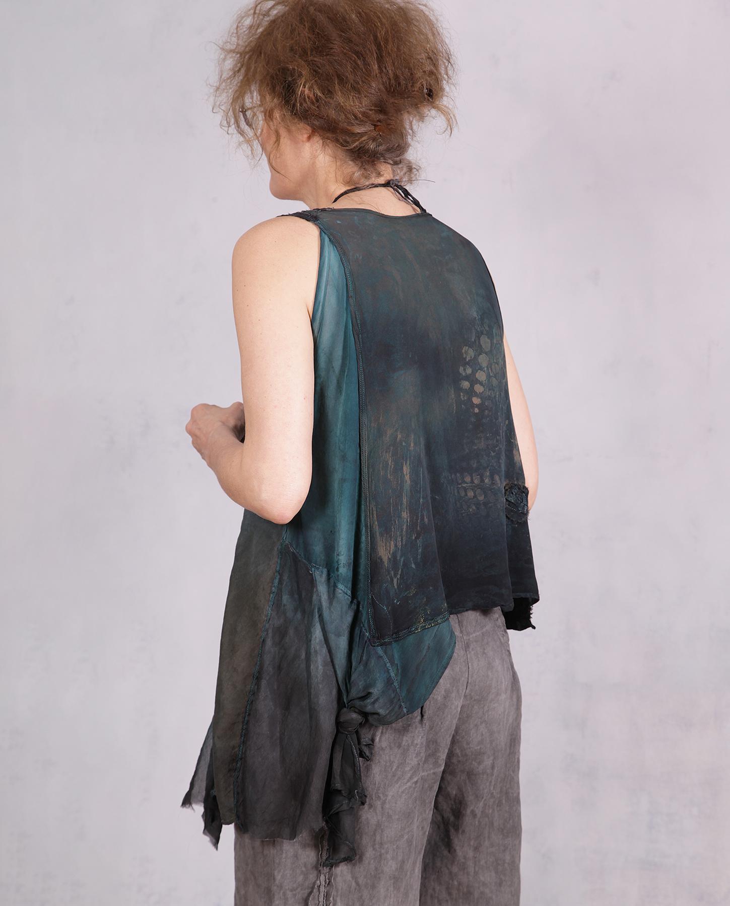This fiber art piece is comfortable, flattering and versatile. You can wear it by itself or as a top layer over angled pieces or dresses. It has asymmetrical construction, mixed silk fabrics - from thicker crepe to semi-sheer georgette for the bottom trim and a subtle and-painted design and detailing, with texture added and a 3D rosette in back. The subdued shades of brown and green make it easy to match to a variety of neutral outfits. Product code: Y5977