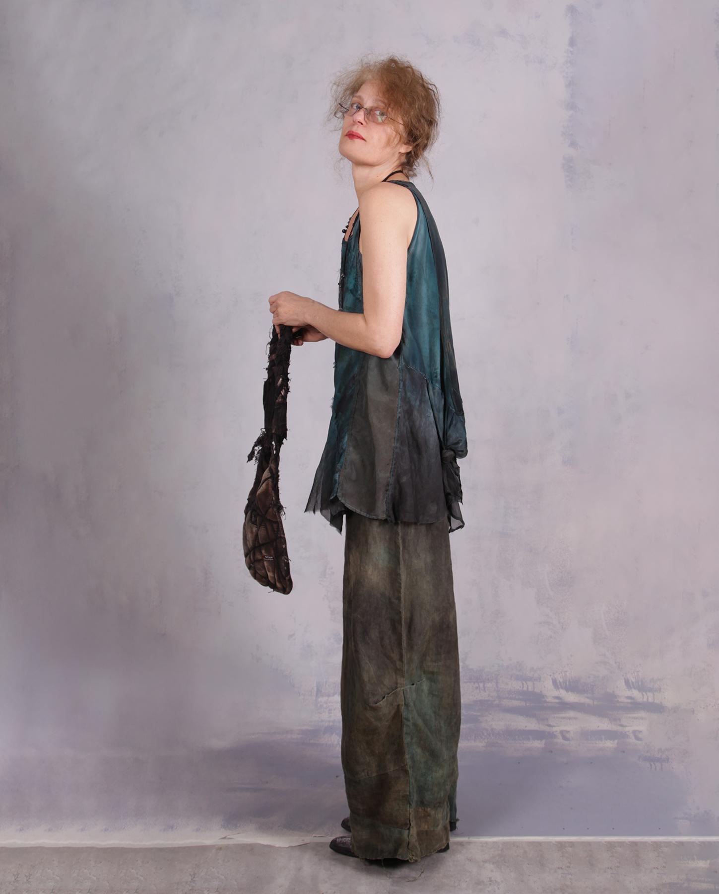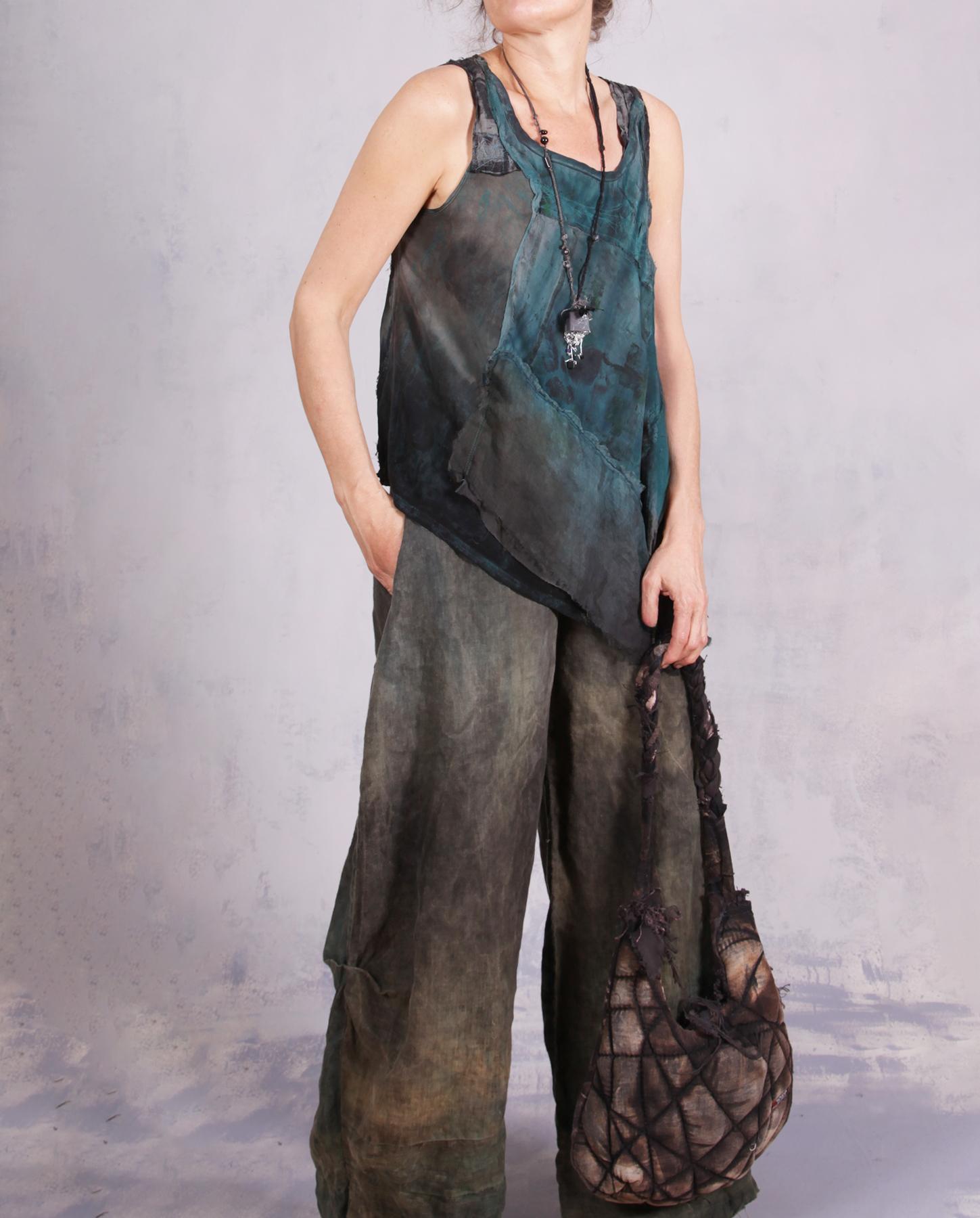 Asymmetrical, A-line, mixed fabrics, raw edging, 3D applique, hand-painted.