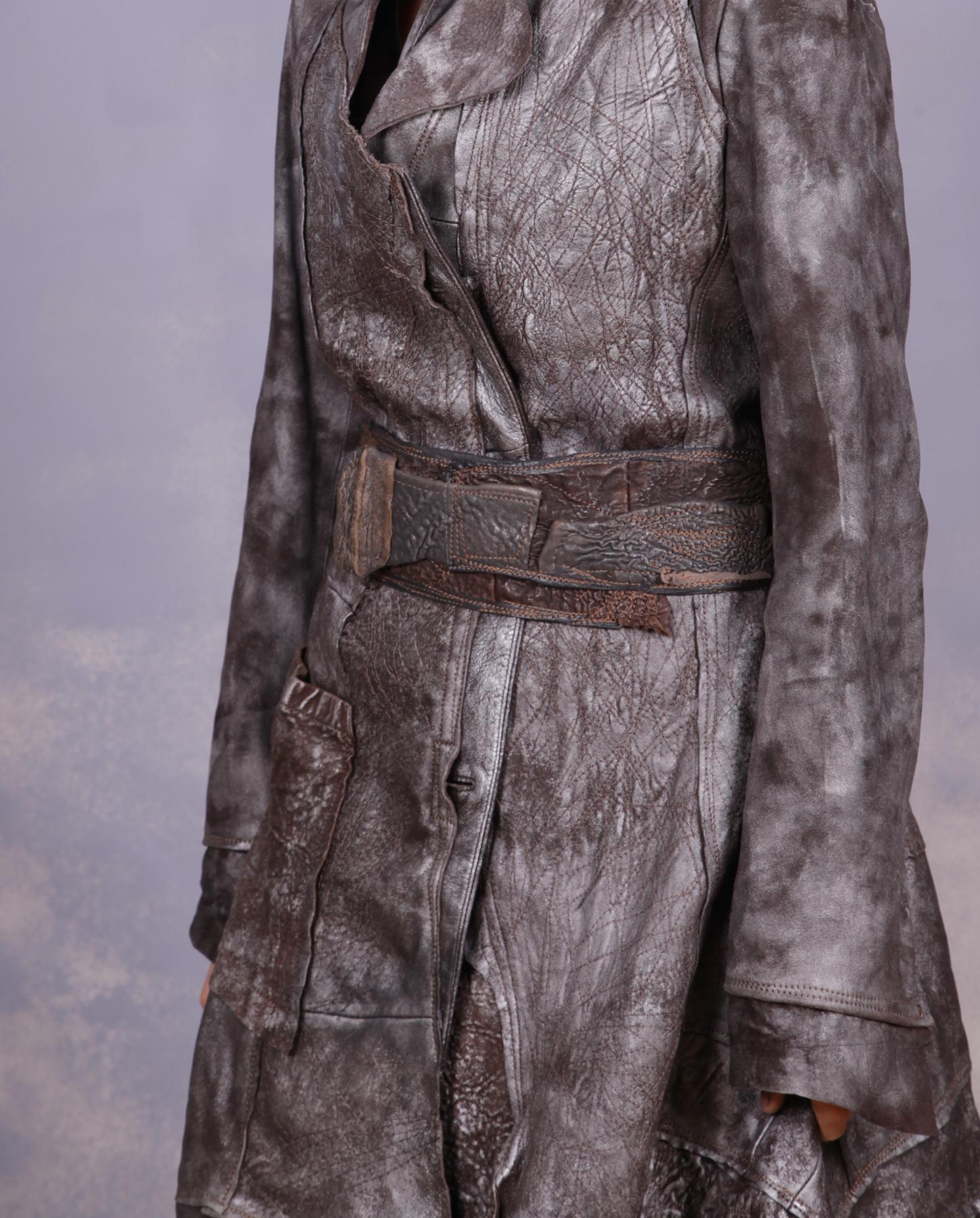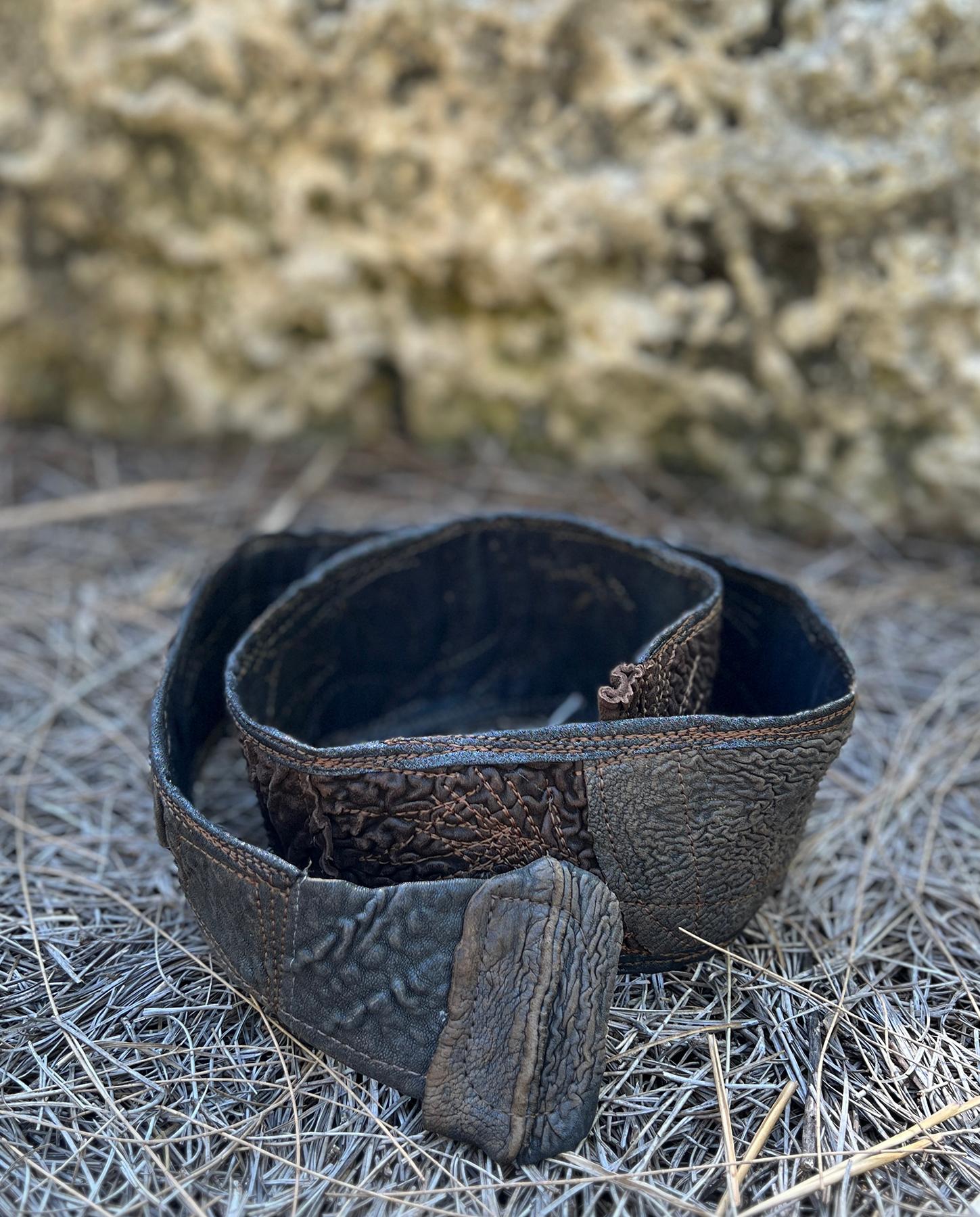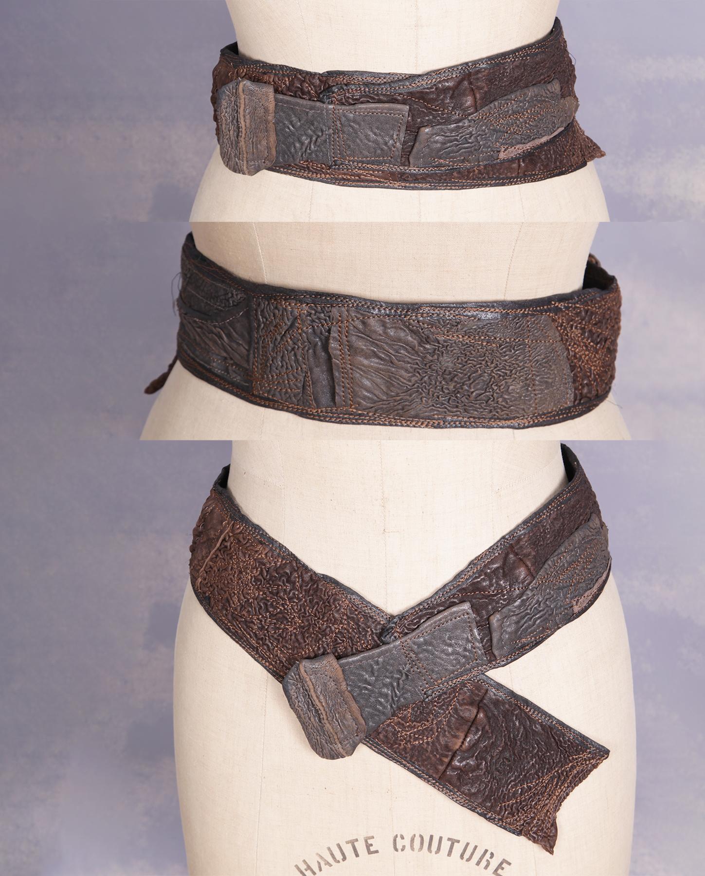 With its groovy surface and deep brown and gray color, the belt really makes you think of the tracks of dried lava after a volcanic eruption! Made out of hand-textured leather with a soft fine silk backing, it has a soft 'buckle' with a snap for closure. The snap hasn't been positioned yet and will be fitted to the desired belt length. A truly wonderful piece to observe in person because of its deep shades and textures, this belt can be worn on the waist or on the hips in many different ways. Real art to wear with a variety of outfits. Product code: C1415