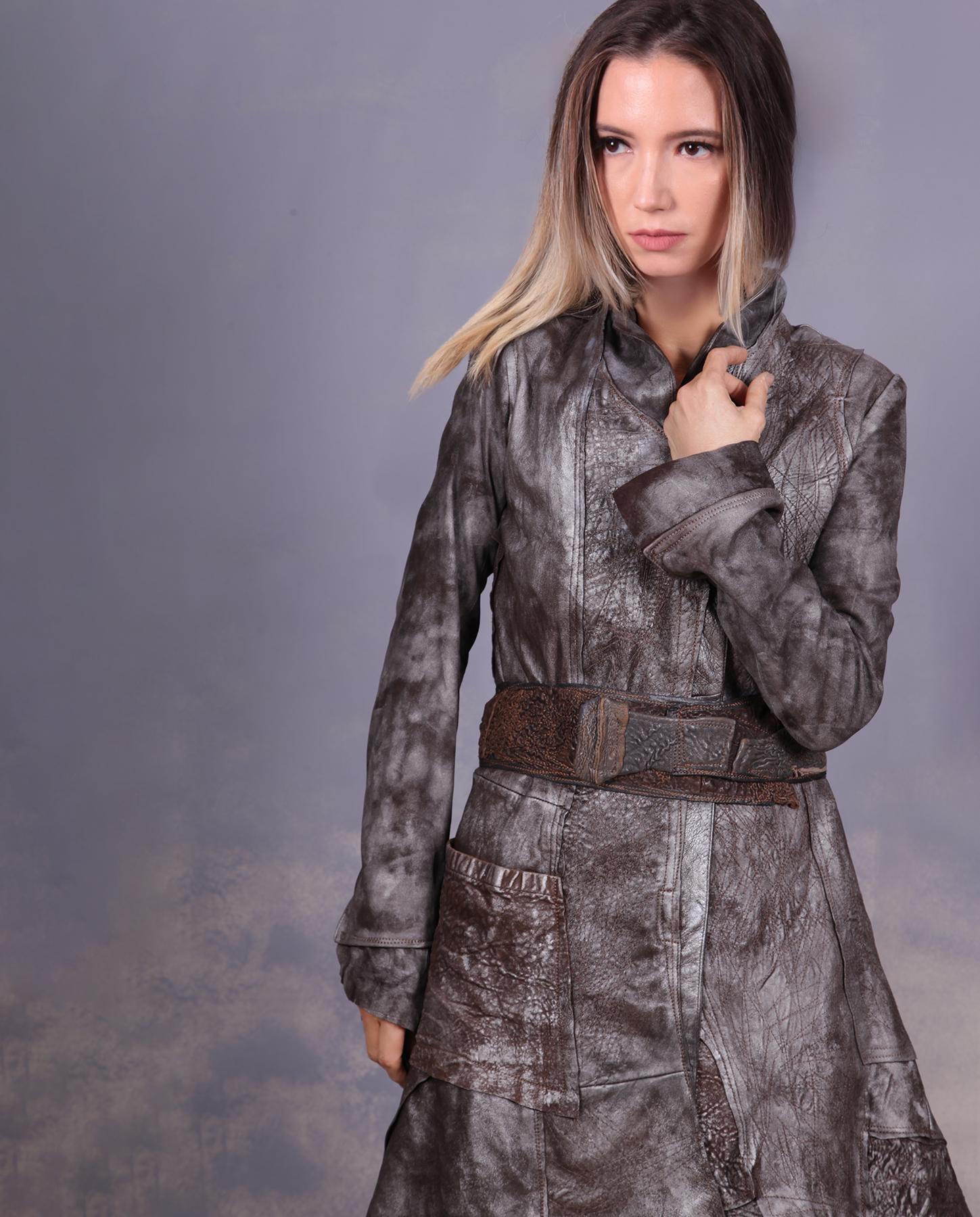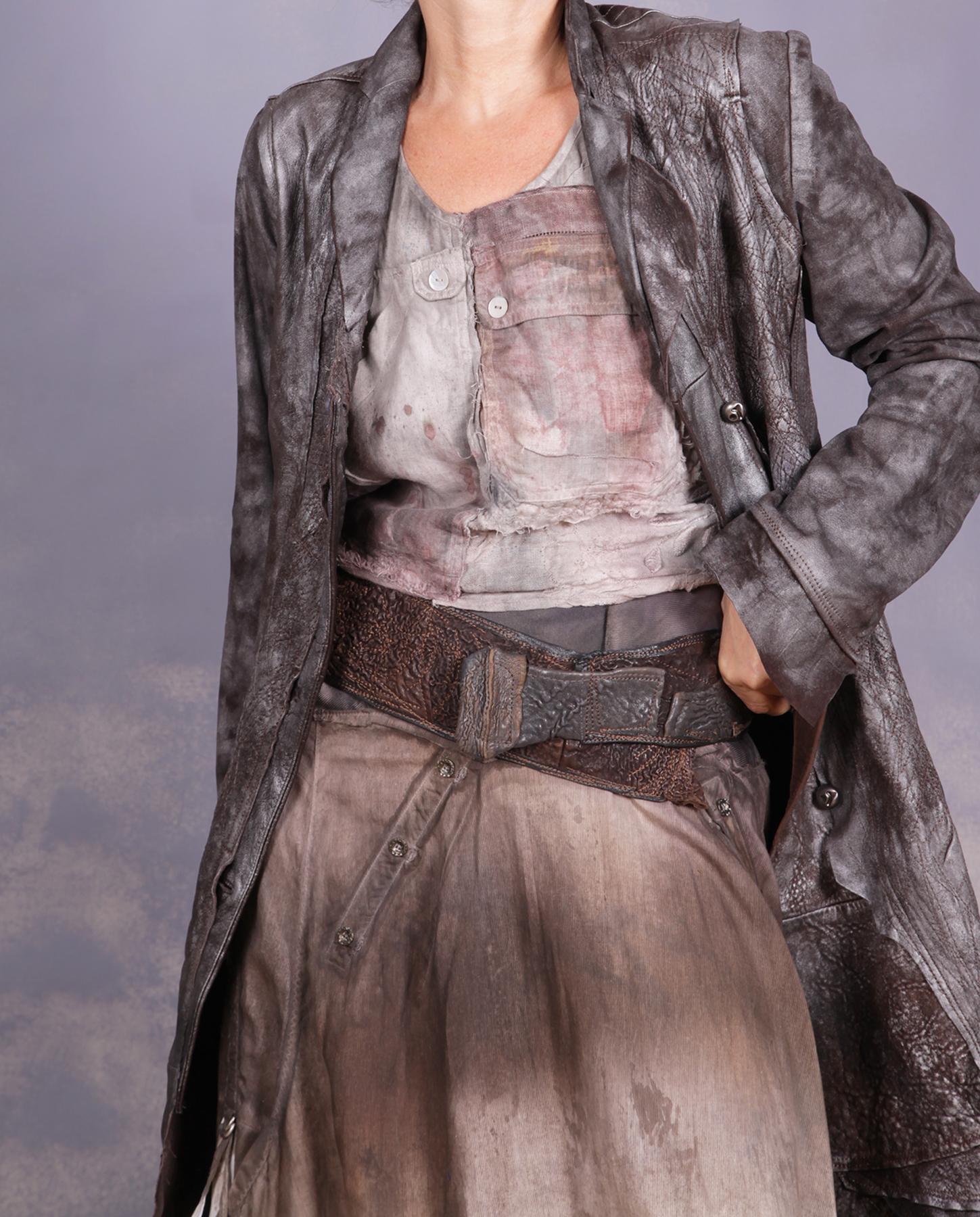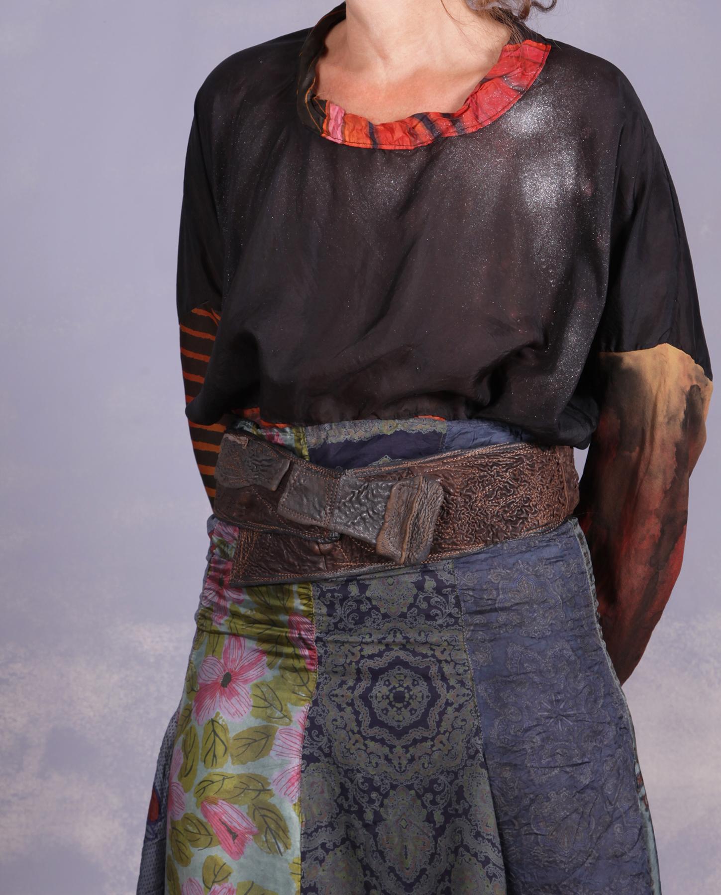 With its groovy surface and deep brown and gray color, the belt really makes you think of the tracks of dried lava after a volcanic eruption! Made out of hand-textured leather with a soft fine silk backing, it has a soft 'buckle' with a snap for closure. The snap hasn't been positioned yet and will be fitted to the desired belt length. A truly wonderful piece to observe in person because of its deep shades and textures, this belt can be worn on the waist or on the hips in many different ways. Real art to wear with a variety of outfits. Product code: C1415