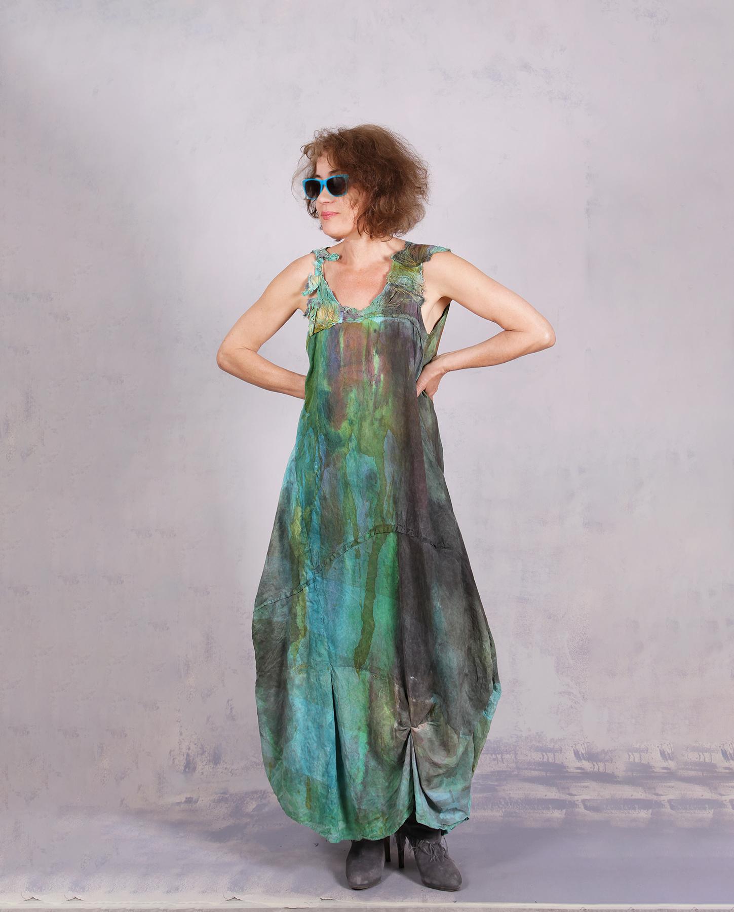It is hard to think about a more pleasant and striking piece to wear throughout the warmer months! Made out of lightweight woven silk, which the artist distressed and painted by hand in dreamy summer hues over aqua base, the dress is super comfortable and features two inside pockets, sculptural neckline and fuller bottom, which moves beautifully as you step it out. Shown on 5'5" models with heels, it can be shortened if necessary at no extra charge, and if you need a little more in the chest area, or a bit more coverage on top, please let us know. Washable, dryable, and perfect for travel! There are a number of jackets to go over it, please inquire if you cannot locate them on the site. Product code: L0136
