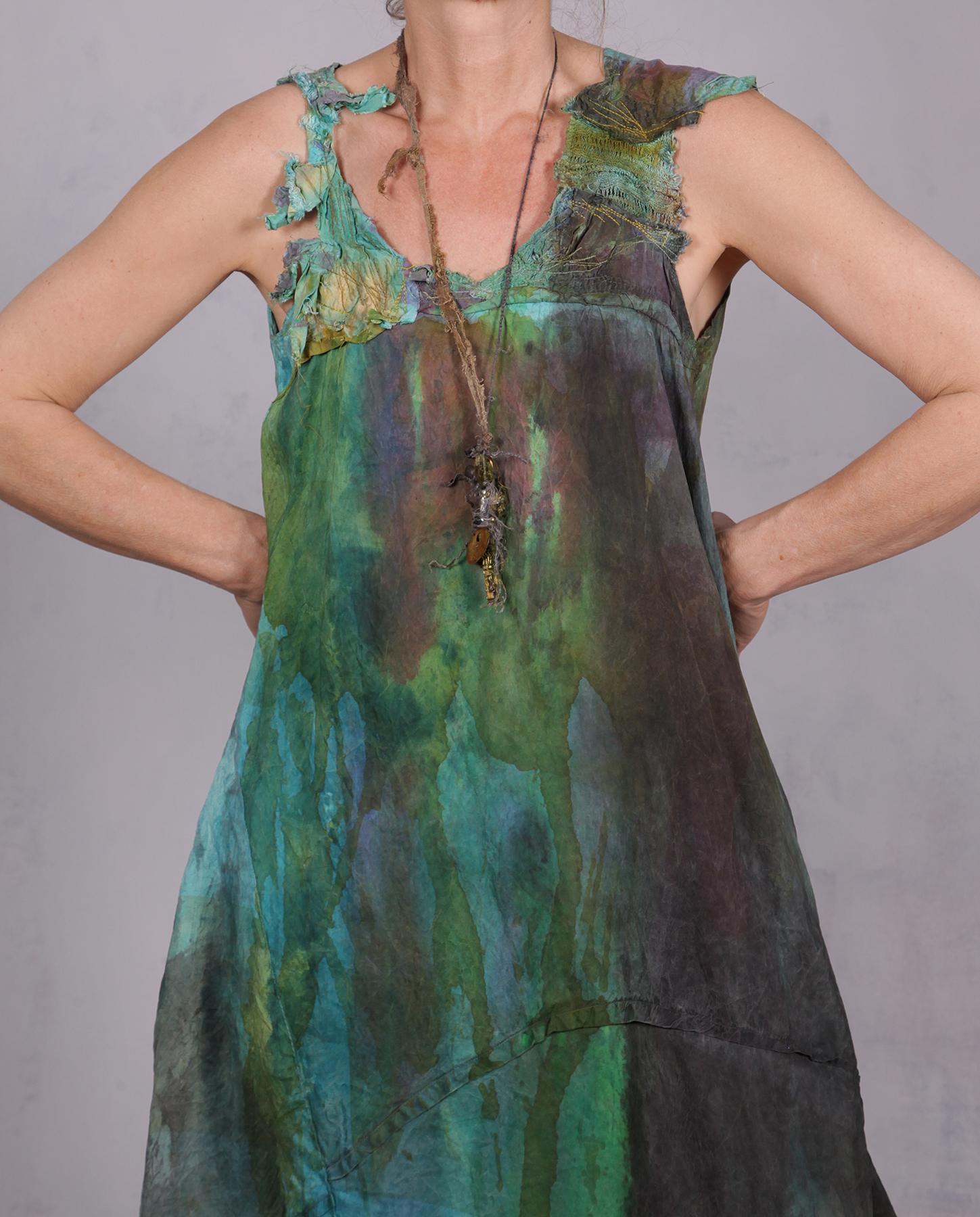 Maxi length, widening toward bottom, sculptural neckline, built-in side pockets, hand-distressed, hand-painted, some raw edging.