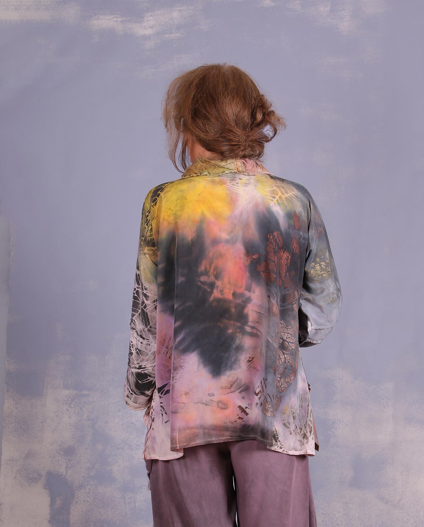 Made out of lightweight silk, this is a comfortable blouse for year-round, to be worn by itself or under jackets. Features an intricate hand-painted design throughout, along with unusual cotton collar and a suede leather trim on the bottom, to add to its 3D look and feel. Easy care (washable) and wrinkle resistant, it is perfect for travel. Product code: L3761