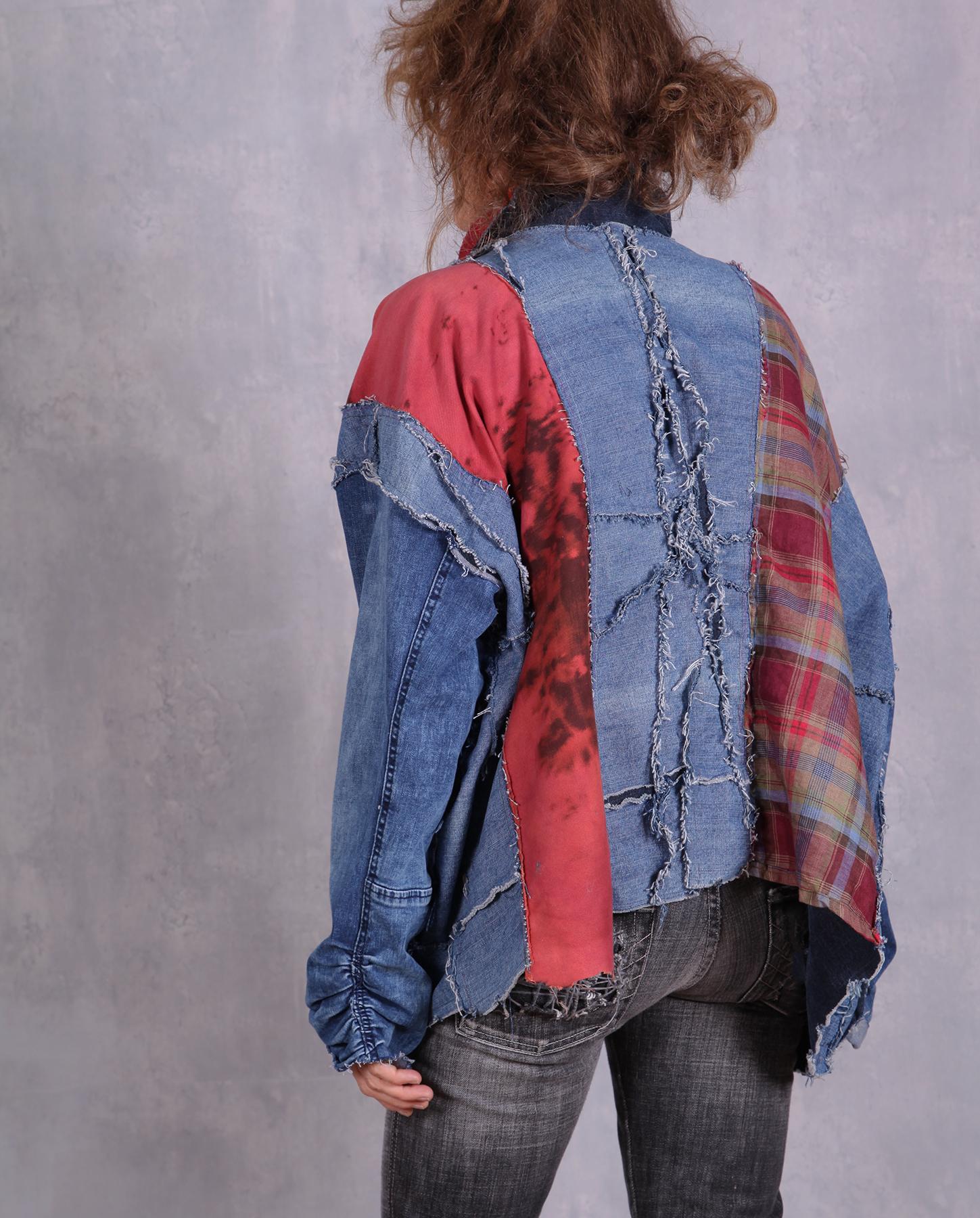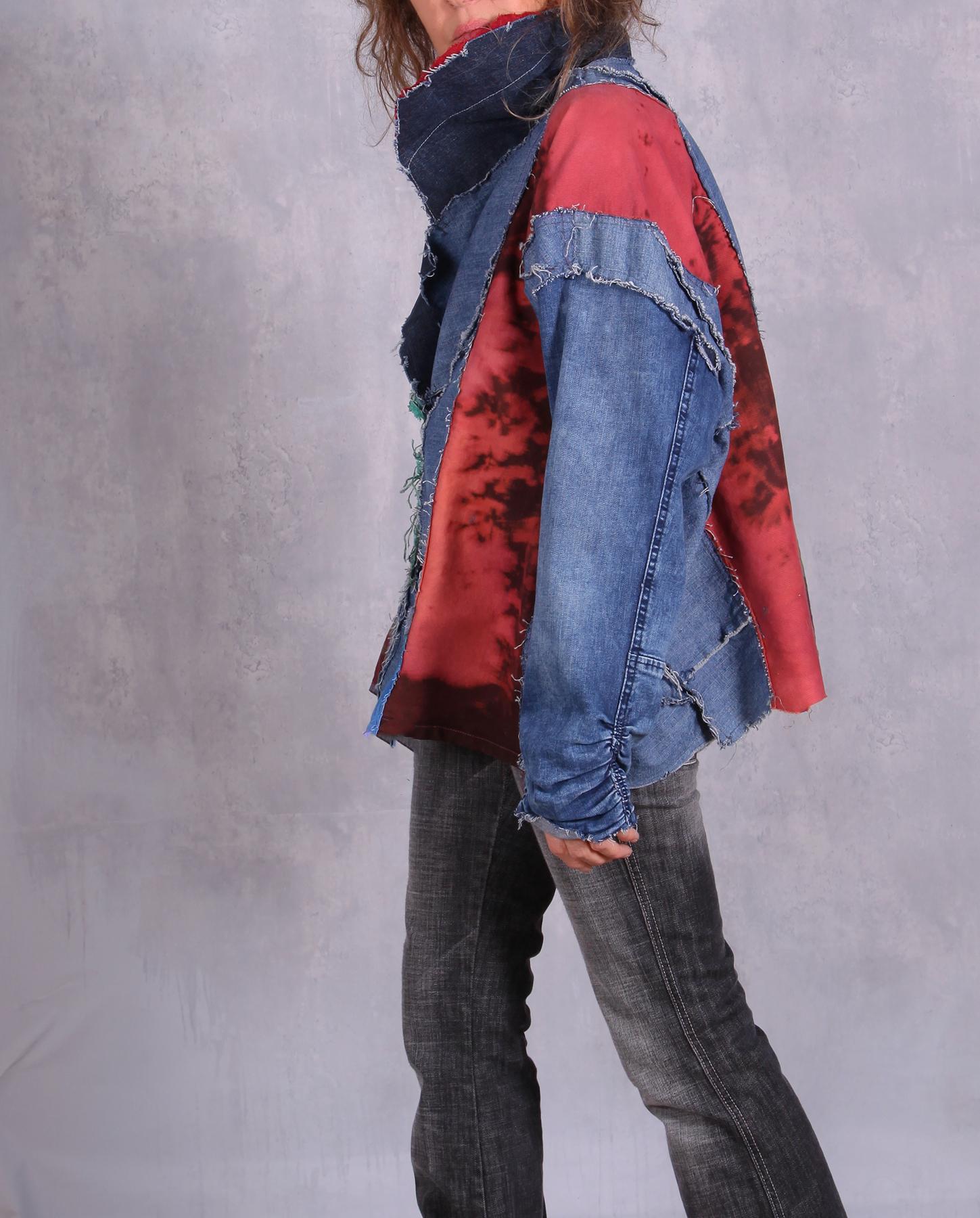 A perfect, creative casual piece for every day - with denim for the base, which is not stiff like most denim jackets, it is a staple in every wardrobe, while the colorful accents make it truly stand out. Comfortable, made as a one-size piece to fit everyone from small (shown) to plus. Try it with boots, long skirts, jeans or just about any other bottom. Product code: G4975