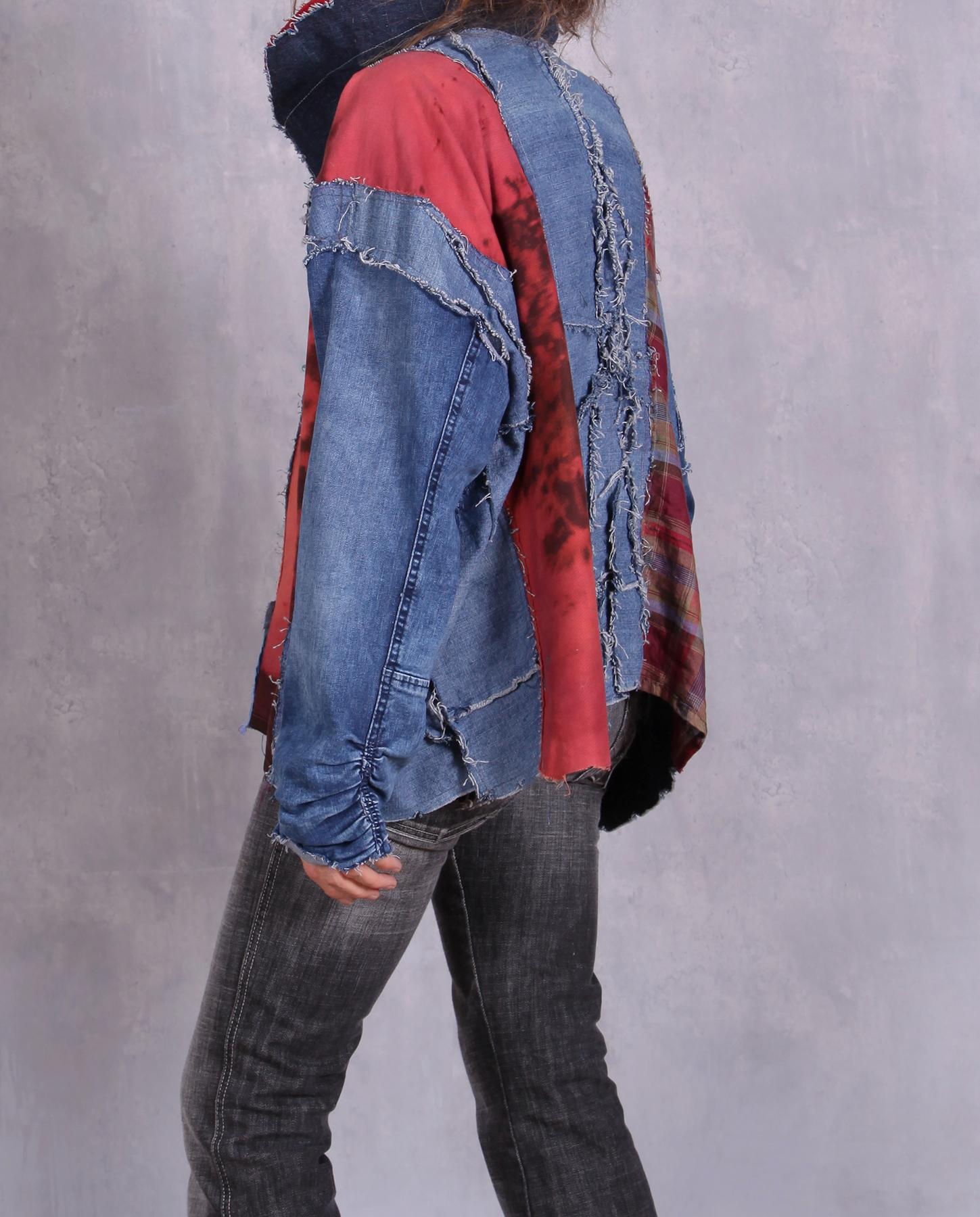 Drop shoulder, oversized design, mixed fabrics, raw edging.