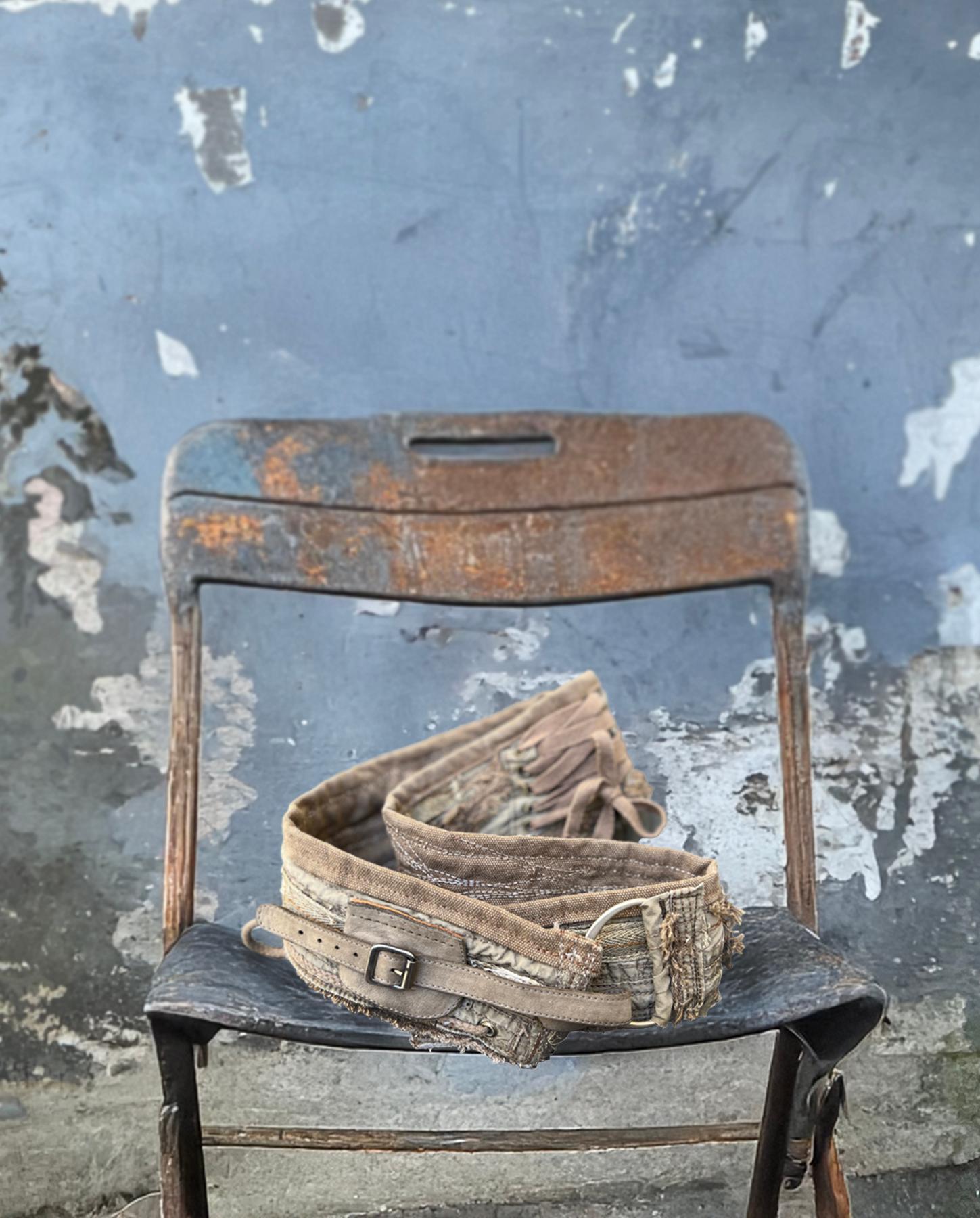Pure fun of a belt, definitely! And very versatile, being of a neutral greenish beige color overall, with mixed shades. This belt can be worn on the hips or on the waist, and is adjustable with the belt strap (we need to know the desired range you require to fix it to those numbers for length for the best look). It has been detailed by hand with the use of all the artist's favorite techniques from overstitching to layering and applique, and of course some raw edging. Lots of different things here to catch your attention, including a laced-up area in the back (not really usable efficiently but look really cool!). A very modern, edgy piece that will elevate your outfits, from casual to dressy. Product code: S3153