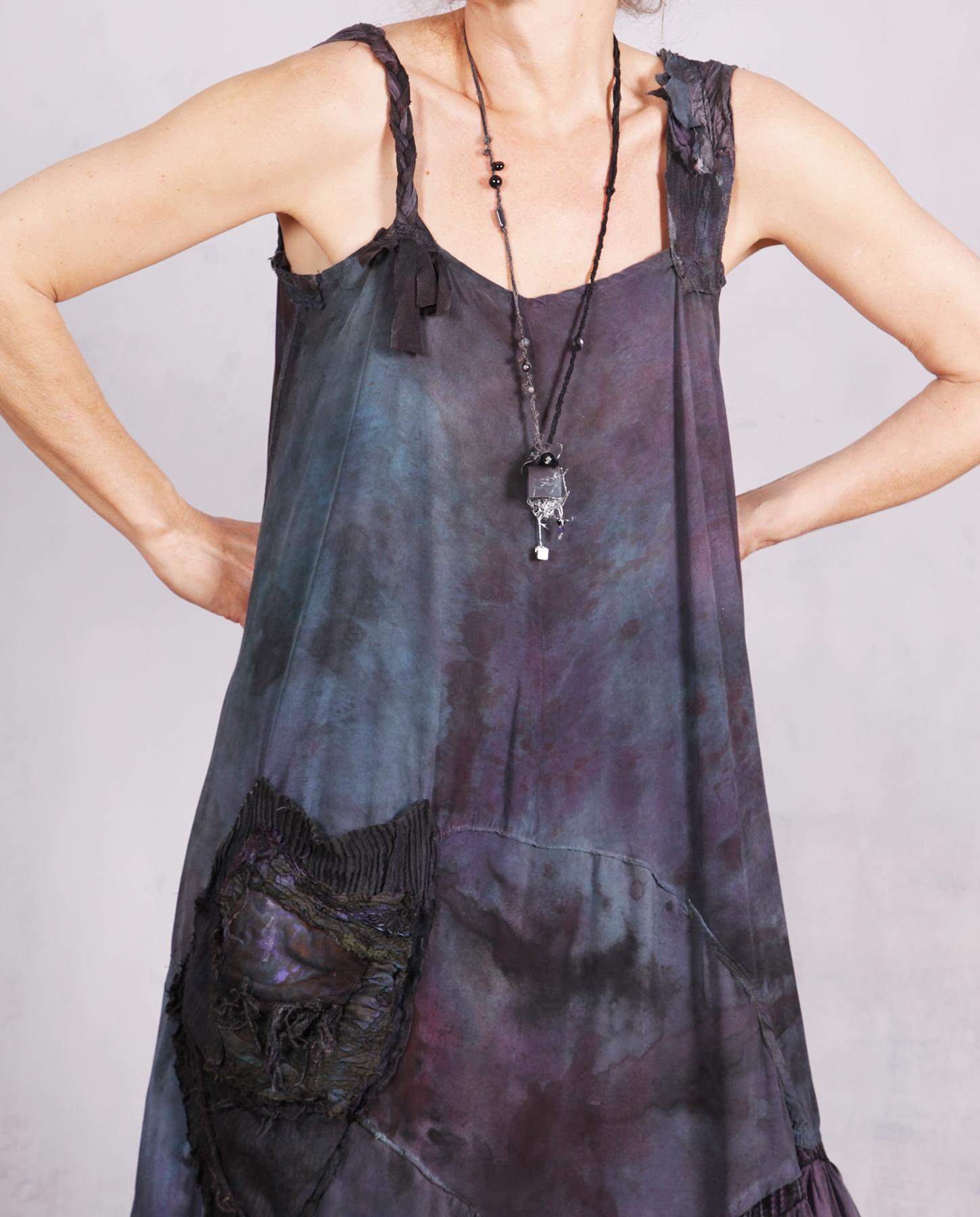 Maxi length, A-line, mixed silks, sculptural straps, applique, hand-painted, large detailed pocket.