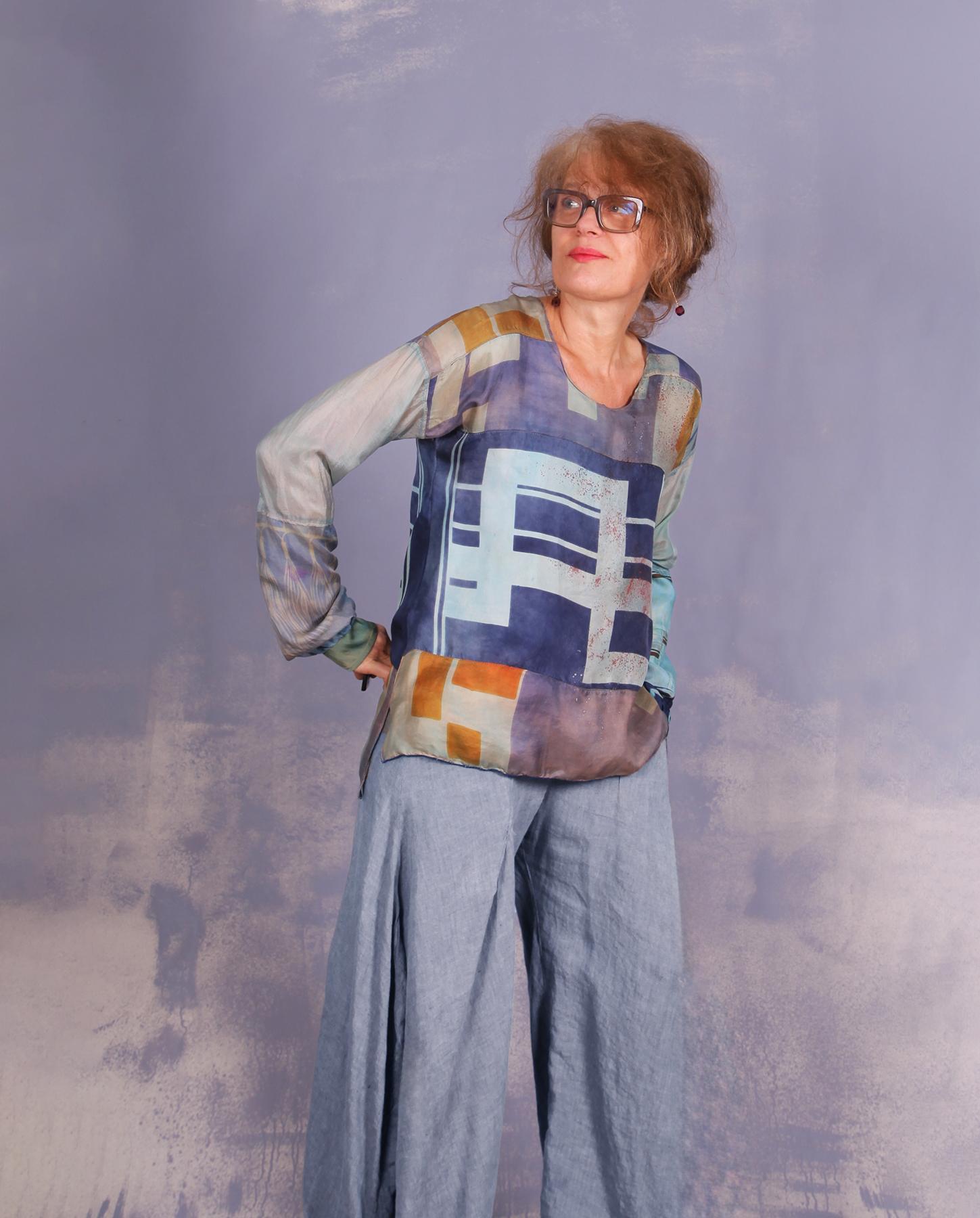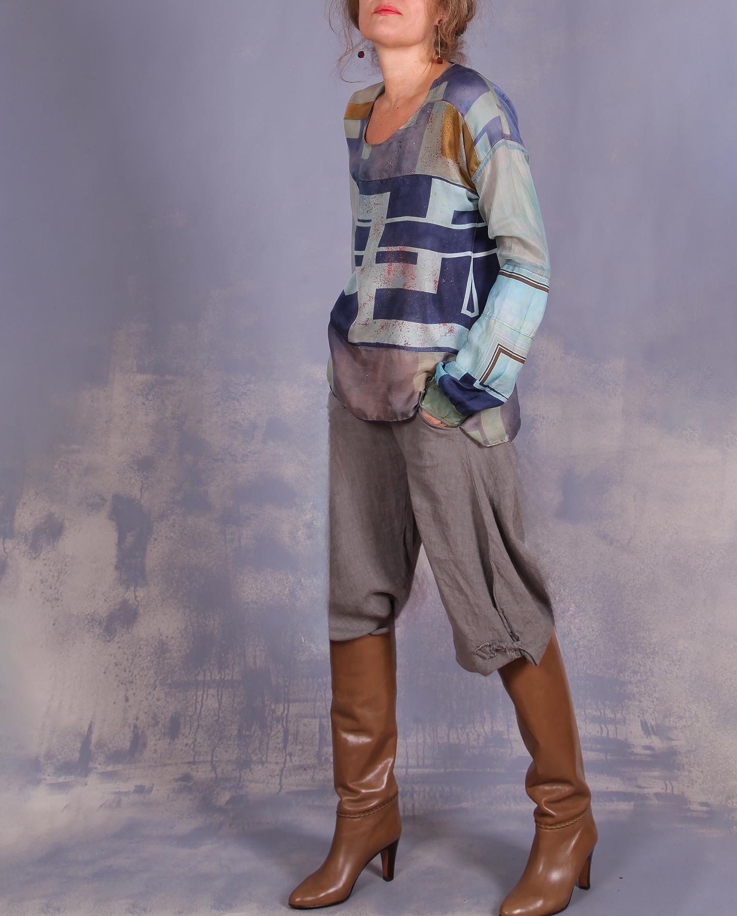From the "Weightless Wonders" collection, featuring totally reworked antique and vintage scarves and graphic silk panels, this blouse is so unique, from the rare patterns, organically combined for one whole, to different textures and subdued, distressed 'vintage' colors to go with the vintage silks it is made out of - different silk scarves from around 60s. Super lightweight, it is on the smaller side, so if you like a more fitted top, this one is for you. It has stretch cuffs on the bottom so it can be pulled up to a shorter sleeve length. Perfect for travel and all of your contemporary outfits. Product code: S8883