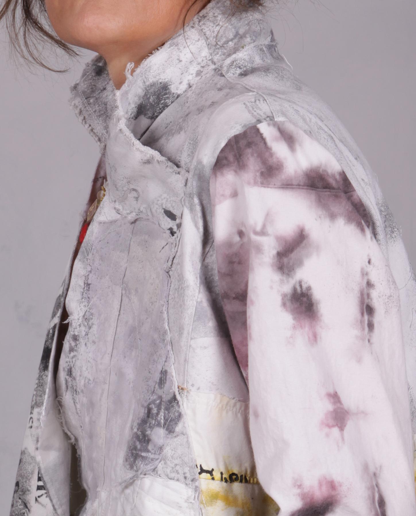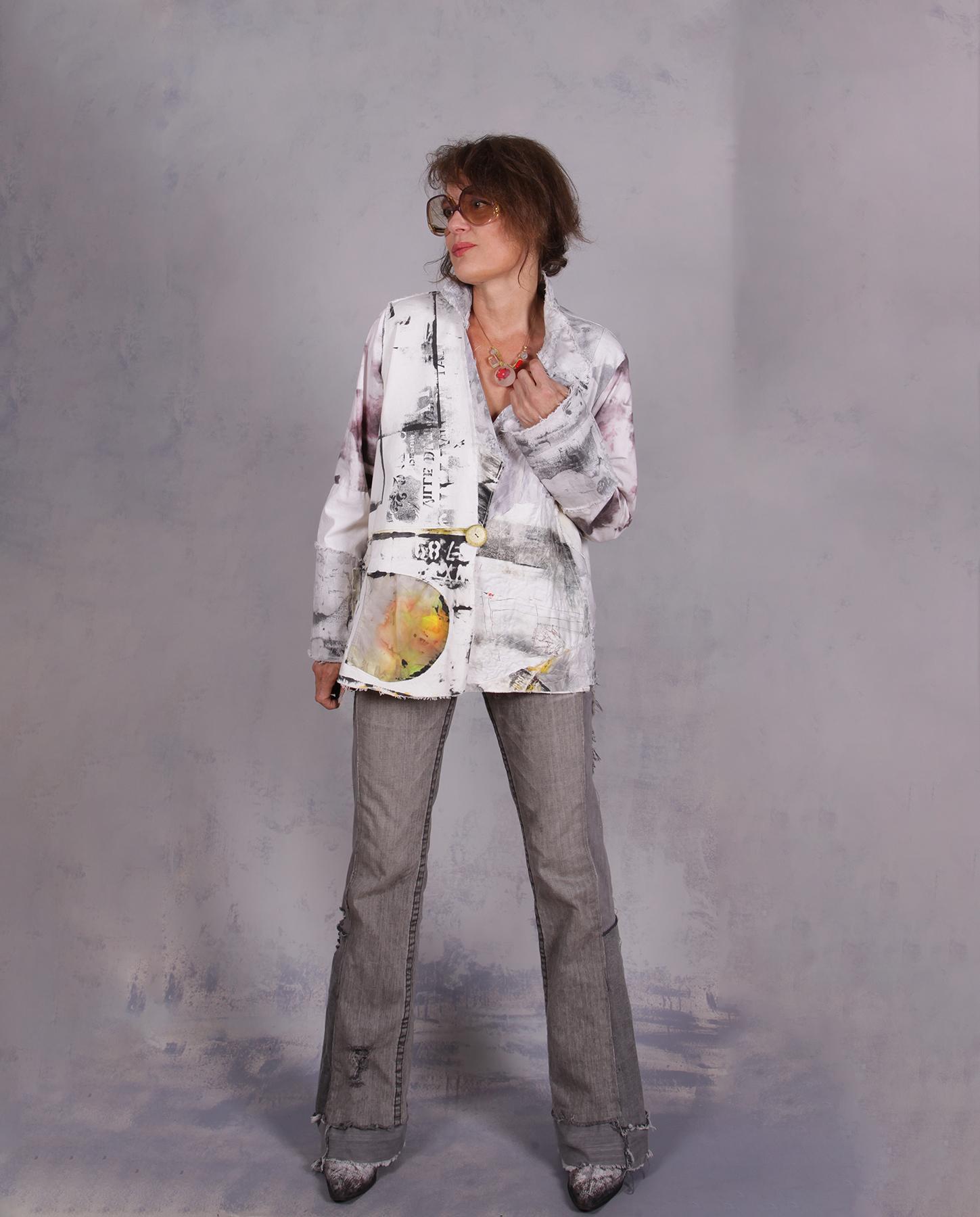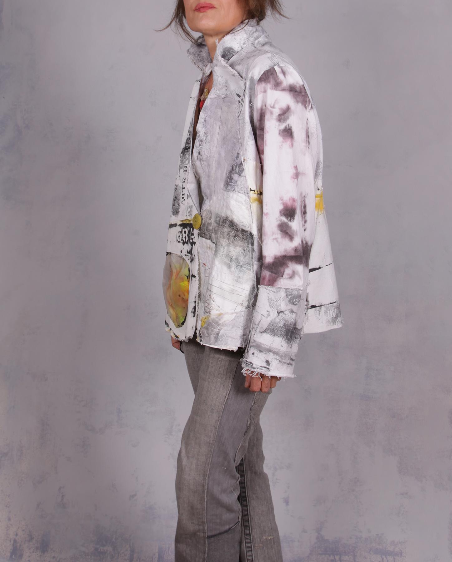 This one-of-a-kind jacket is a wearable masterpiece that blends high-fashion edge with artisanal soul. The design is an adventure in texture, featuring a structured yet comfortable silhouette (with added comfort through stretch fabric in back) defined by raw, frayed edges and many signature processes of the artist like top-stitching, added texture, mixed hand-painted graphics and color positioning for the 'just-right' balance. Its surface is alive with detailed work, showcasing hand-painted abstract graphics, newsprint-inspired typography, and splashes of citron and plum that create a unique design unlike any other. The meticulous attention to detail is reflected even in the hand-painted vintage button, shape and positioning of the signature pocket and unusual asymmetrical collar. This is a perfect summer piece that is also great to take along on trips as it is just the right medium weight, easy-care and non-wrinkling. Will also fit a variety of sizes (shown on small). Product code: C4101