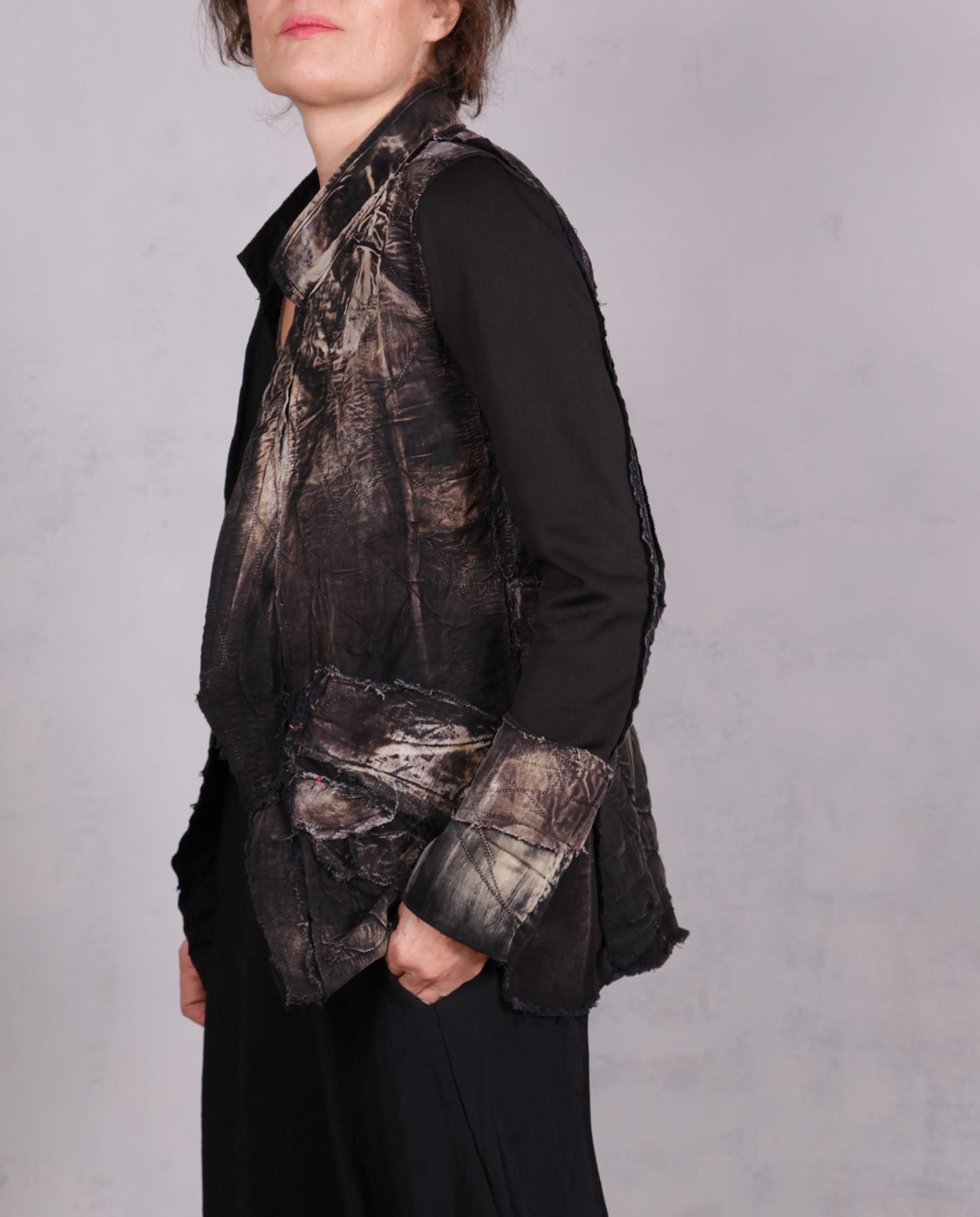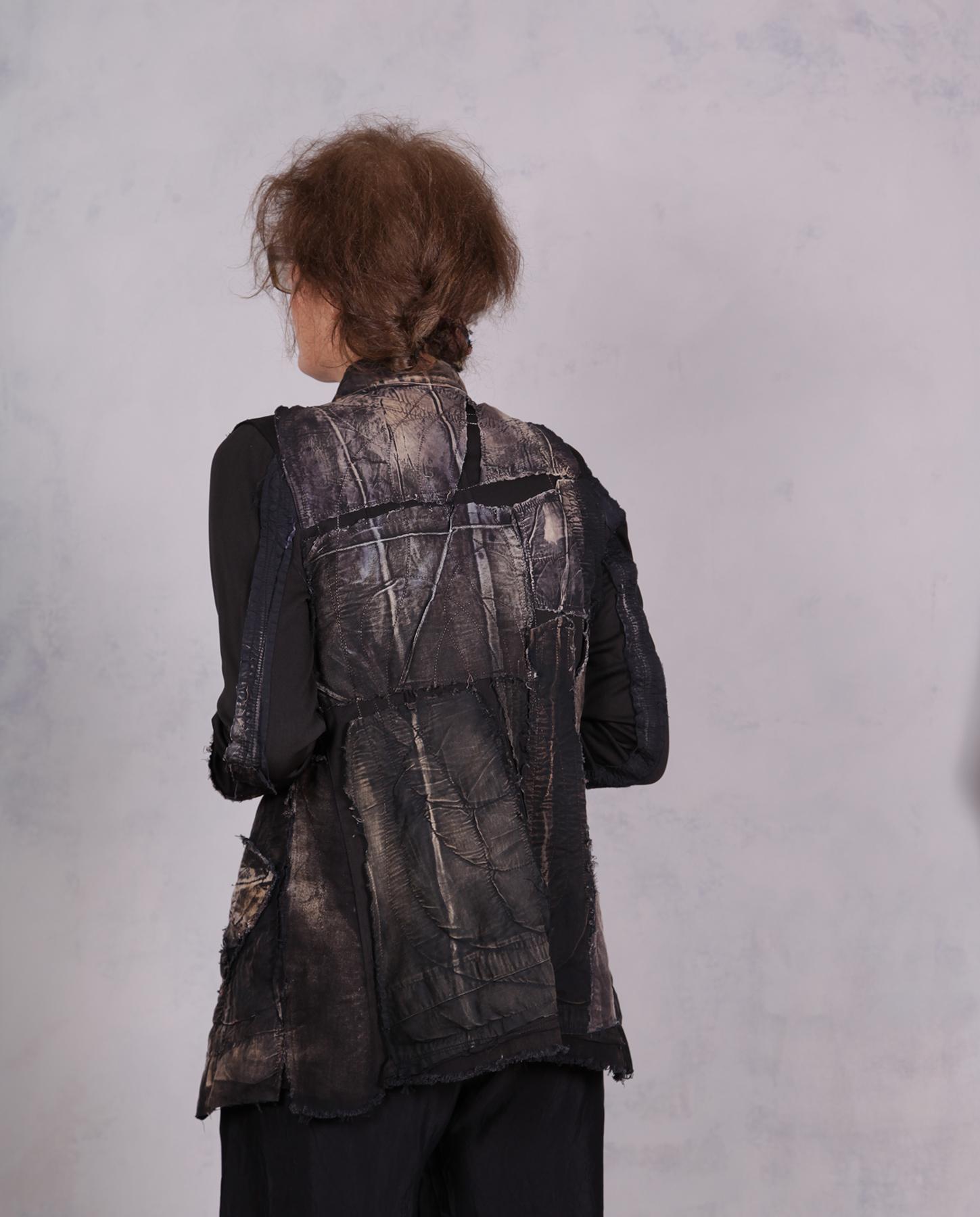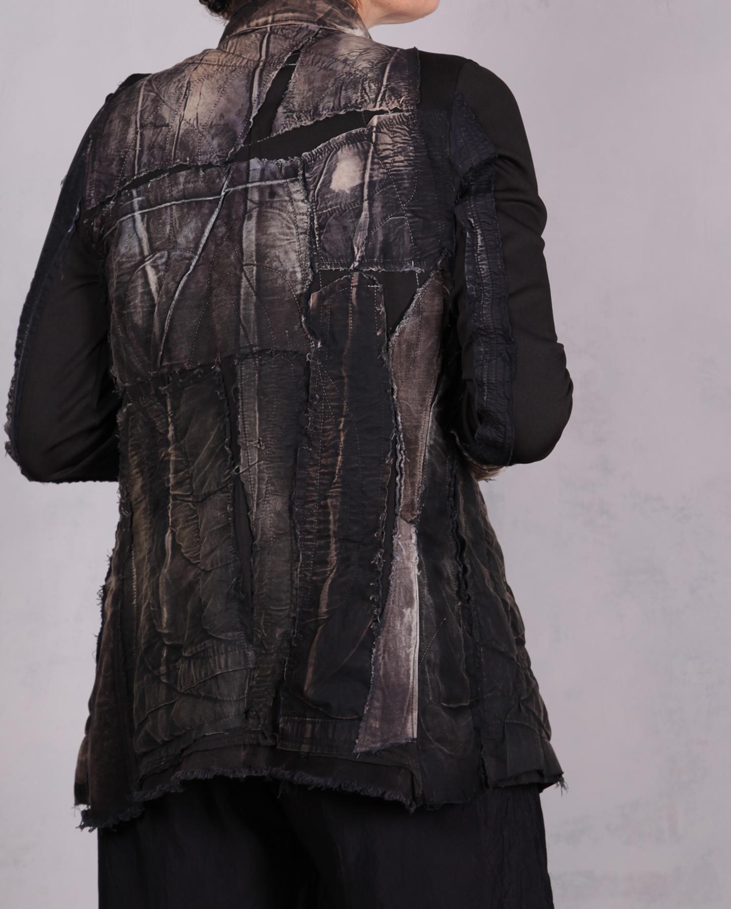 This is the most recognizable style of the artist that is also her favorite: highly detailed, texture-rich, distressed jacket in black and neutral shades. It is lightweight, with a bit of stretch, slightly fitted through the waist, with comfortable stretch sleeves. It can be casual, it can also easily be dressed up. The base is long-staple Egyptian cotton with applique, quilting and contrast top stitching throughout. It will have a one-button front closure (not shown), unless you prefer it open style as shown. Sleeves can be rolled up or pulled up. The different patterns produced by a complex process of color removal, painting and distressing, are intriguing and ultra-contemporary. There is a lot for you to discover in this easy-to-wear artistic piece that is also perfect for travel. Product code: R2511