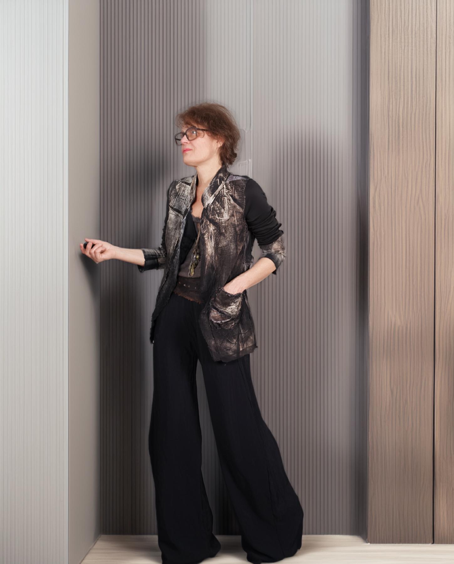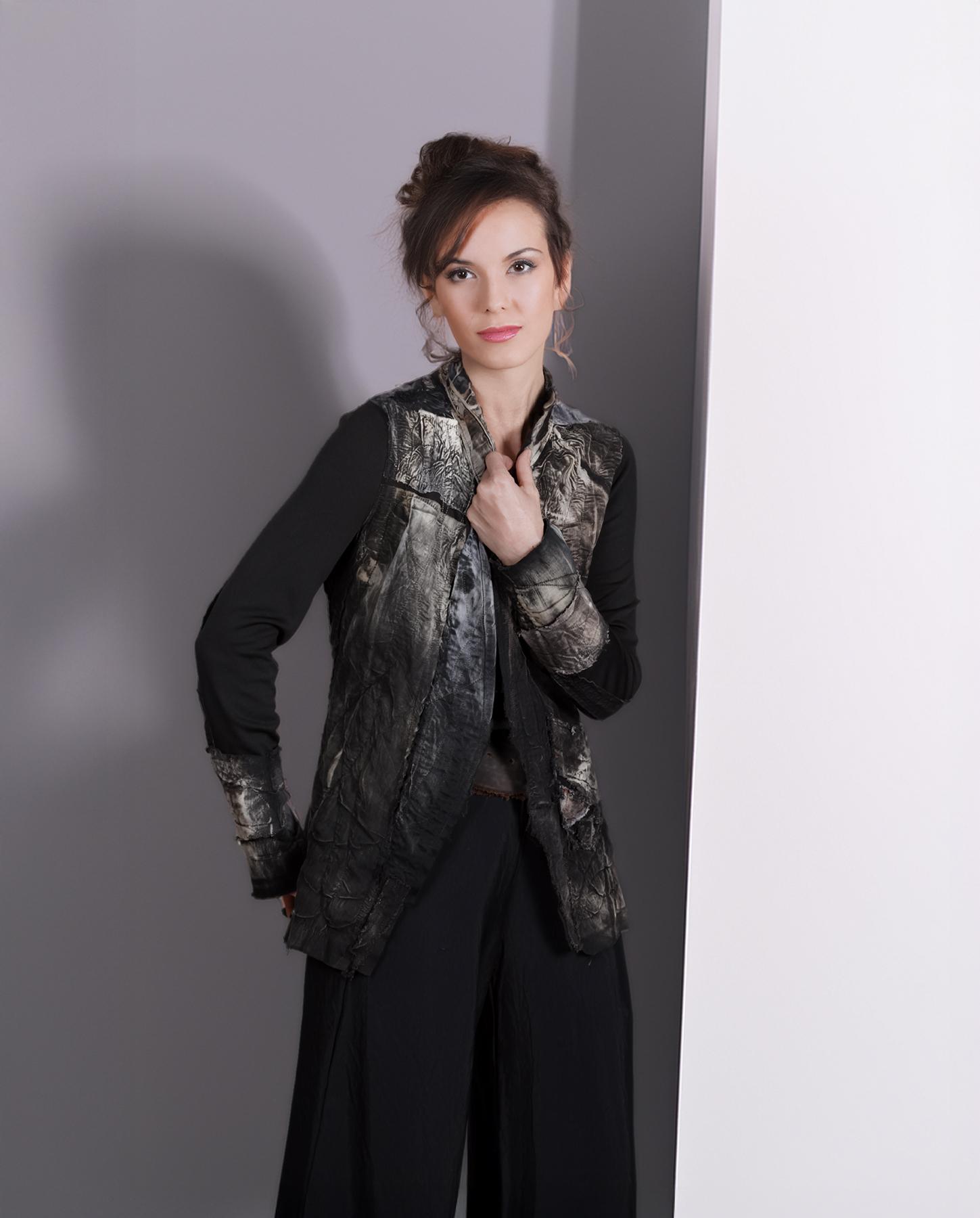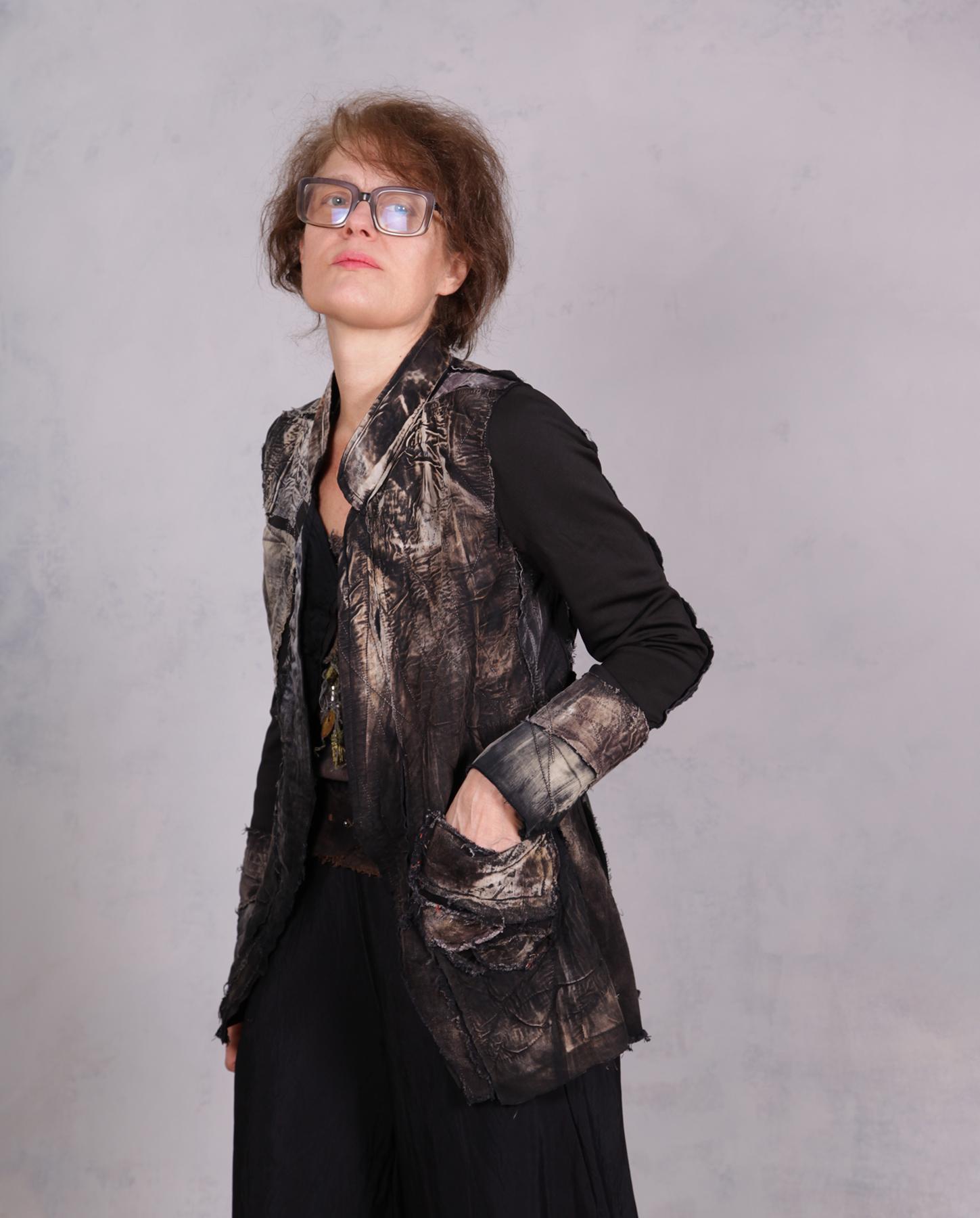 This is the most recognizable style of the artist that is also her favorite: highly detailed, texture-rich, distressed jacket in black and neutral shades. It is lightweight, with a bit of stretch, slightly fitted through the waist, with comfortable stretch sleeves. It can be casual, it can also easily be dressed up. The base is long-staple Egyptian cotton with applique, quilting and contrast top stitching throughout. It will have a one-button front closure (not shown), unless you prefer it open style as shown. Sleeves can be rolled up or pulled up. The different patterns produced by a complex process of color removal, painting and distressing, are intriguing and ultra-contemporary. There is a lot for you to discover in this easy-to-wear artistic piece that is also perfect for travel. Product code: R2511