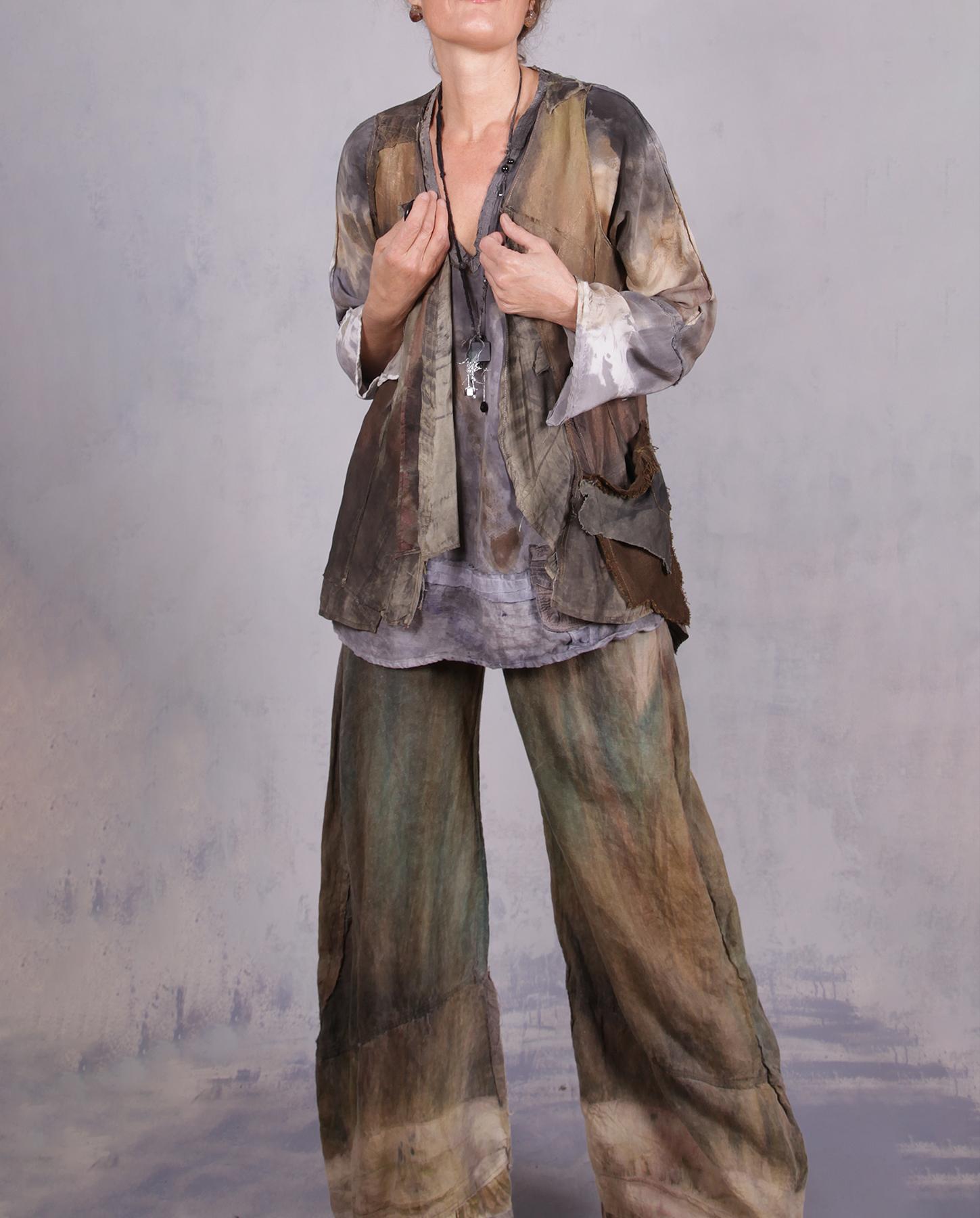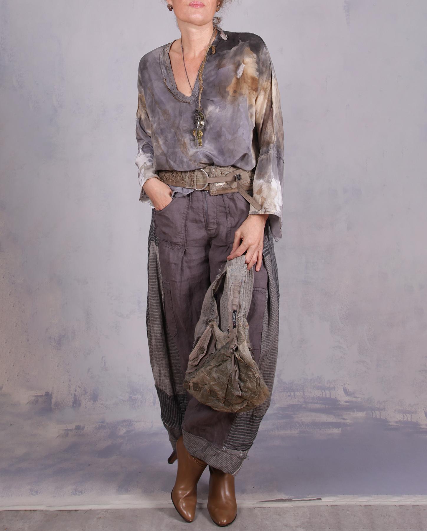 It is hard to think of anything that is more of a staple in any wardrobe than a top like this. With its light and pleasant weight, roomy, drapey design that is just right for smaller sizes if you like some room in your tops, and abstract, subtle, watercolor-like hand-painted design, it truly is a great match to a wide variety of bottoms and outfits. Tuck it in, belt it, or wear it out - you will be equally happy with all options. The V-neck has been adorned with hand stitching and a signature raised stitched 'ridge' to accentuate the artistic design of this piece. For added interest, it has a linen gauze insert in the front and a fun small pocket with two openings. Fun all around! Product code: H0825