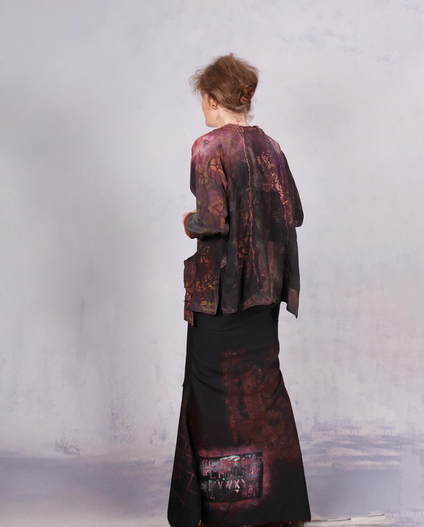 Mixed fabrics, mixed sleeve design, ruffled collar, accent buttons, pocket, hand-painted, hand-printed, raw edging.