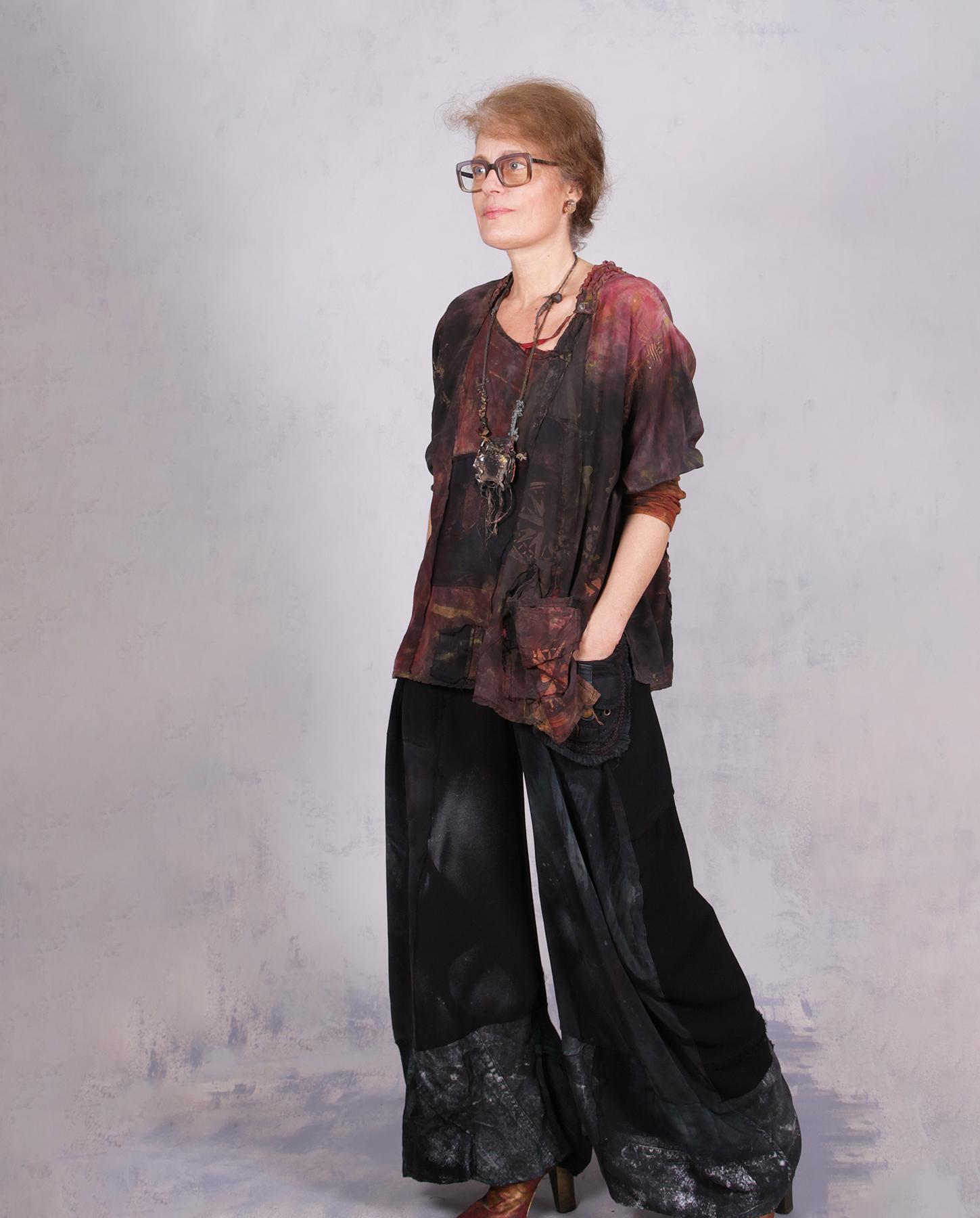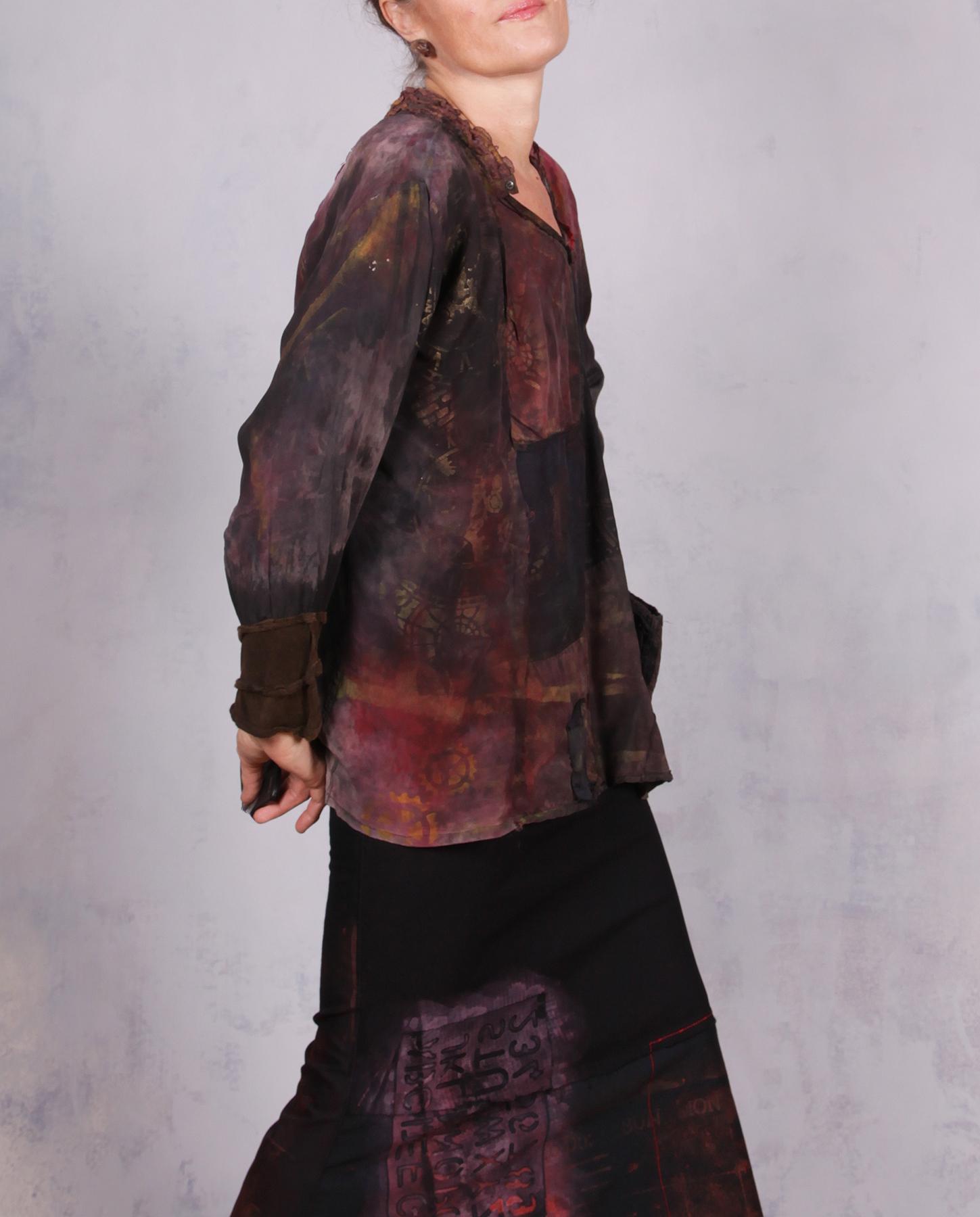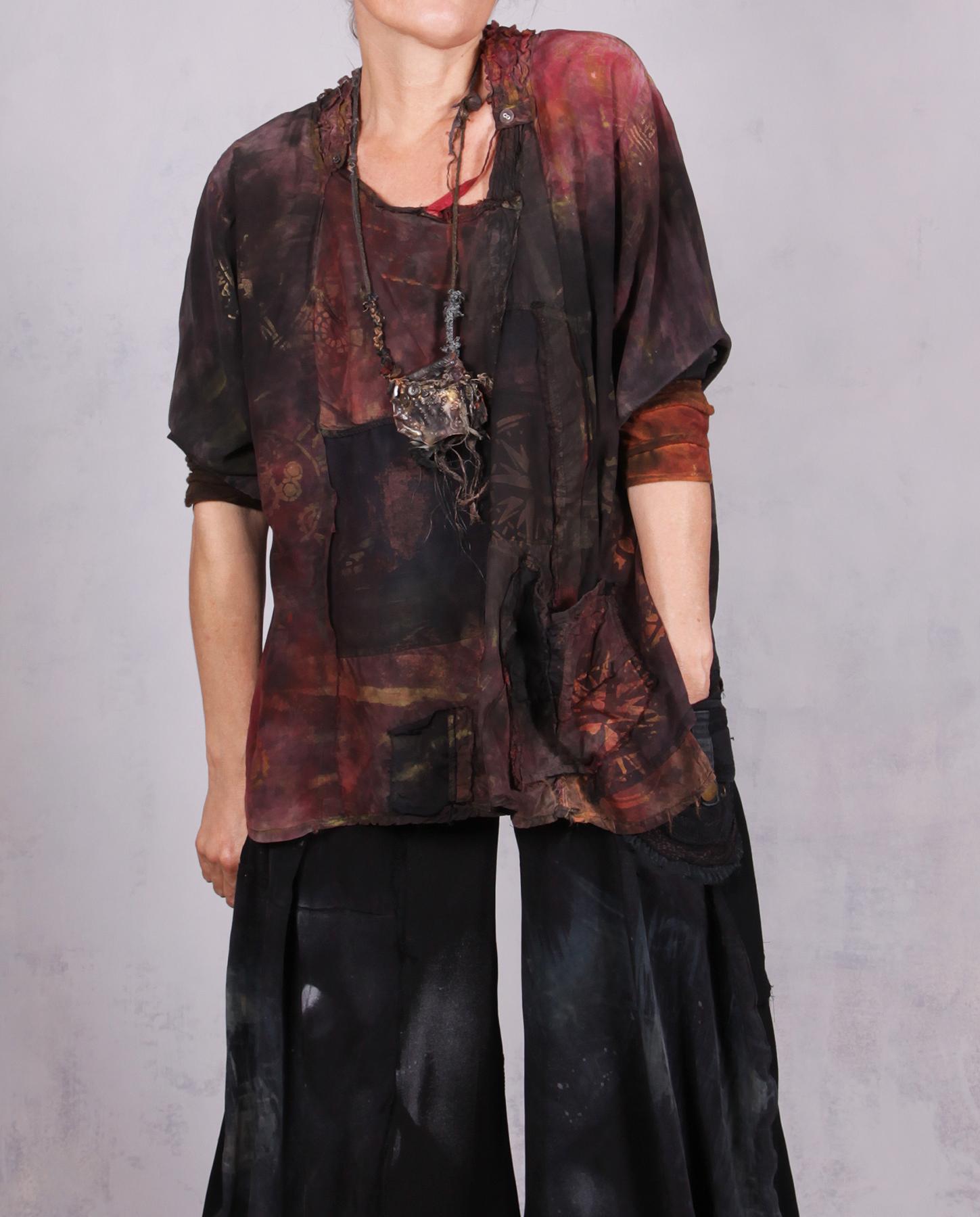 Between the rich, deep colors mixed with black and a subtle hand-printed design which is fun to explore, this blouse has an energy that comes from within. Lightweight and comfortable, it is made out of mixed silks, with a nice drape, and features an unusual layered ruffled collar, pocket, sculptural cuffs made out of knit organic cotton, and other accents you will enjoy discovering for yourself. Product code: S1635