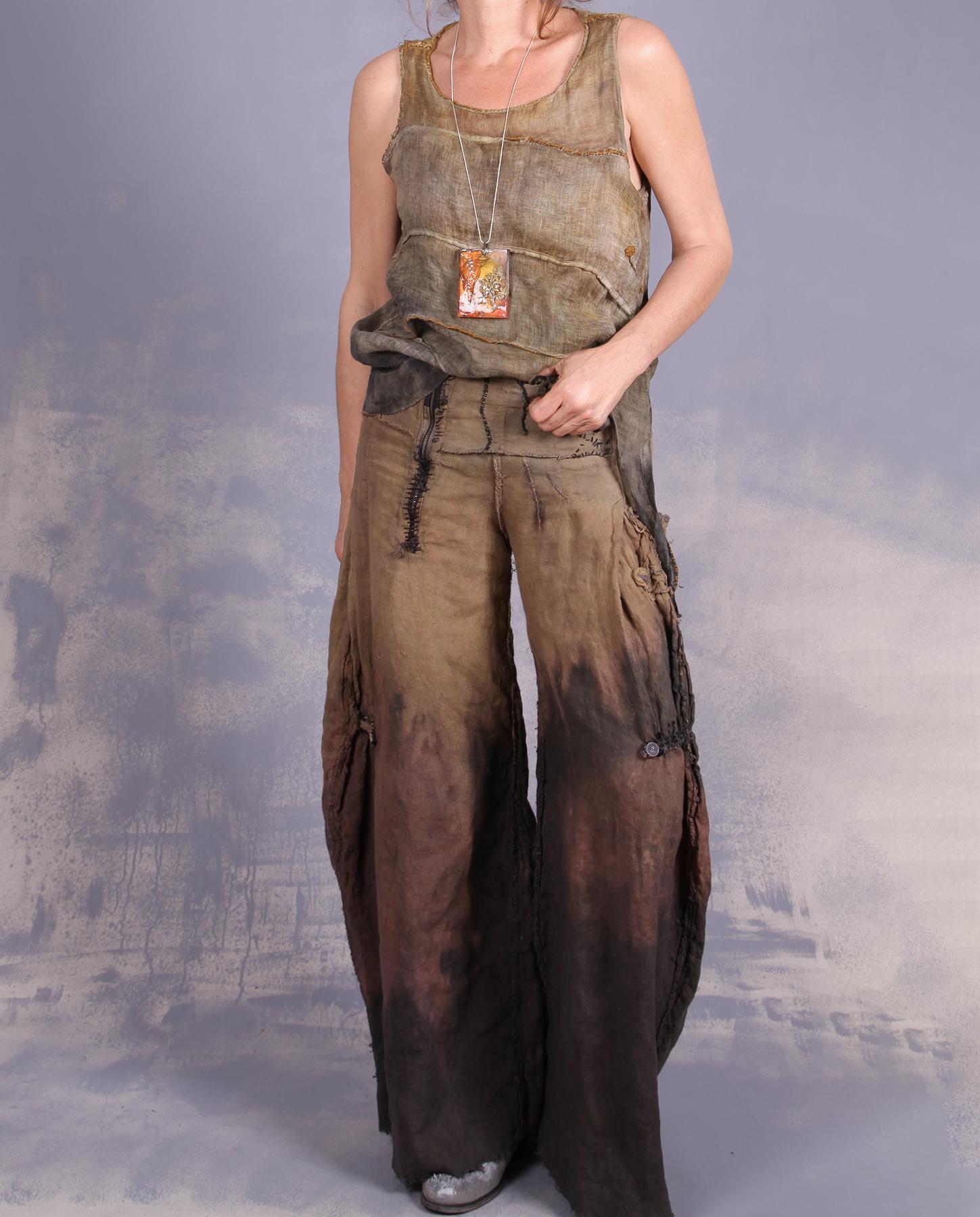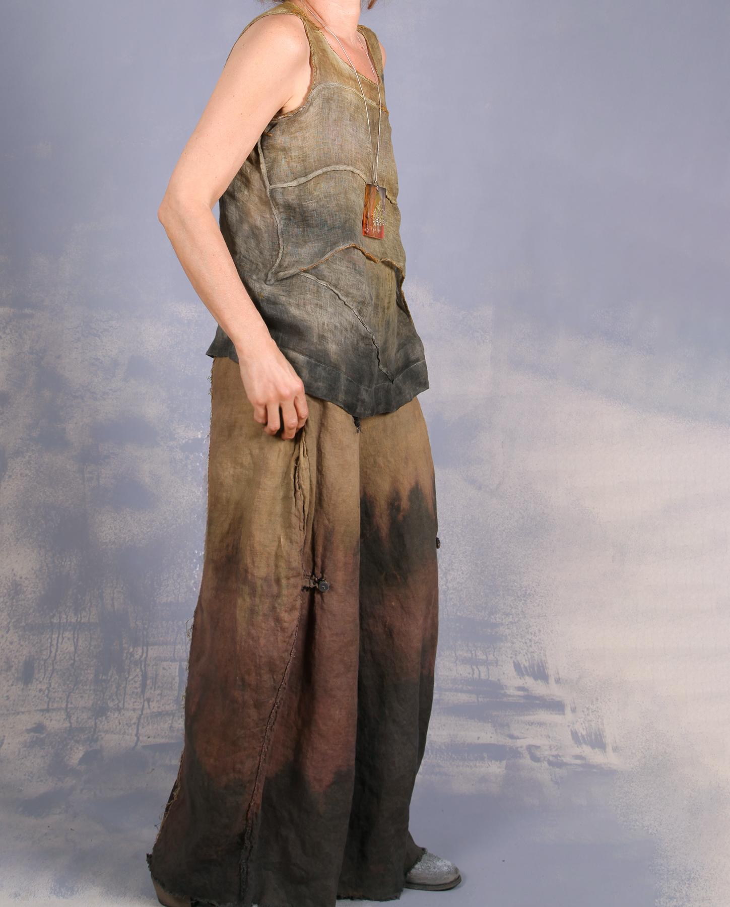 Fitted top, zipper, pocket, hand-dyed, hand-distressed, wide leg silhouette.
