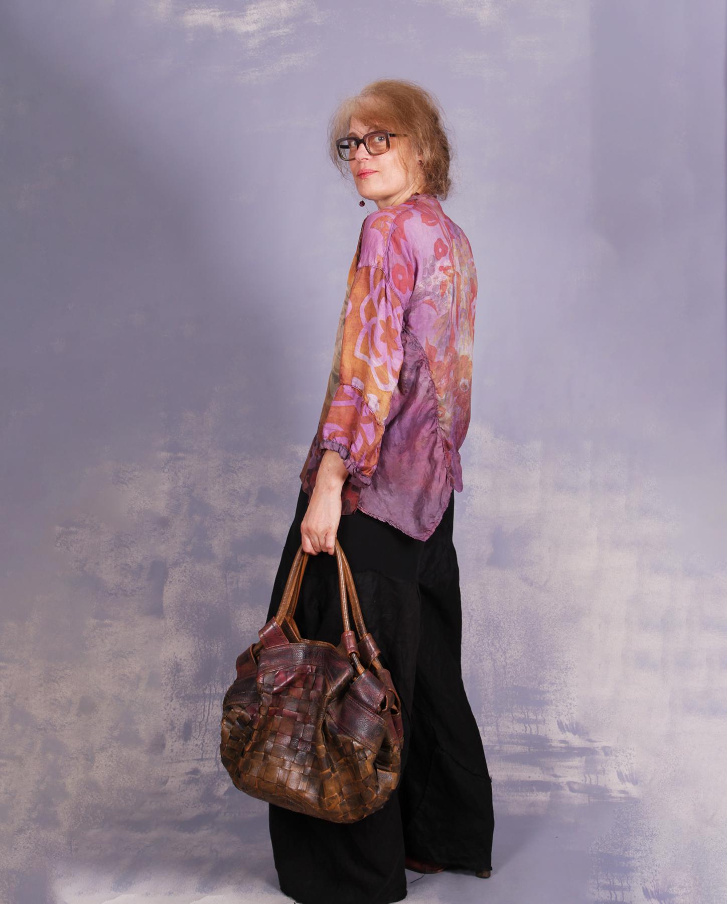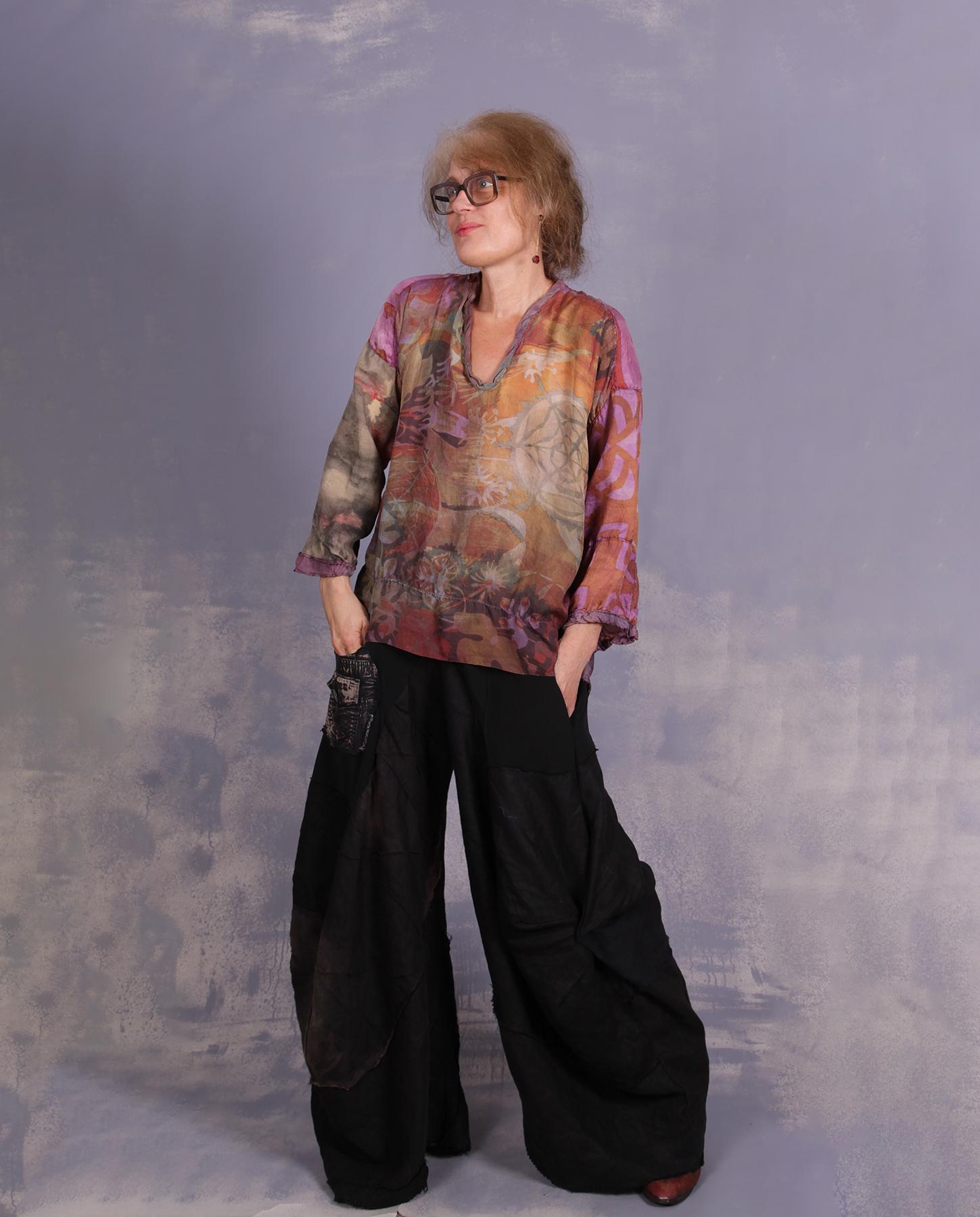 From the "Weightless Wonders" collection, featuring totally reworked antique and vintage scarves and graphic silk panels, this super lightweight blouse is both feminine and ultra modern, with its distressed look and combined graphic patterns from 4 different vintage scarves from Italy and one from a museum collection. It features a slightly asymmetrical construction, cuffed bottom (i.e. 2ply, folded over) and a V-neck. So breathable and lightweight, you will not want to take it off. Wear it by itself or under jackets. Perfect for traveling and warmer weather. Product code: Q4315