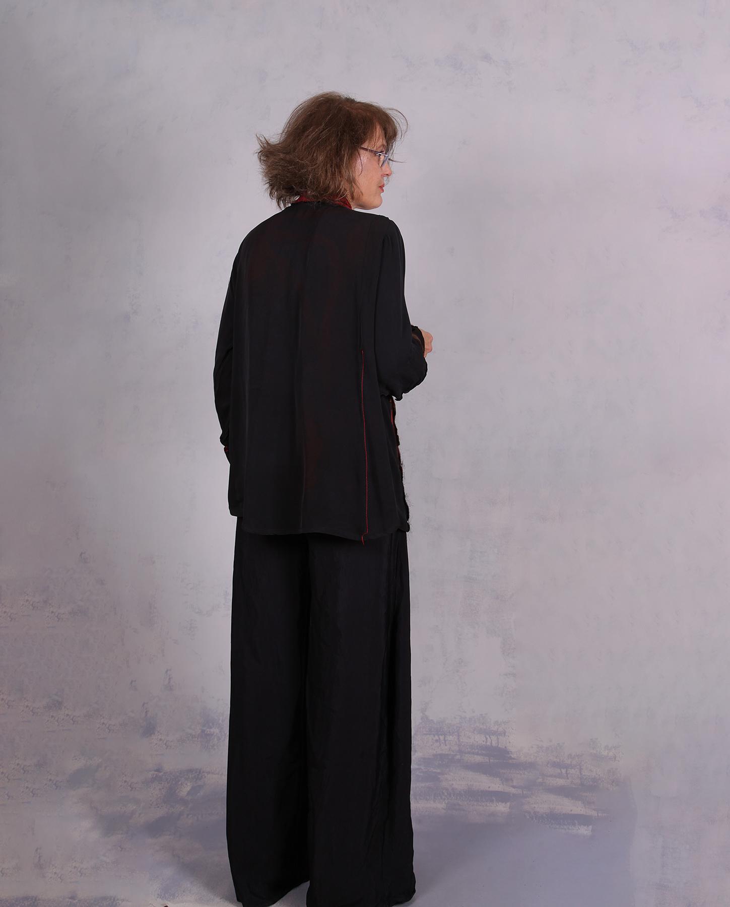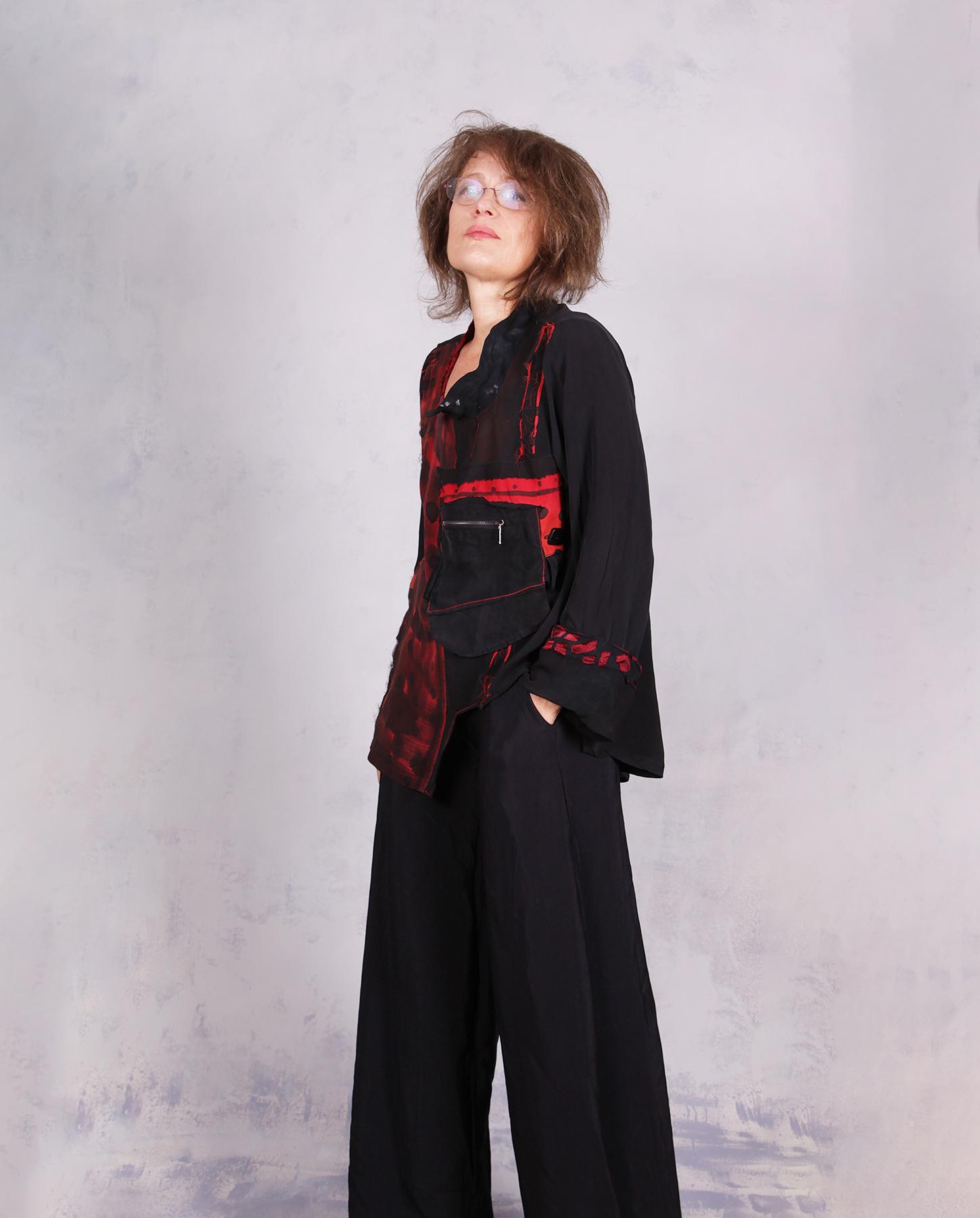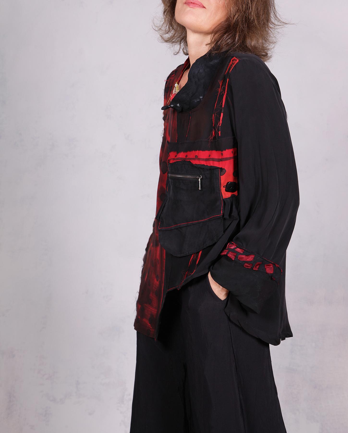 This avant-garde blouse is a study in calculated imbalance. Crafted with a soft silk crepe georgette base, the garment offers a fluid drape that moves easily with the body. The design is defined by its striking asymmetry, featuring a prominent, hand-painted red panel contrasted against a deep black bodice. Textural intrigue is added through mixed silk elements and raw-edged appliqués. The detailing is intentionally varied: a bold, zippered pocket sits off-center, while the sleeves feature different cuffs, both in texture and in material. A dramatic, texture rich asymmetrical collar completes the look, making it a versatile choice for those who value the unique look. Great for layering over both red and black, along with other neutral colors, and perfect to take along on trips. Product code: T7723