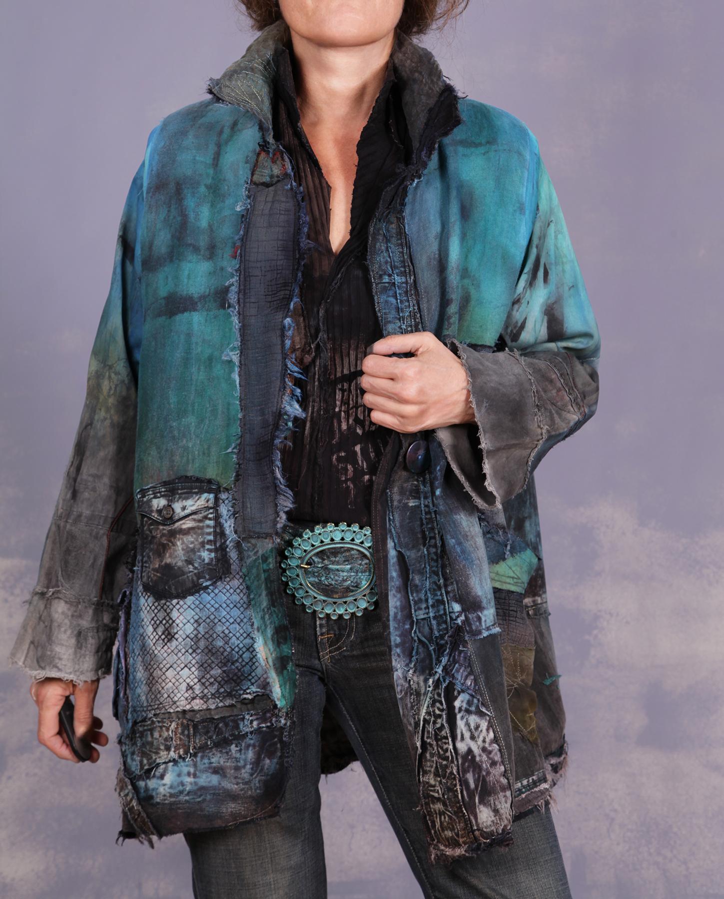 Built-in sleeves, straight-down design, multiple pockets, appliqué, one-button front loop closure, embroidery, hand-painted, raw edging, hand-distressed hand-texturing, mixed fabrics.