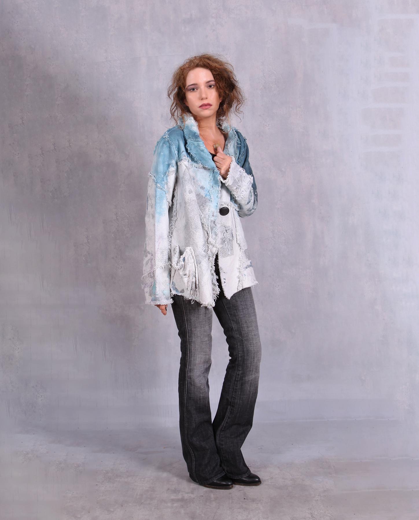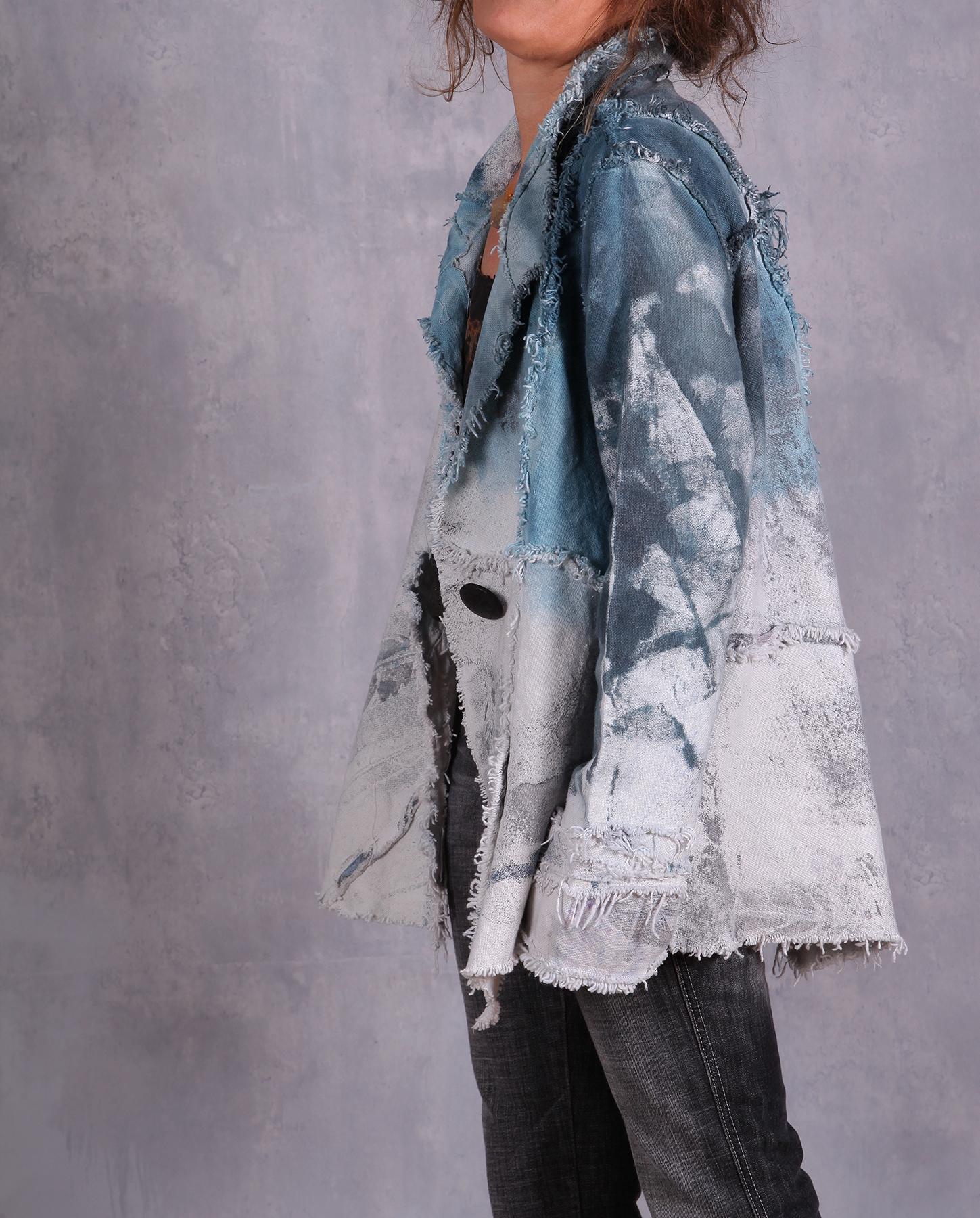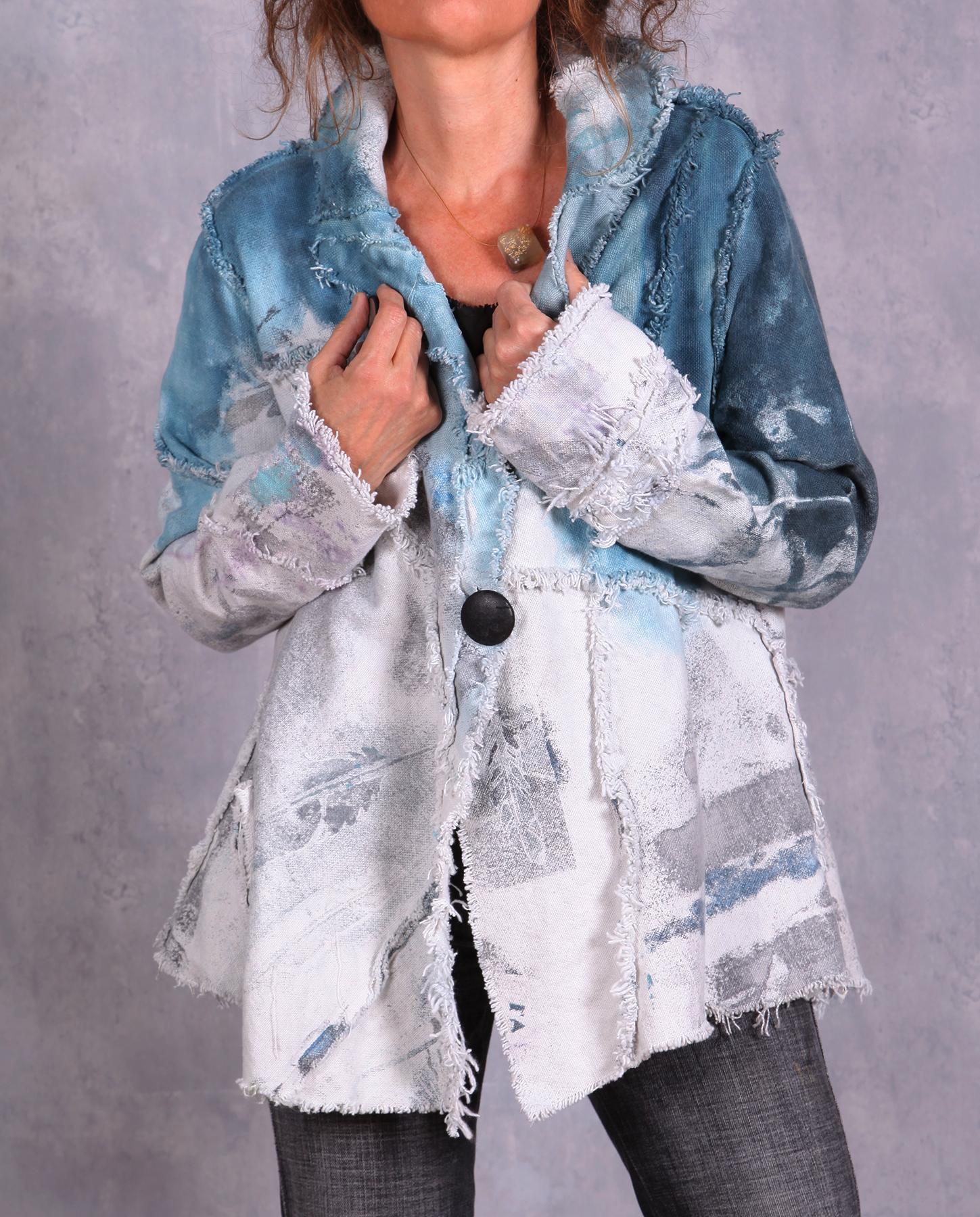 The tightly-woven cotton fabric of the jacket yields itself beautifully to the various accents the artist created for this unique jacket. From raised ridges to raw edging, this jacket is a modern artistic fashion statement. Comfortable, with a good drape, it looks and feels like a denim jacket, without the stiffness of the latter. Comfort and ease of wear is always number one priority of the artist when she creates her pieces. Hand-painted throughout, including subtle hand-stamping of feathers, the jacket features contrasting top in a gorgeous indigo color. Unusual pocket and asymmetrical collar complete the look. Easy-care and non-wrinkling, it is also great for travel. Product code: K4860