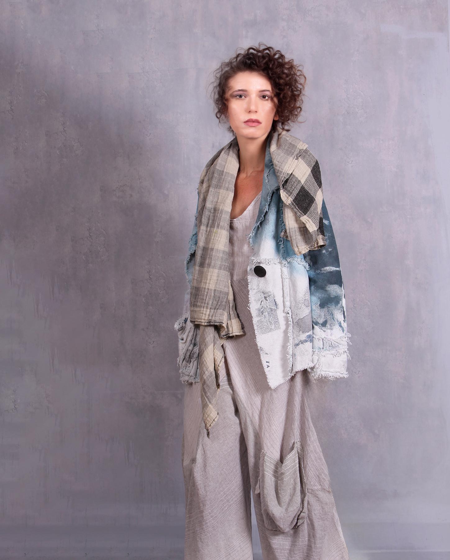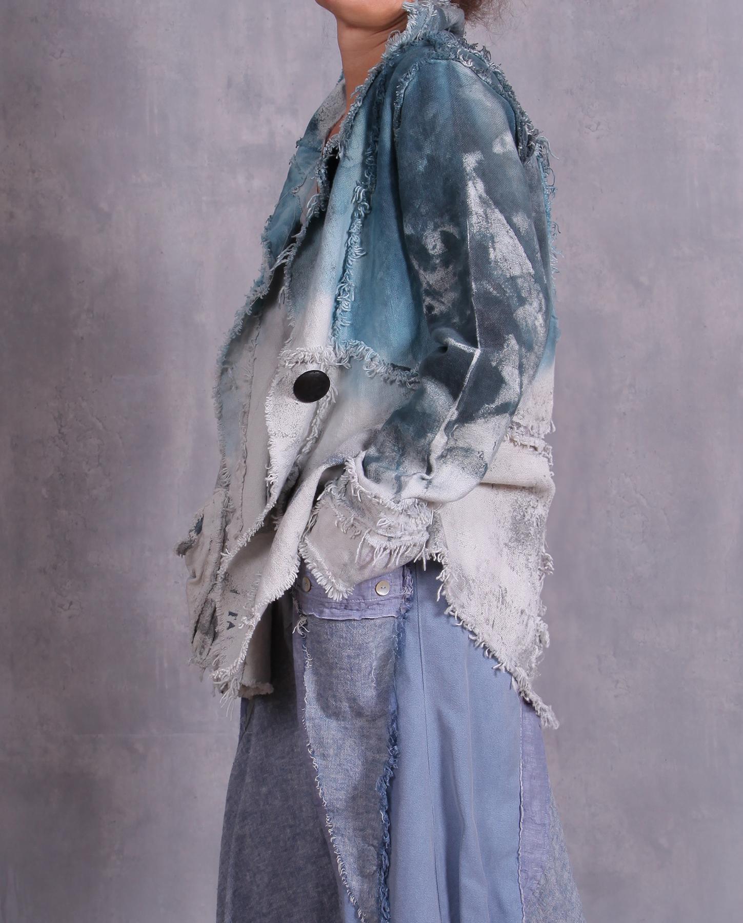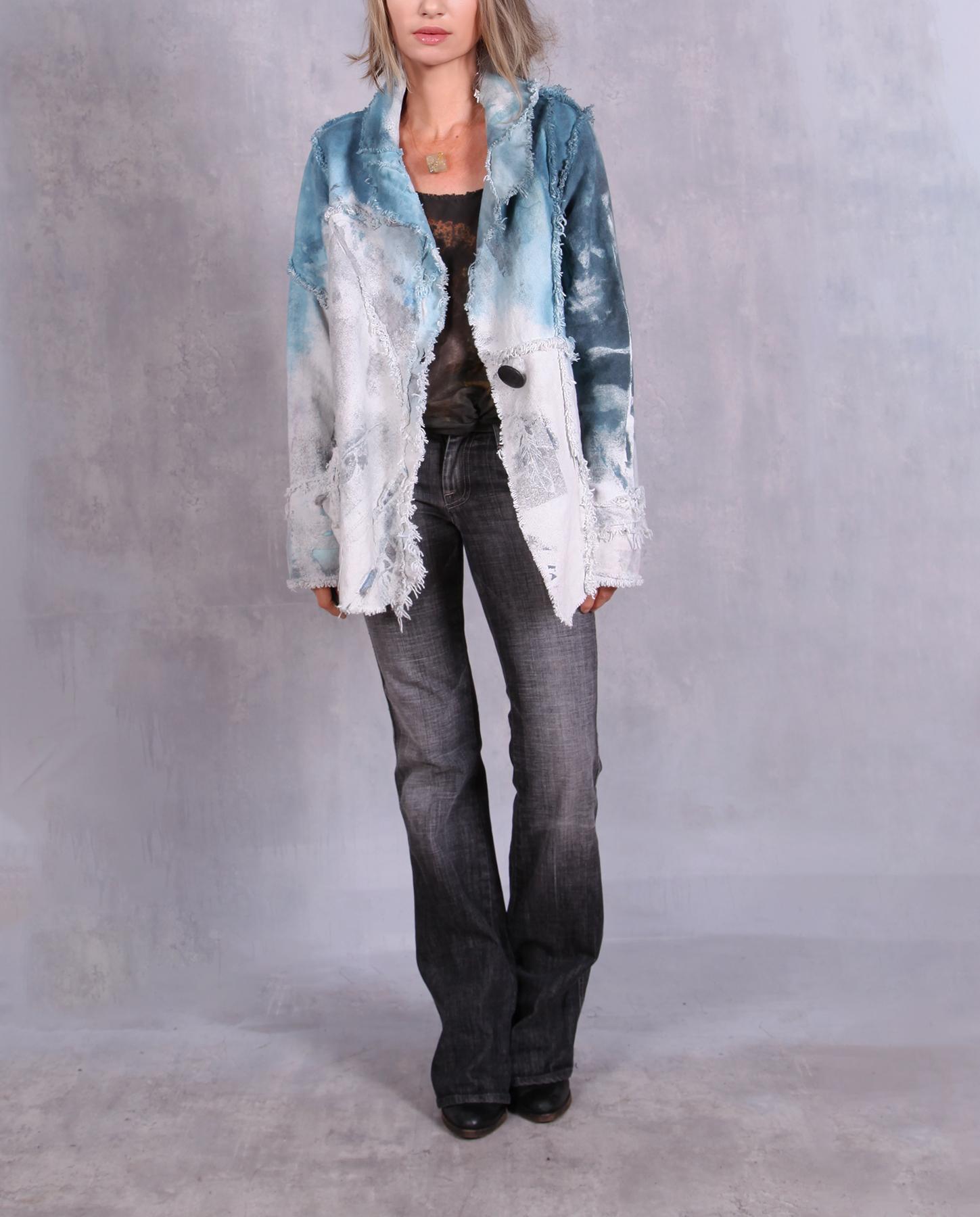 The tightly-woven cotton fabric of the jacket yields itself beautifully to the various accents the artist created for this unique jacket. From raised ridges to raw edging, this jacket is a modern artistic fashion statement. Comfortable, with a good drape, it looks and feels like a denim jacket, without the stiffness of the latter. Comfort and ease of wear is always number one priority of the artist when she creates her pieces. Hand-painted throughout, including subtle hand-stamping of feathers, the jacket features contrasting top in a gorgeous indigo color. Unusual pocket and asymmetrical collar complete the look. Easy-care and non-wrinkling, it is also great for travel. Product code: K4860