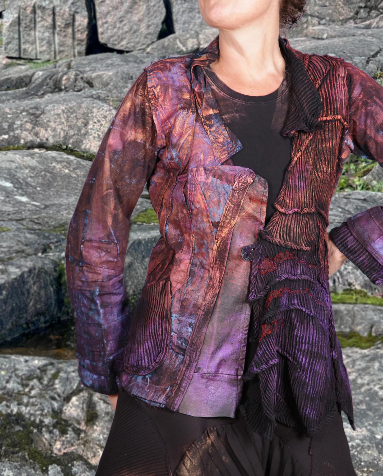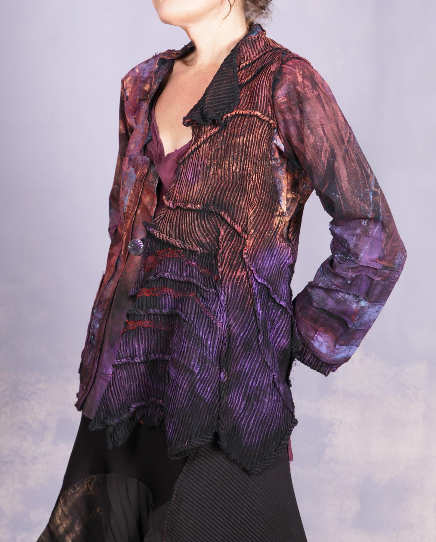 This jacket is a true work of art in every respect, from the deep, rich hand-painted colors to the choice of materials, which are all natural and all have different textures and properties, and the asymmetrical design. It is even more beautiful in person than it appears to be in pictures. Lightweight, it combines long-staple cotton with texture accordion pleats natural blend and a strip of leather in the front, styled in a fitted design. Wear it open or buttoned up, with casual or dressy outfits, with skirts or pants - lots of different possibilities! It doesn't wrinkle, so great for travel as well. Product code: Q8274