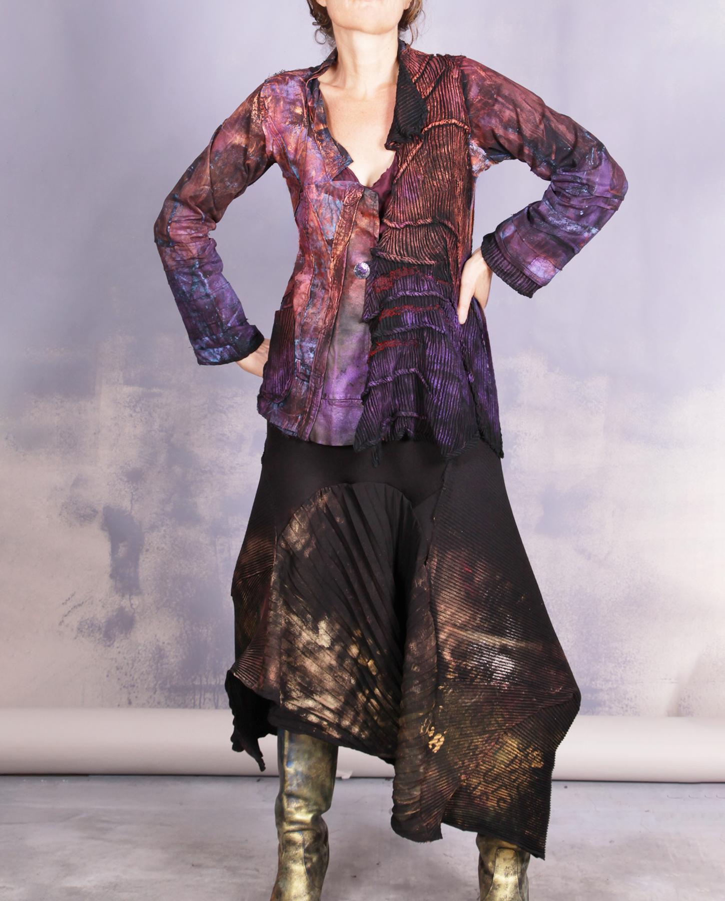 Mixed materials, hand-textured, hand-painted, fitted through waist, asymmetrical construction.