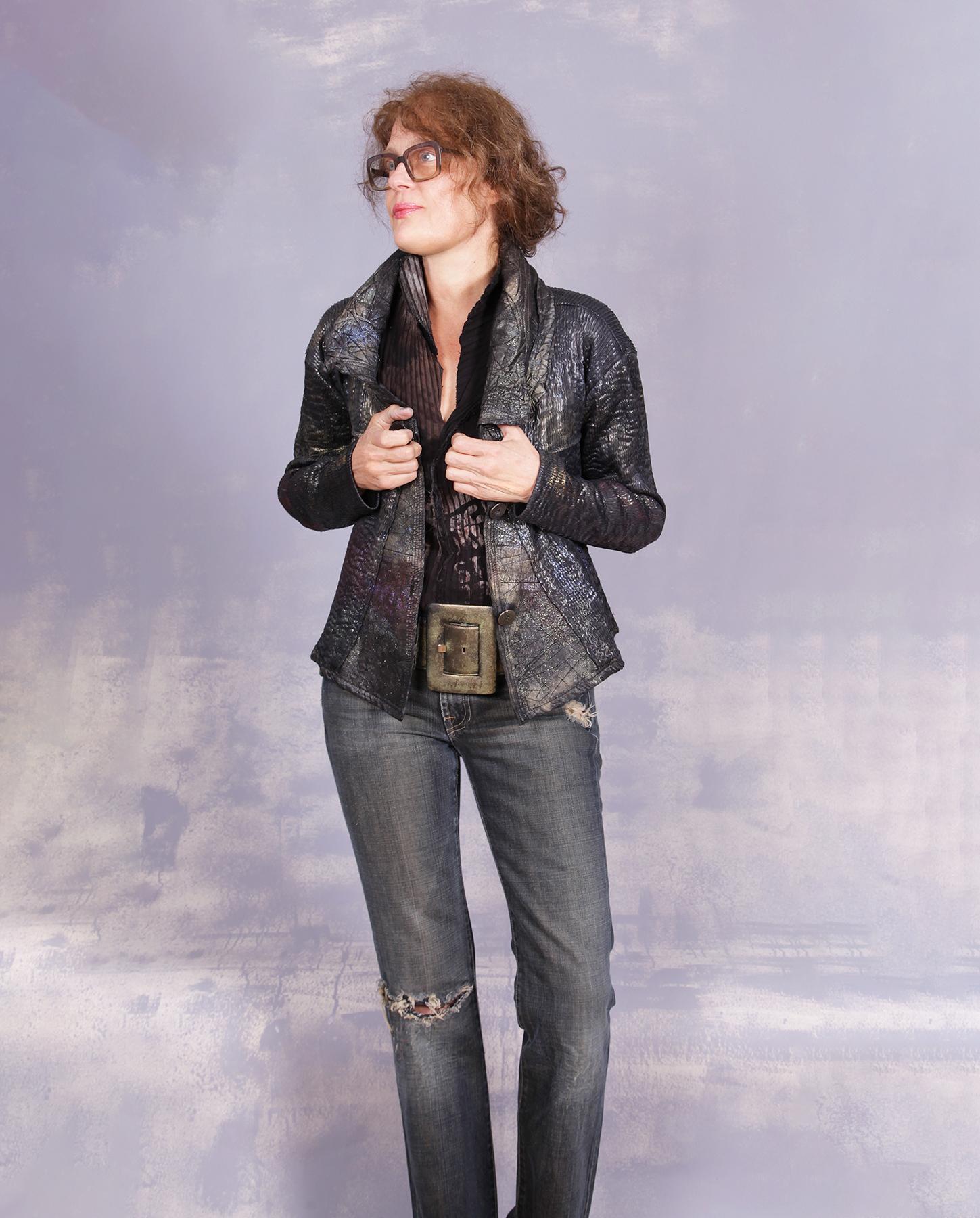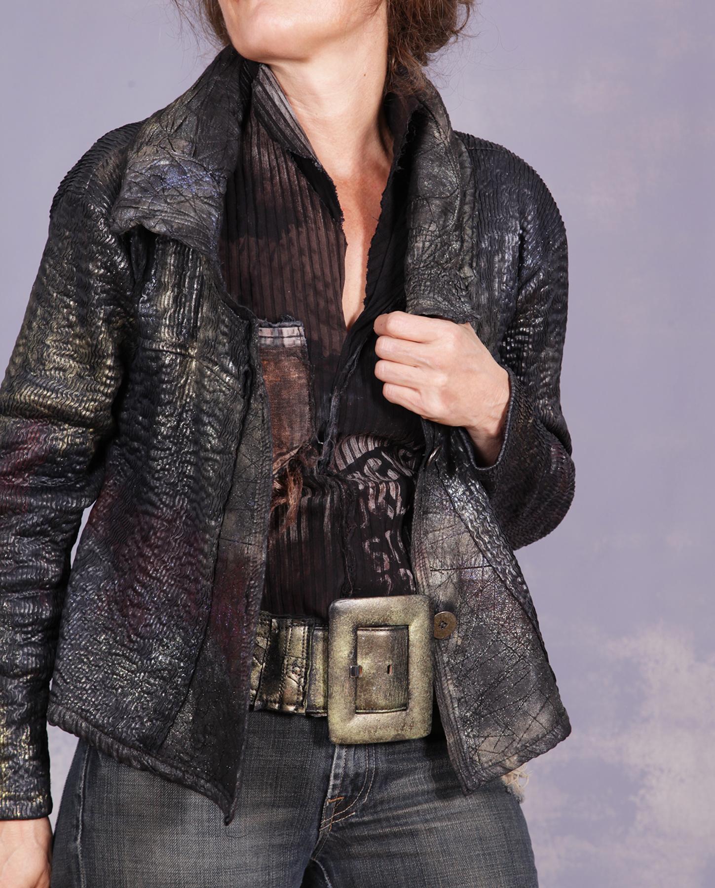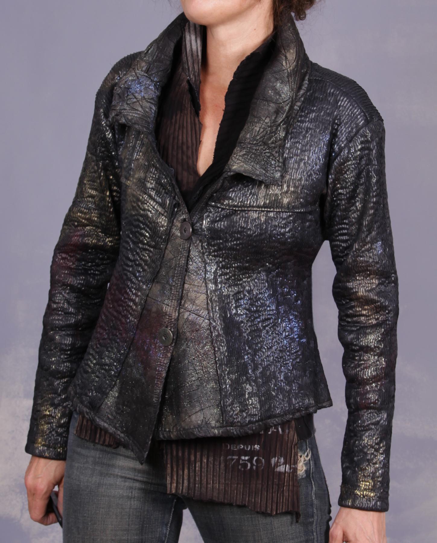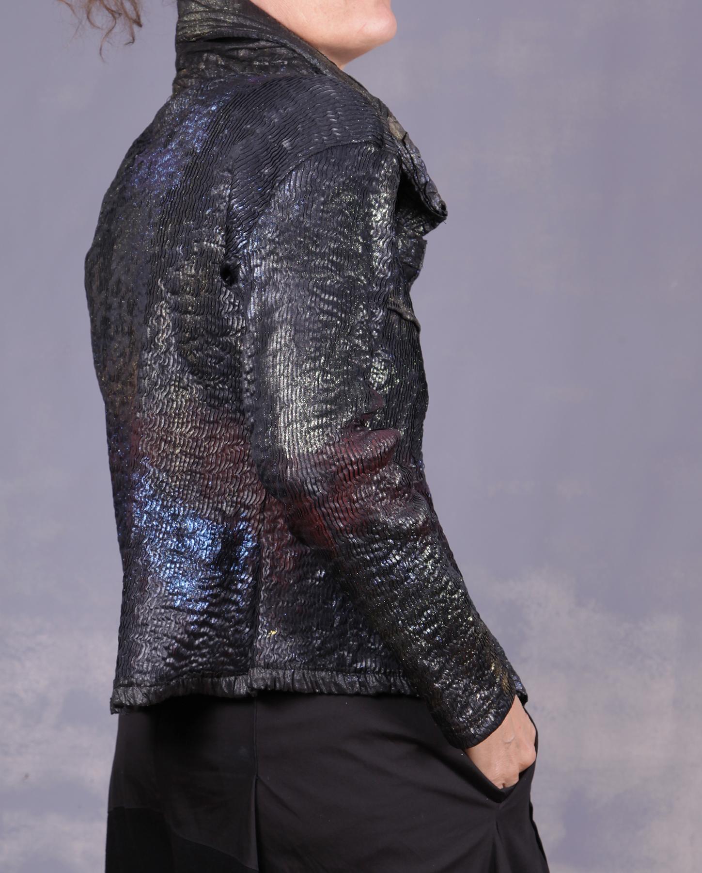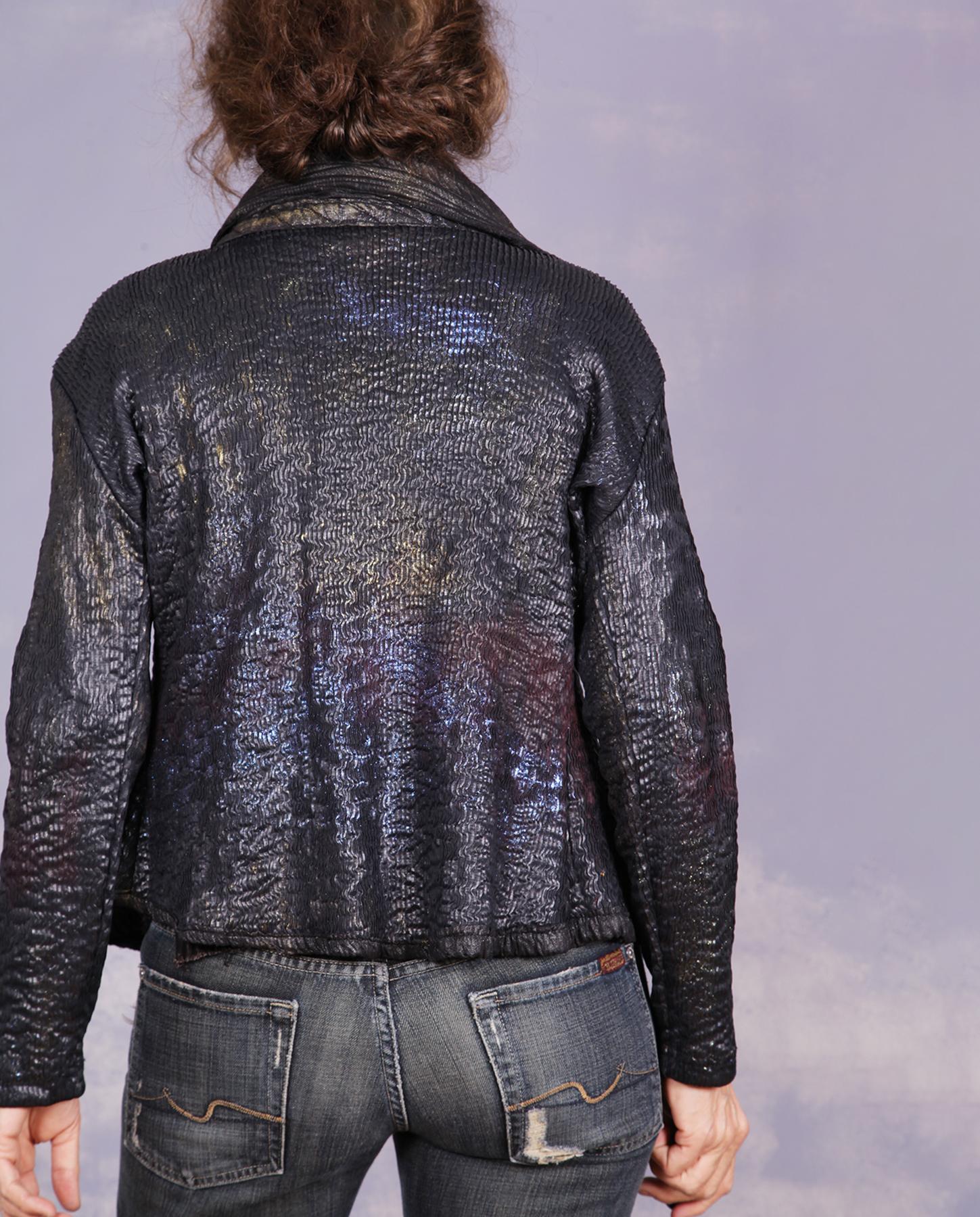 Very comfortable, with a lot of stretch to it, this jacket is pure art couture, between its classic fitted design (always with a twist, of course), unusual texture which looks like ripples on the water, and hand-painted design which makes it sparkle, with colors shifting depending on the light angle. The front panels are made out of lambskin leather, while the collar, with lots of interested texture added, is made of two-ply quilted silk. It will hug your body in a most comfortable and flattering way. Even the buttons have been painted to match the rest of the look. A great piece for many different occasions, from casual to dressy and holidays! Product code: P8615
