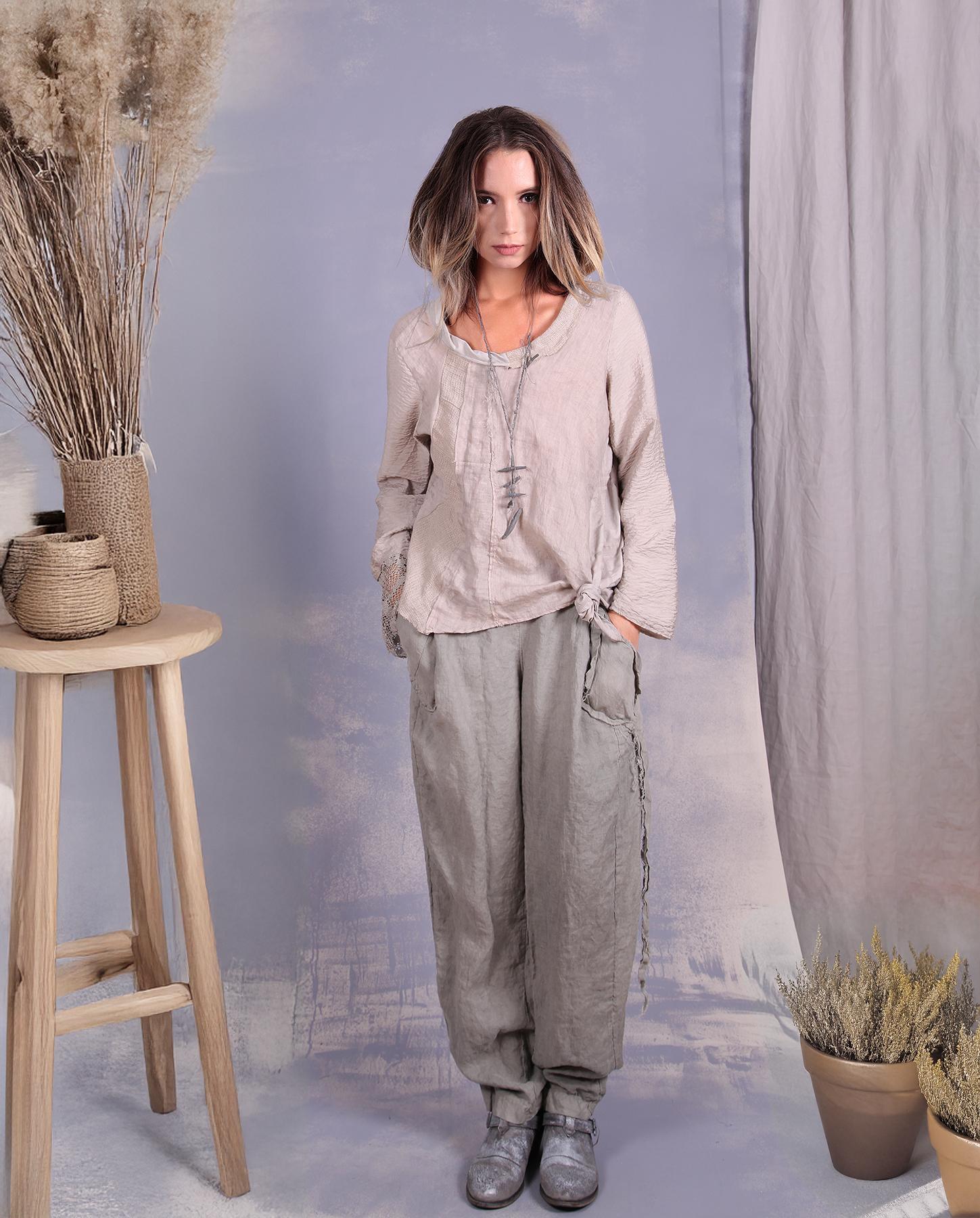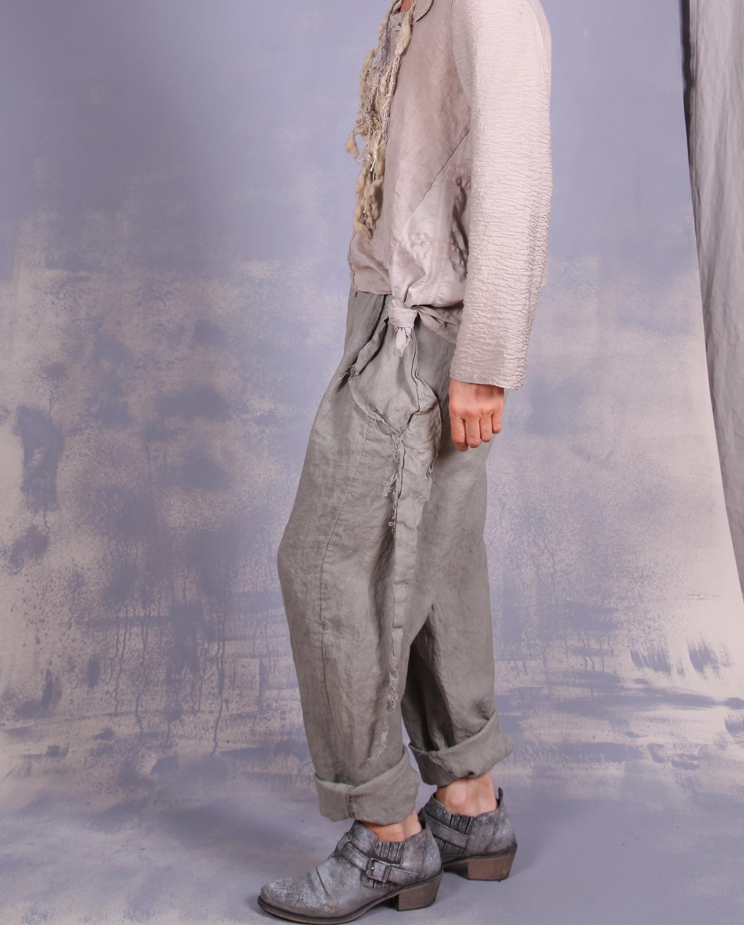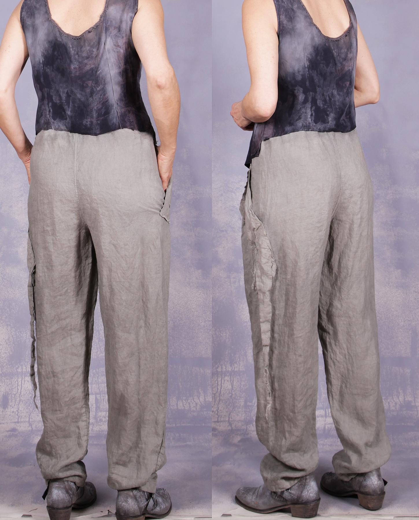 These modern-cut pants are fun, comfortable and versatile. Made out of top quality European linen, they are resistant to wrinkling because of the tight weave, hold the shape well and have a great drape. The color is wonderfully neutral hand-dyed stone gray which is easy to match with either neutral or colorful tops. Fun pockets with a signature hanging piece add to the overall 'coolness' of these pants which will most likely become your daily go-to. Product code: N6332