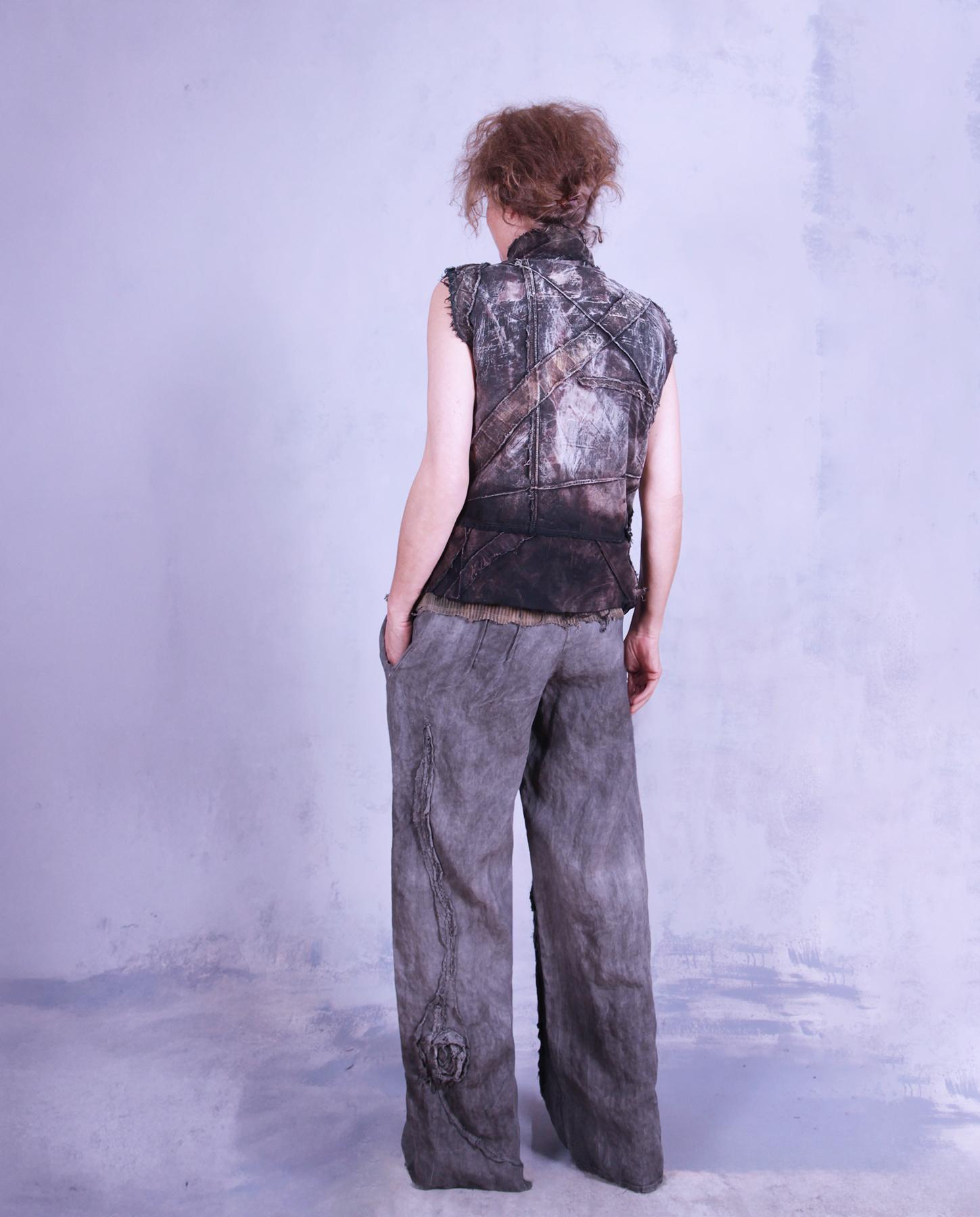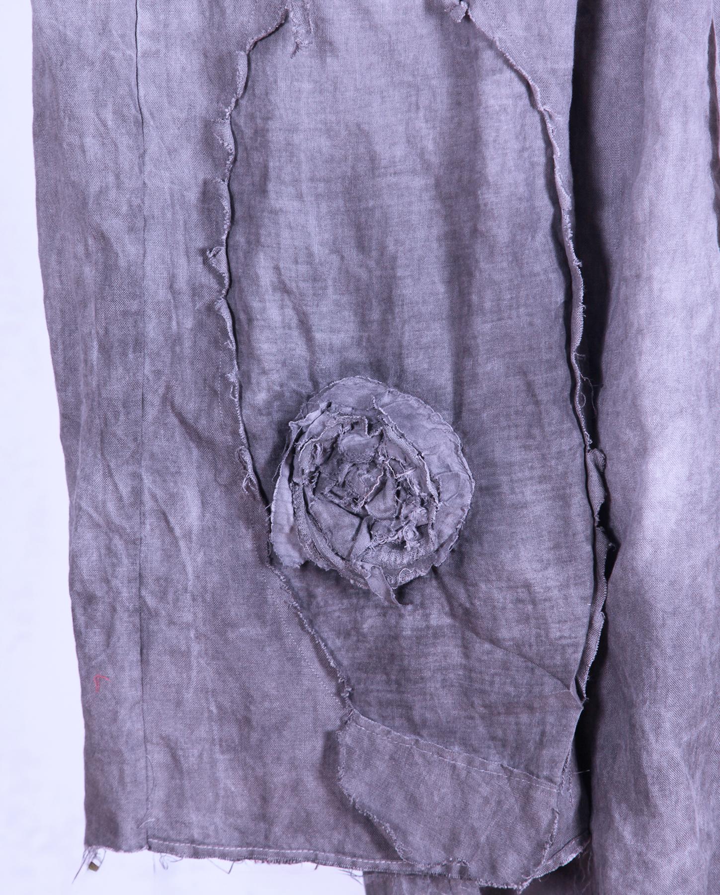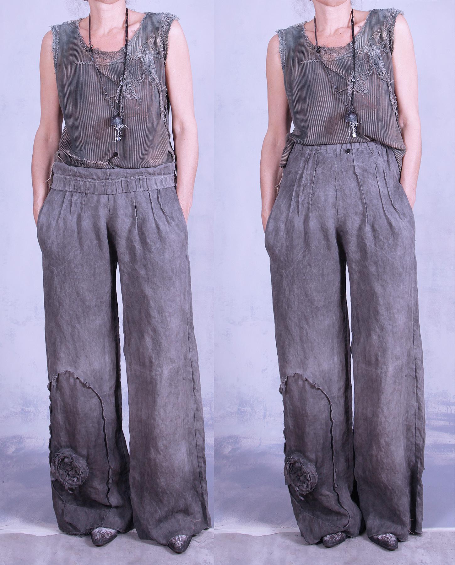 Made out of top quality European linen that is wrinkle resistant and dense yet breathable, these pants feature a great surface as only good linen is capable off, with a stonewashed (hand-painted) look and a neutral gray color. They have a high rise, with elastic waist, with pin tucks around the hips for a flattering fit, and a moderately wide leg that is both stylish and comfortable. As highlights, the pant has two very 3D artistic appliqués - one in the front and one in back, featuring stylized rosettes and raw-edged accents. The pant has pockets on sides, is a perfect weight - not too light, not heavy - and easy care (machine washable and dryable). If you prefer a lower rise, you can just fold them over as shown in some of the pictures, and secure by belt to get rid of the extra material, or we can permanently make it a lower rise for you. They can be shortened to your desired inseam length upon purchase, with or without raw edging, based on your preference. Product code: N0150