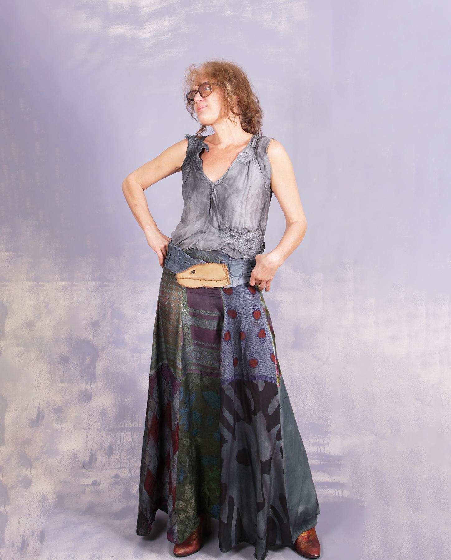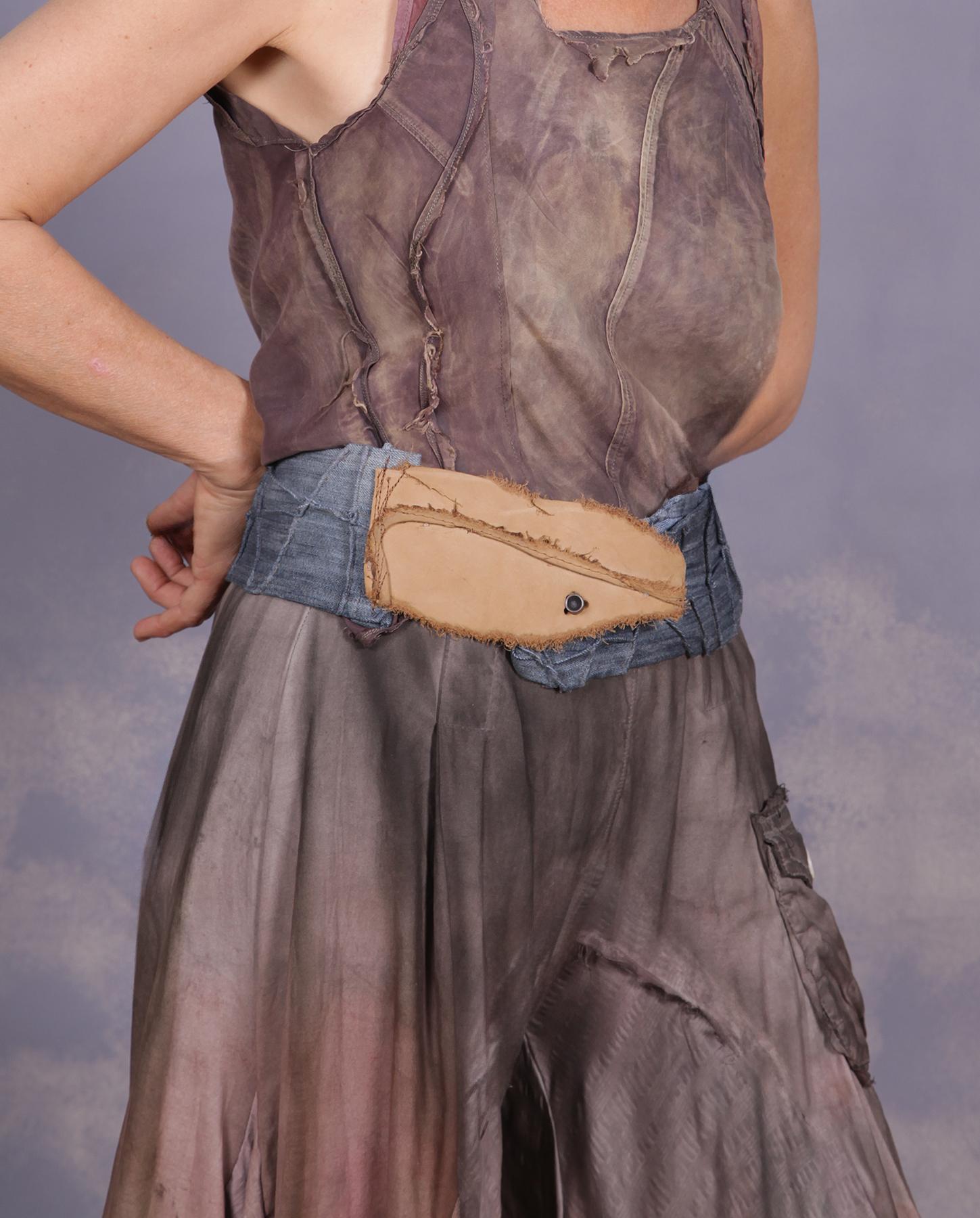 Here is a very lightweight, thin, flexible belt - just one layer of fabric which is vintage stretch denim in a great modern grayish-blue wash with subtle variations - that you can wear over just about anything. It has been textured throughout with the artist's signature pin tucks that she calls 'ridges'. It has a leather 'buckle' that will close on a fun button - or buttons if you need multiple options for closure. Since it stretches, you are assured a perfect fit around the hips or waist. It has lots of extra built in so that we can fit it to your desired length. Product code: E4930