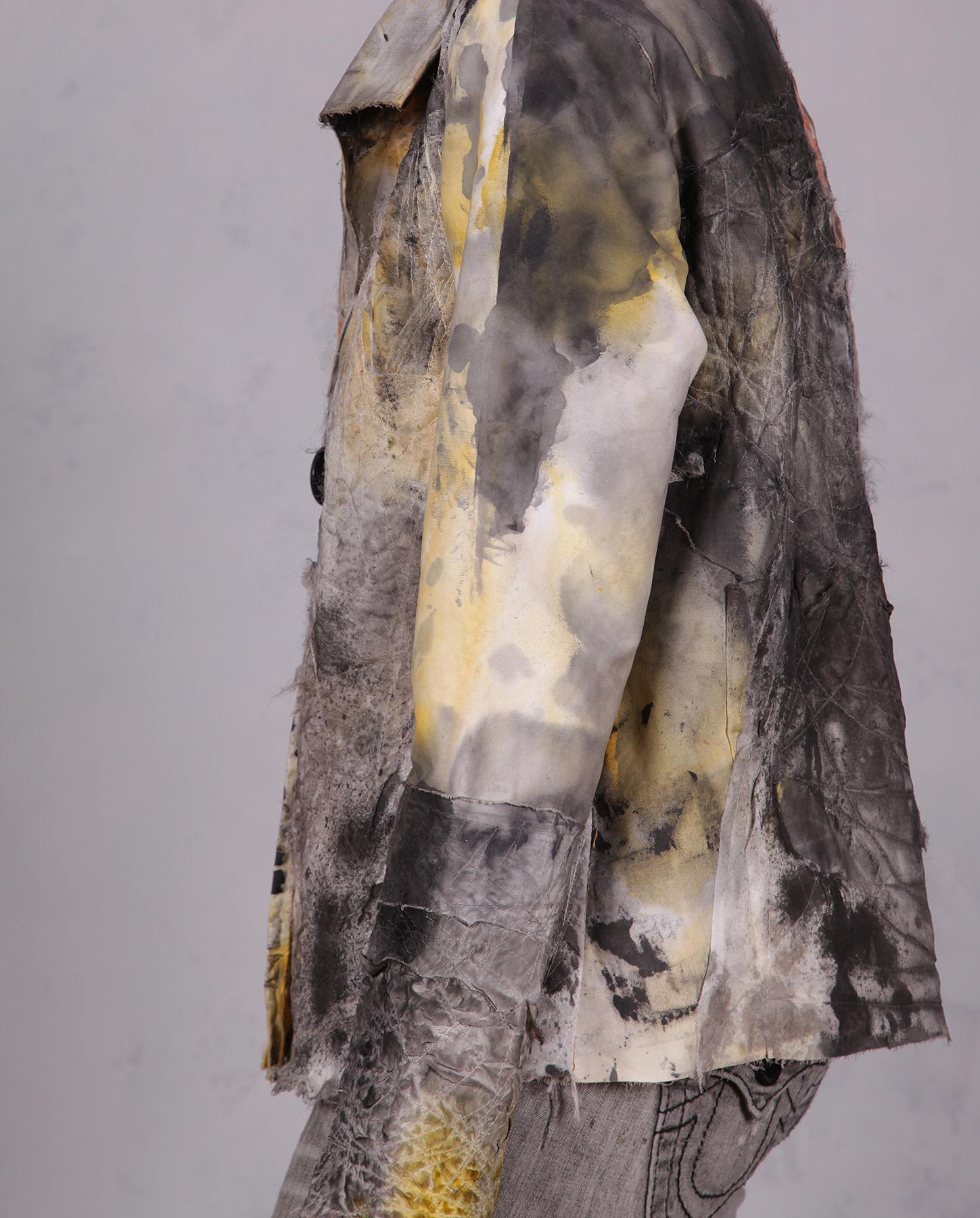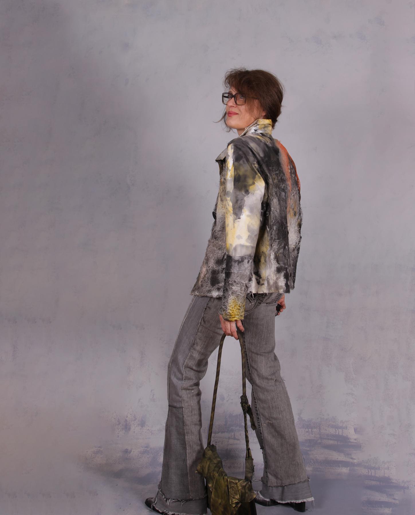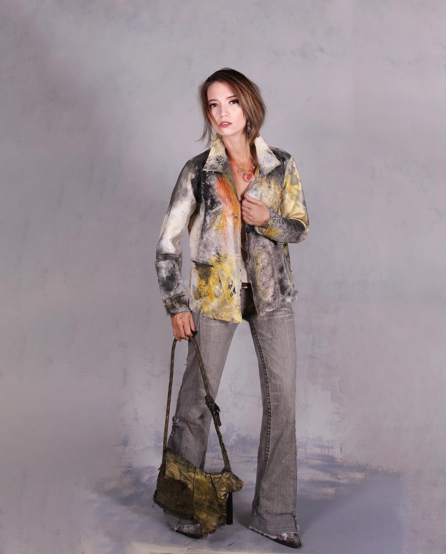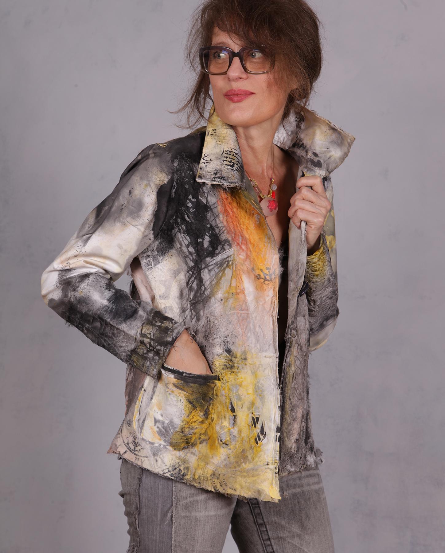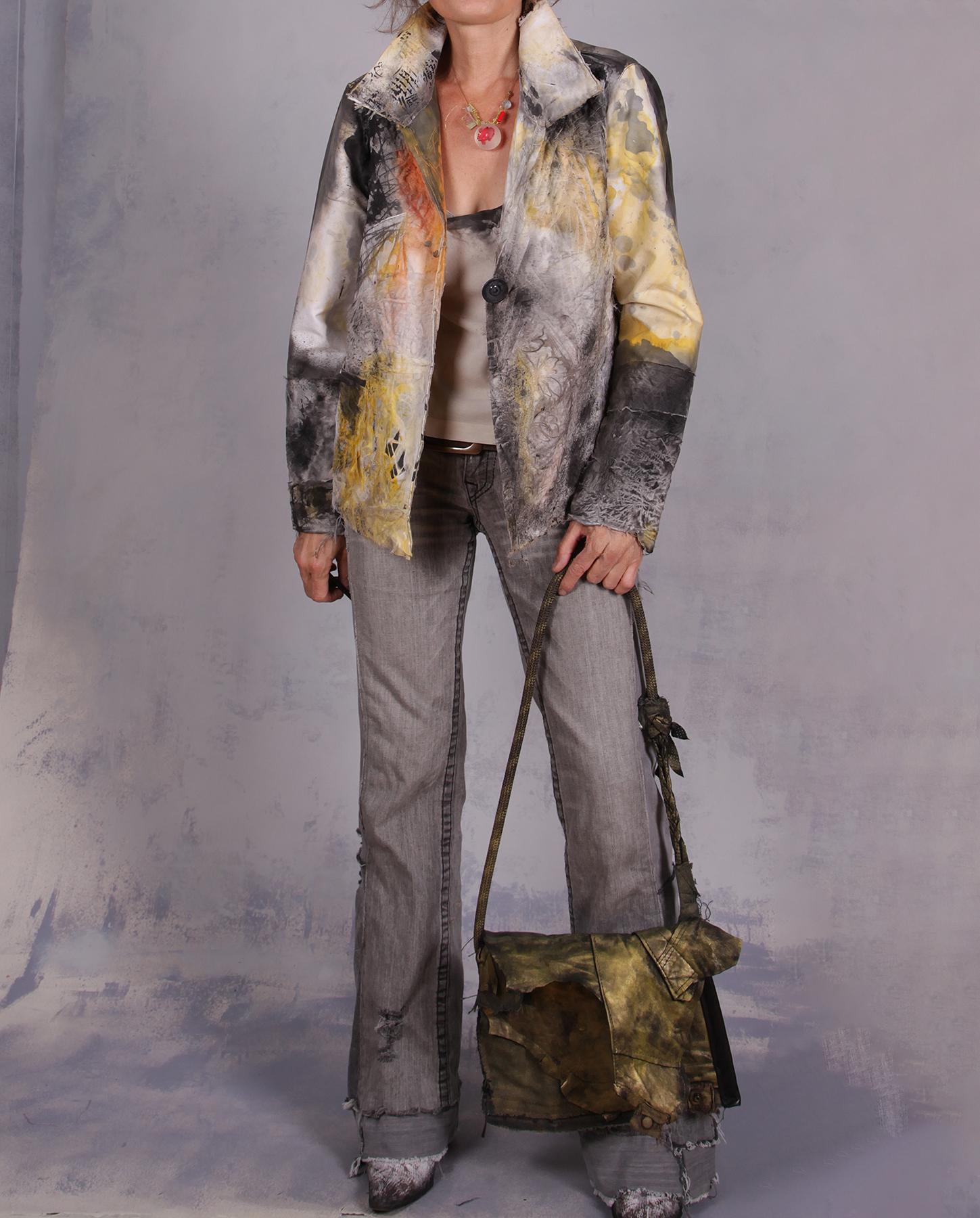 This one-of-a-kind jacket is an urban high-fashion statement that serves as a wearable canvas for the artist’s most complex studio techniques. The unique design is defined by a sophisticated, hand-worked topography where many signature processes—including intricate appliqué, distressing, hand-painting, embroidery and mixed-fabric paneling—create a rugged yet refined piece. An ode to texture, the piece features a beautifully balanced hand-painted watercolor palette of charcoal, soft yellow, gray and ochre, all partially obscured by a delicate, veil-like layer of fine mixed silks that adds mysterious depth, with some spots of the underlying design literally 'peaking through'. Meticulous hand-detailing is visible in the raw, frayed edging and the artisanal collar, while the comfortable, structured silhouette ensures ease of wear. This unique piece balances with utmost ease a raw, "under the surface" aesthetic with modern, avant-garde elegance. It is also lightweight, comfortable, easy-care and non-wrinkling, making it a perfect take-along on trips. Will work for a range of sizes, shown on small. Product code: E7377