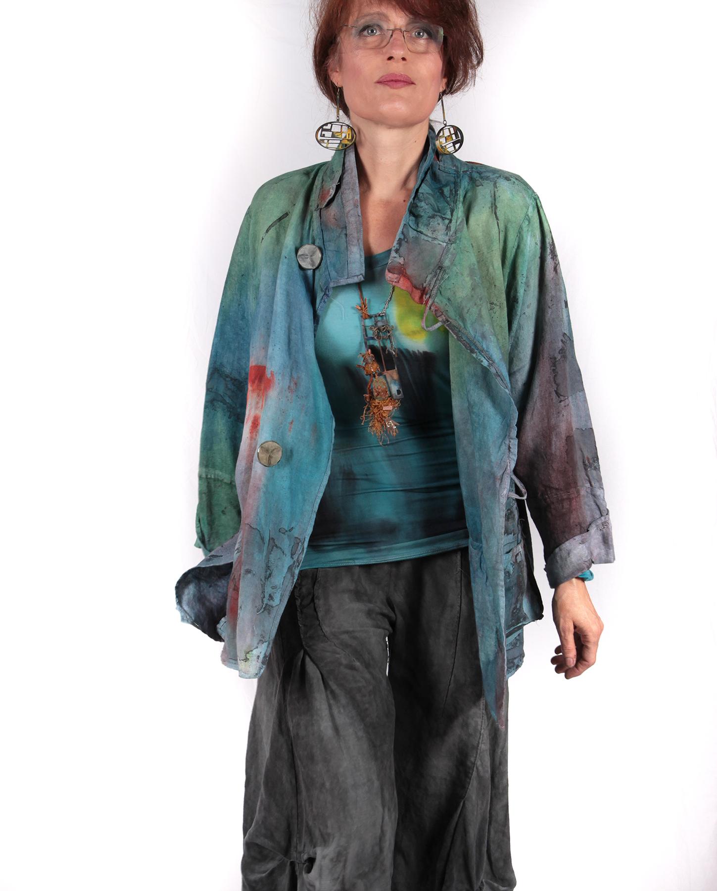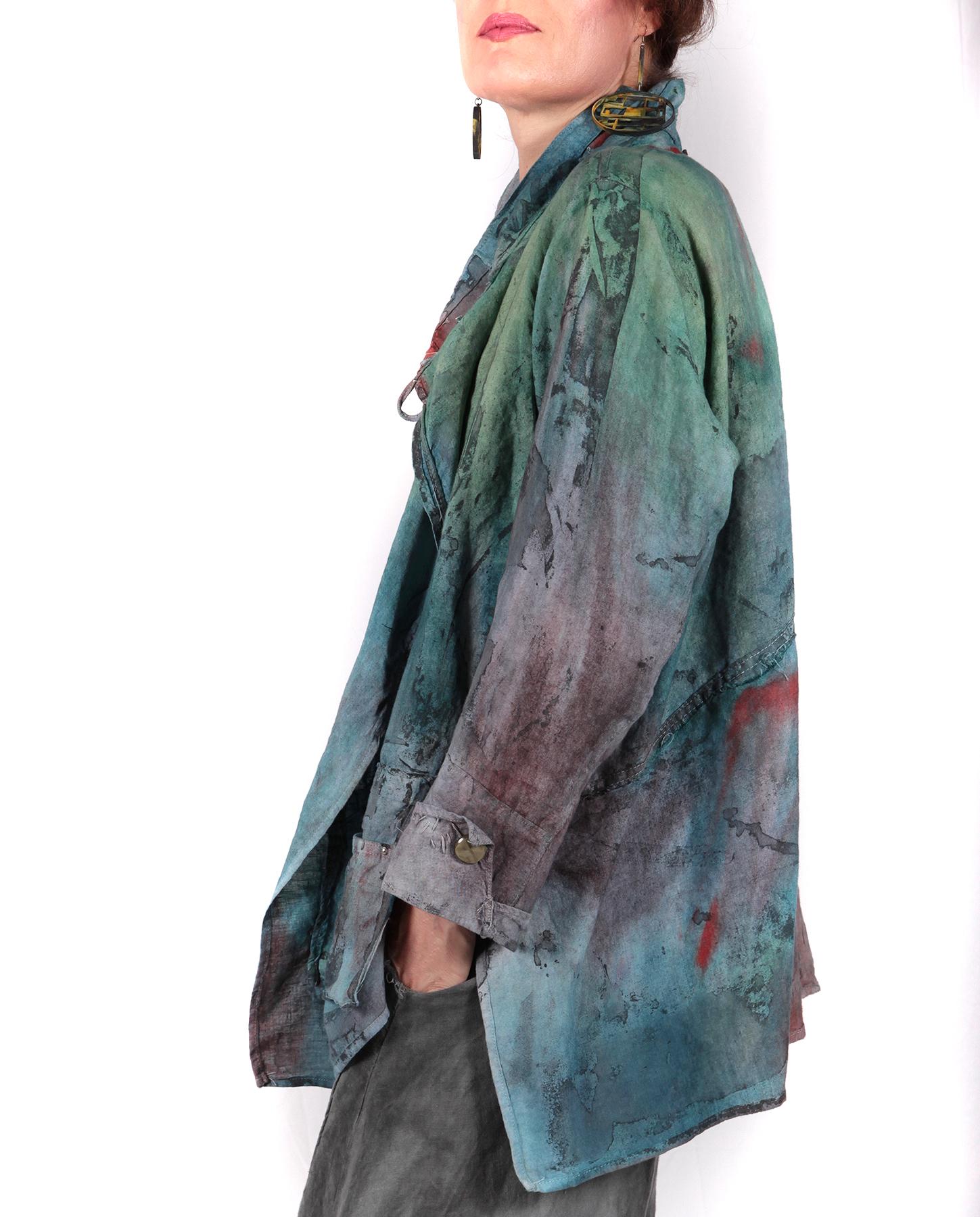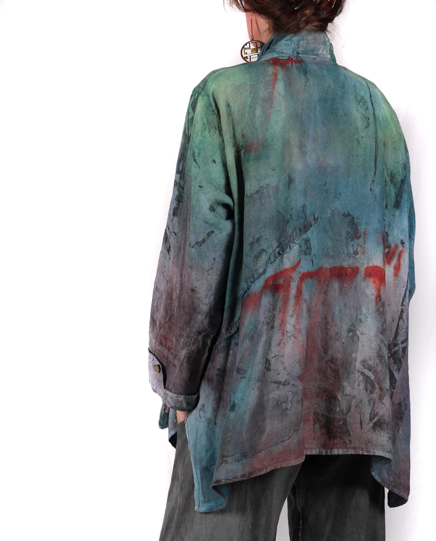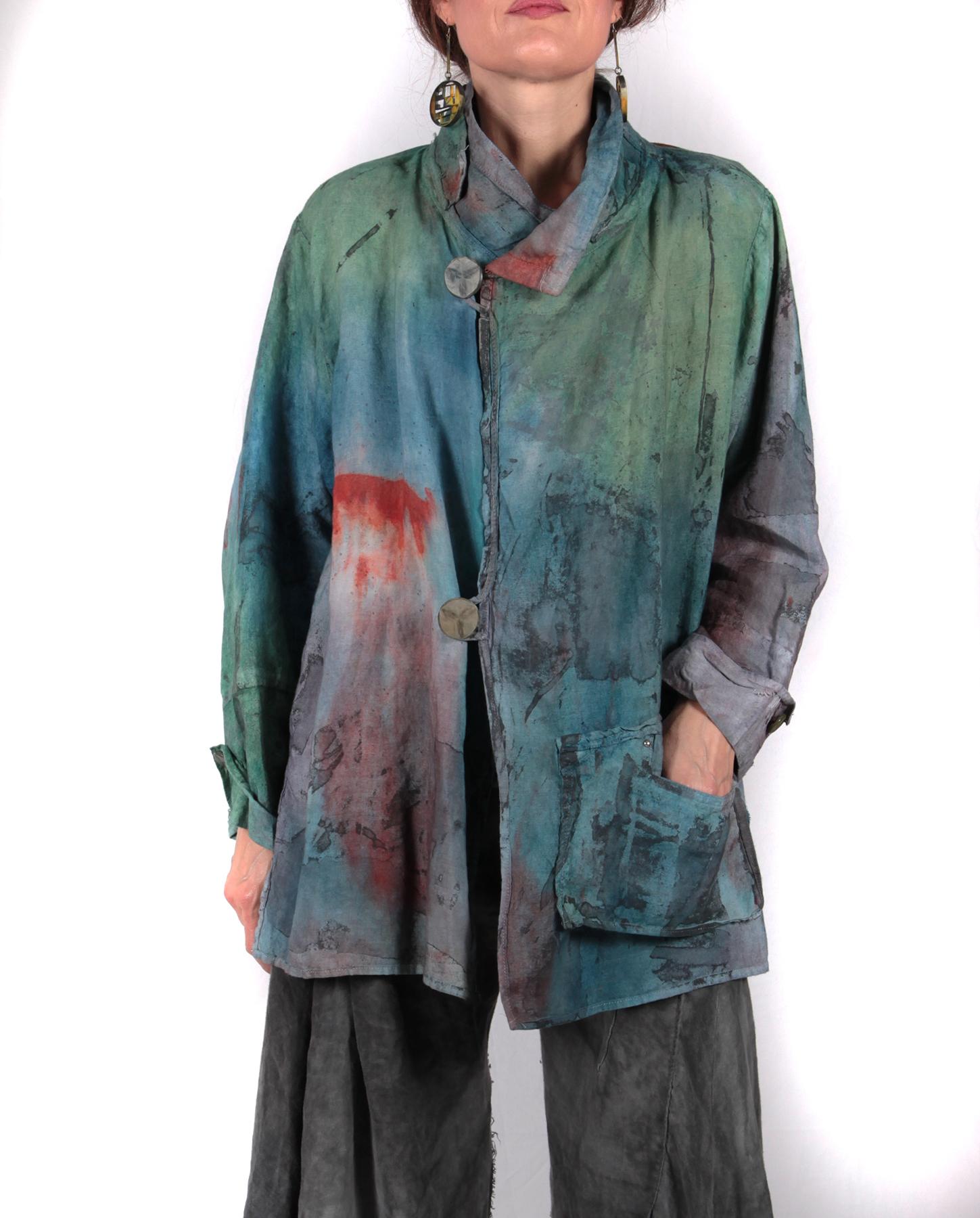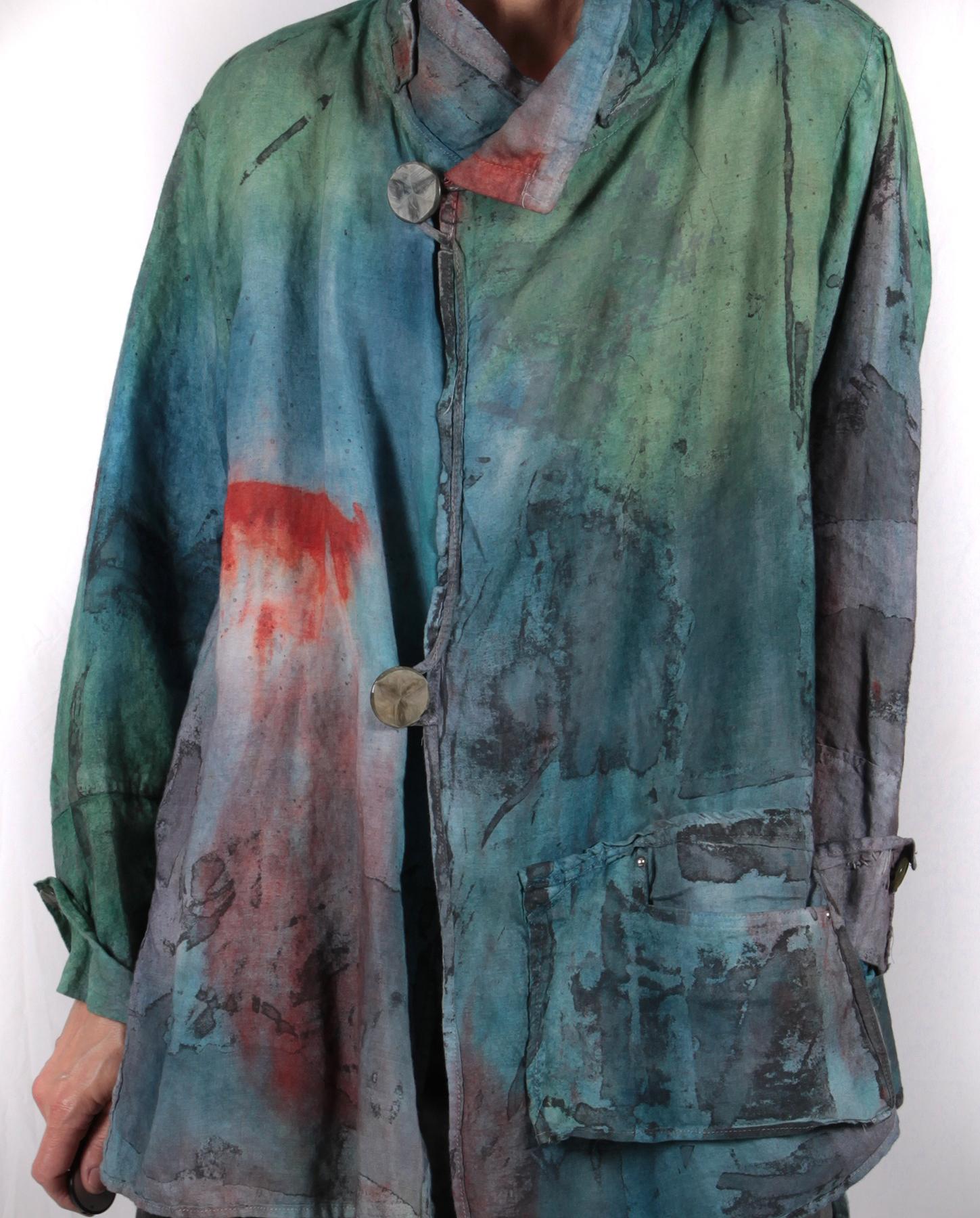 Slight A-line, vents on sides, slightly asymmetrical bottom, two-button front closure, buttons on cuffs, hand-painted, hand-printed.