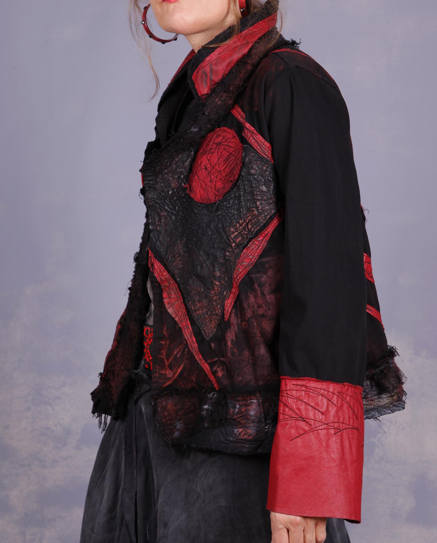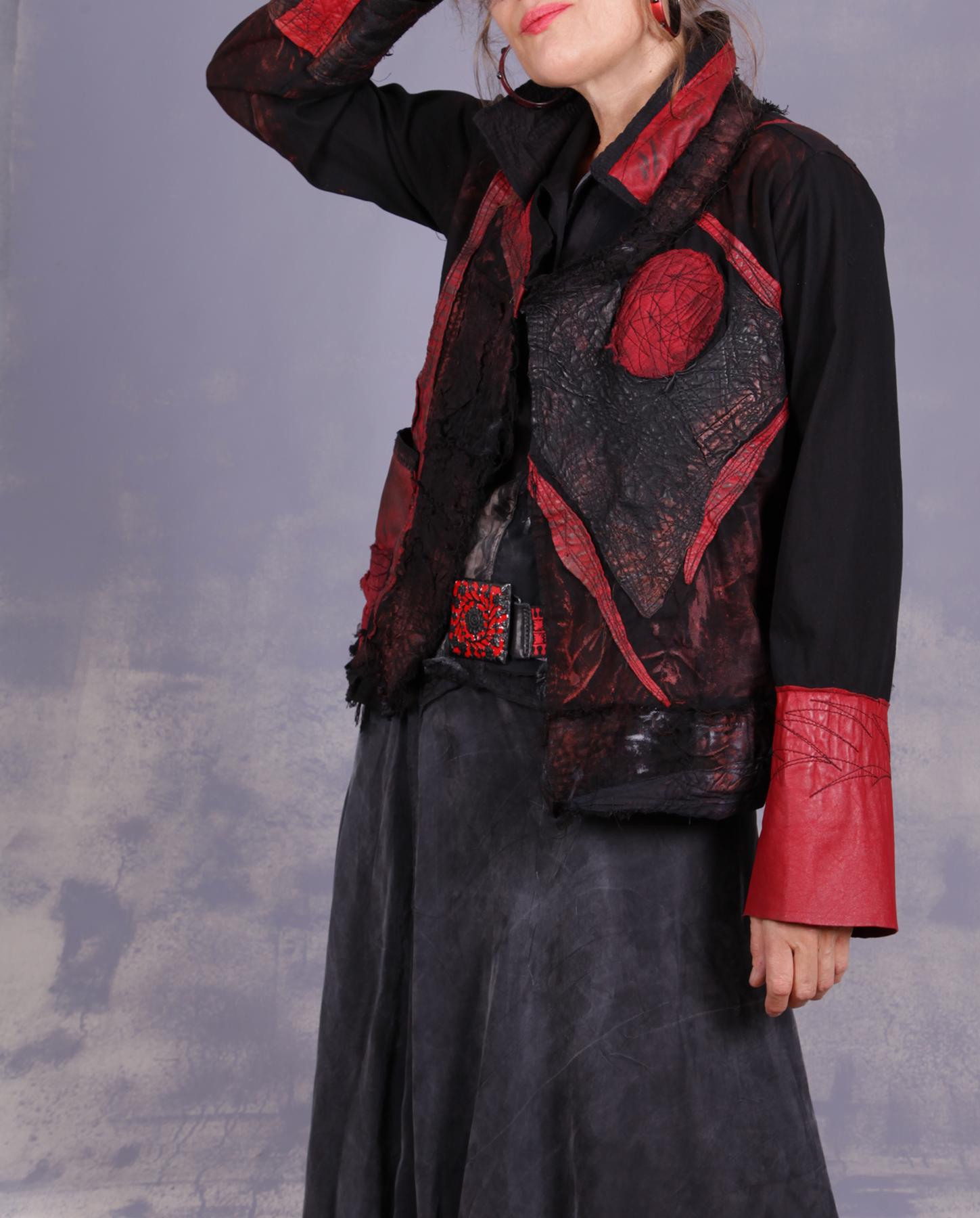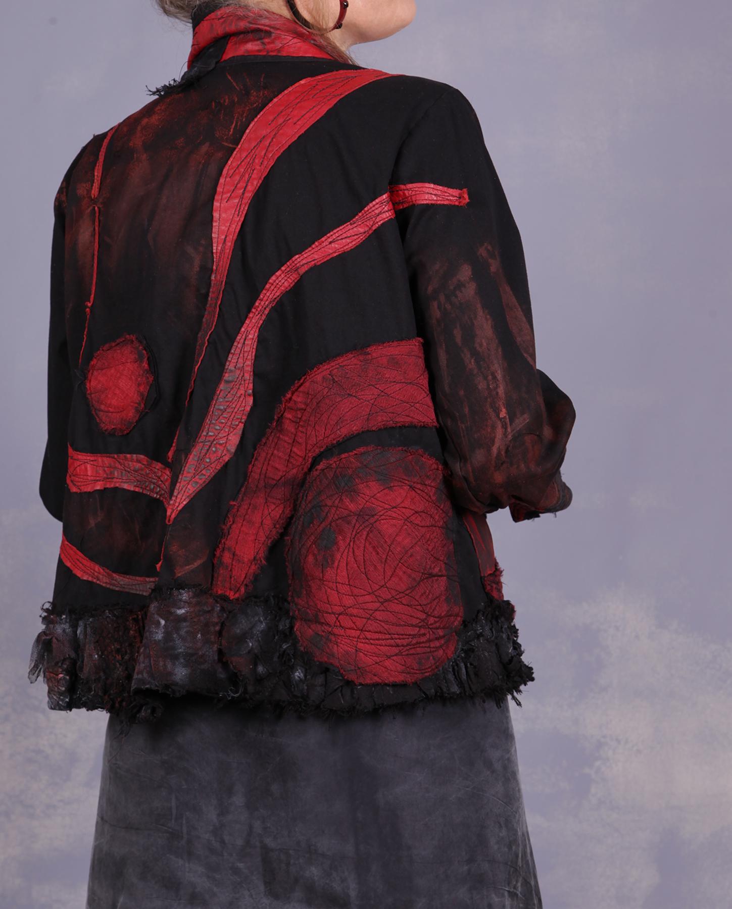 Few color combinations are as dramatic and classic as black and red - add to them half-tones, and you got yourself a timeless work of art you can wear. This jacket has it all: striking colors, lots of different hand-made textures, applique, mixed natural fabrics, from cotton to silk and leather, quilting, and much more. It is both elegant and very contemporary, with signature raw edging and surface treatment. The base fabric has a bit of stretch to it, assuring a comfortable fit. You will enjoy discovering the many nuances for yourself! Product code: F1056