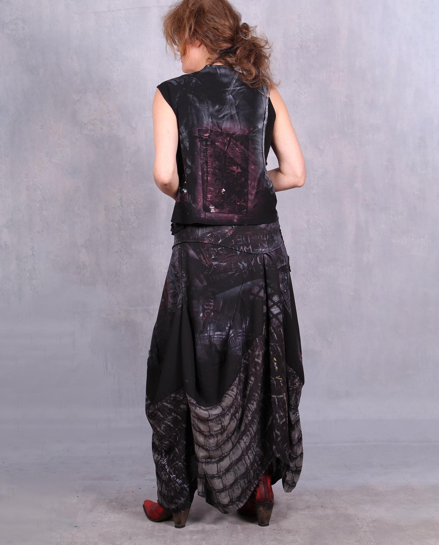 This knit viscose top has a pleasant heavier weight which makes for a wonderful drape and a comfortable feel. Meant as an overlay, it has a front flap, asymmetrical construction and a large opening on one of the sides (see pictures). Hand-painted and printed with touch of bright colors on the theme of the alphabet. Layer it over black or over other colors, over camisoles, other tops or dresses - anything will work well with this design. Product code: Z3286