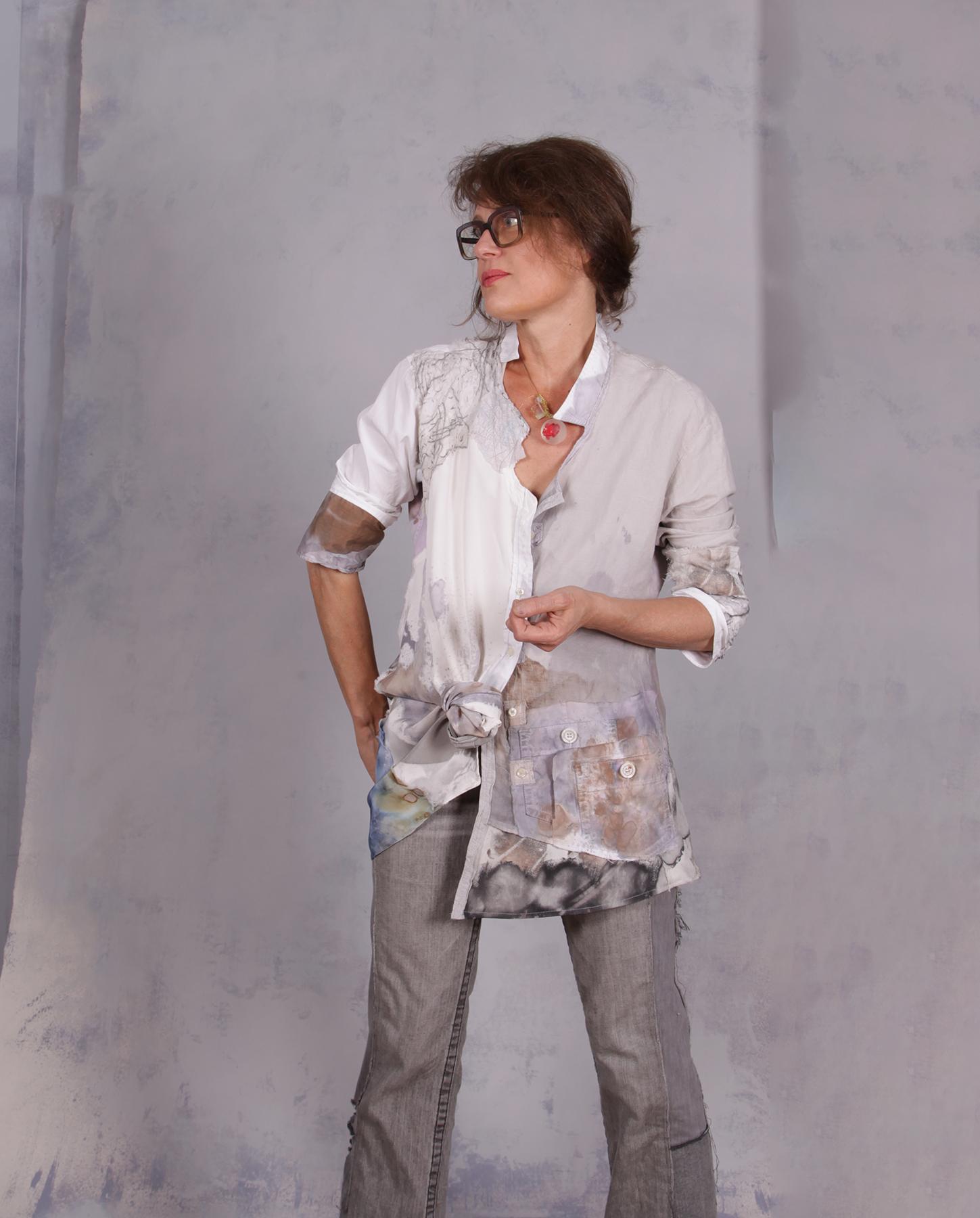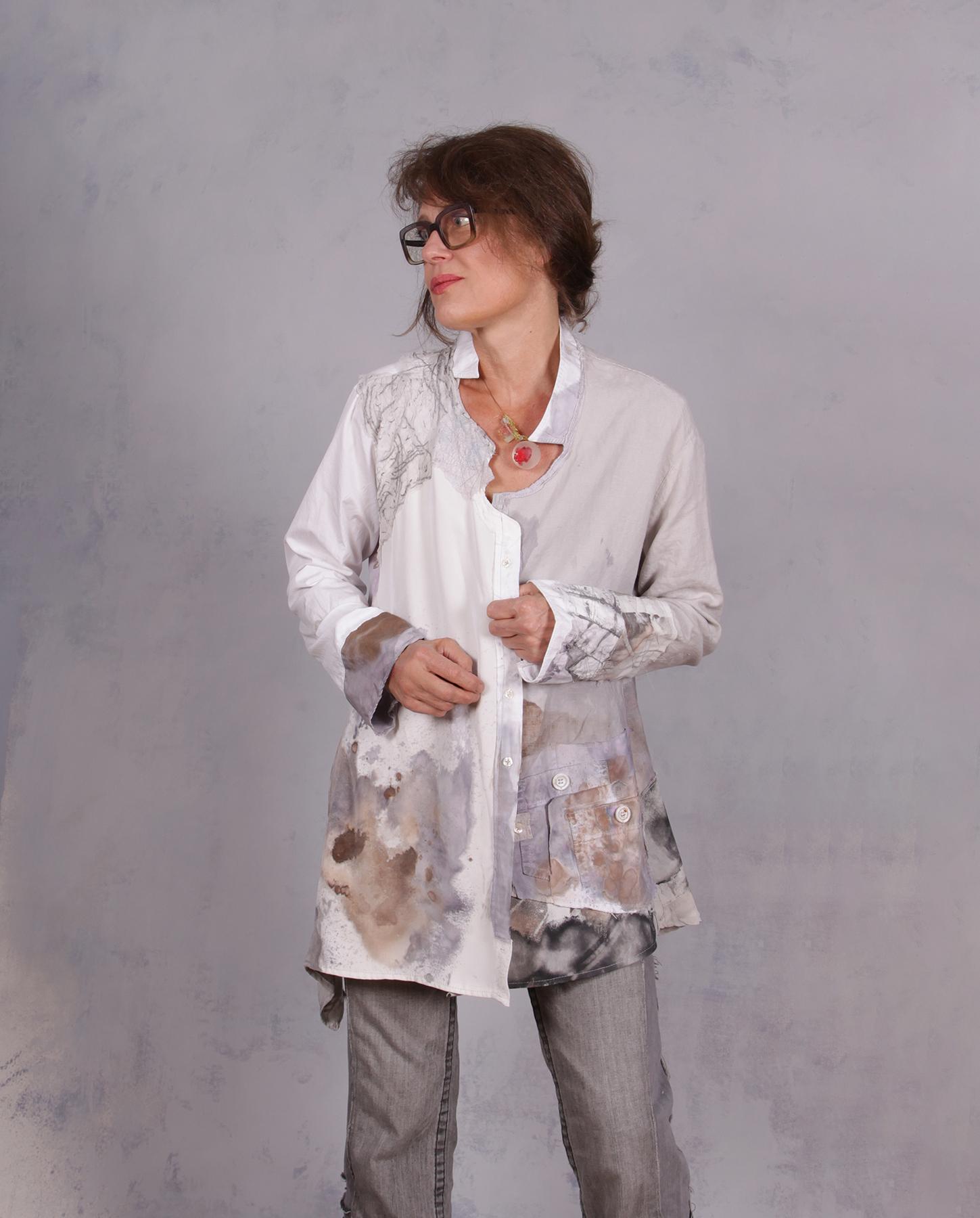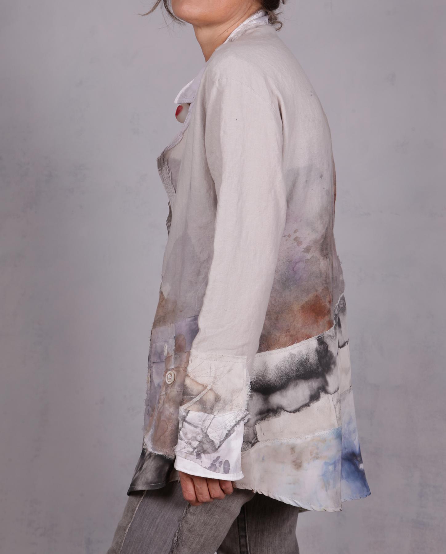 This one-of-a-kind garment features asymmetrical architecture, including a slanted button-down closure designed to transition effortlessly from a sophisticated tunic to a lightweight jacket. The design is a textural journey, showcasing many signature processes of the artist through a complex mix of fabrics and meticulously executed hand-detailing. Its unique, hand-painted watercolor design flows across the comfortable, relaxed silhouette. An unusual modern collar and a signature faux pocket provide conceptual, artsy detailing that elevates the piece into a true wearable work of art. Every inch reveals the amount of detailed work involved, resulting in a unique design that is as comfortable as it is avant-garde. The mixed fabrics represent a trip through natural fibers, from fine silk to silk crepe, long-staple cotton and European flax linen. If you want to give it even more edge, tied it on one of the ends (shown) for even more asymmetry and more of an urban look. Product code: U0221