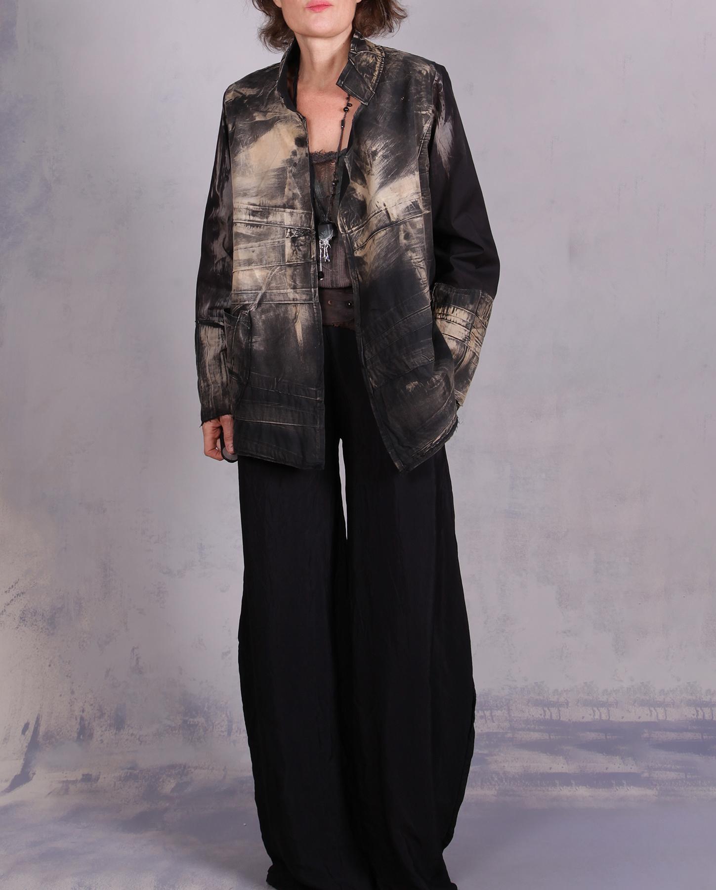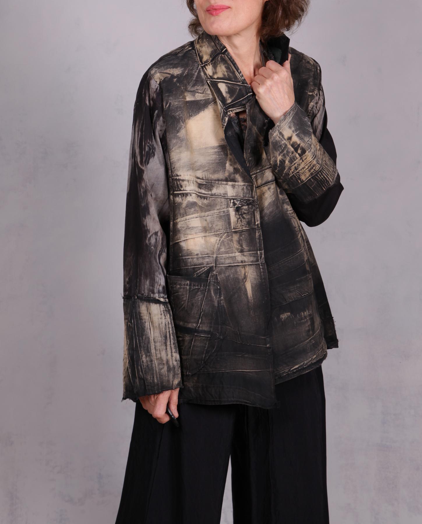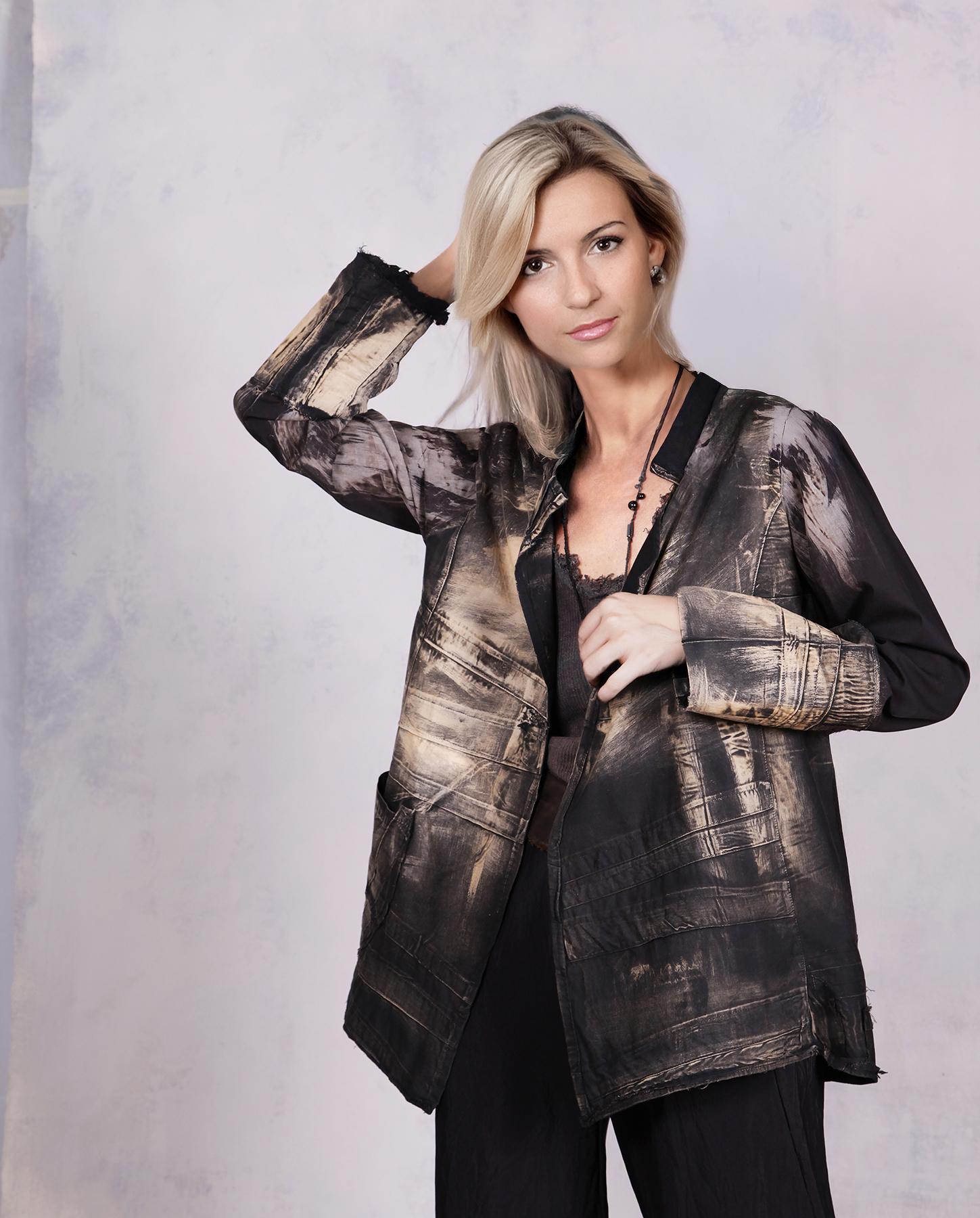 If you like black and neutral shades, and want a go-with-everything lightweight jacket for travel and warmer months, this one is a perfect candidate. Made out of lightweight long-staple cotton, this unique creation features added texture like folds and pin tucks that give it visual movement and lots of depth, particularly combined with the contemporary raw edging. Shown as an open style, it can have a closure put in by request. You can roll up or pull up the sleeves, and a sculptural large pocket will be handy for a phone or a few other small items. The design will work well both true to size and as a slightly roomier piece, as shown here. Easy care and very lightweight, it would be great for your travel and cruising! Product code: H7793