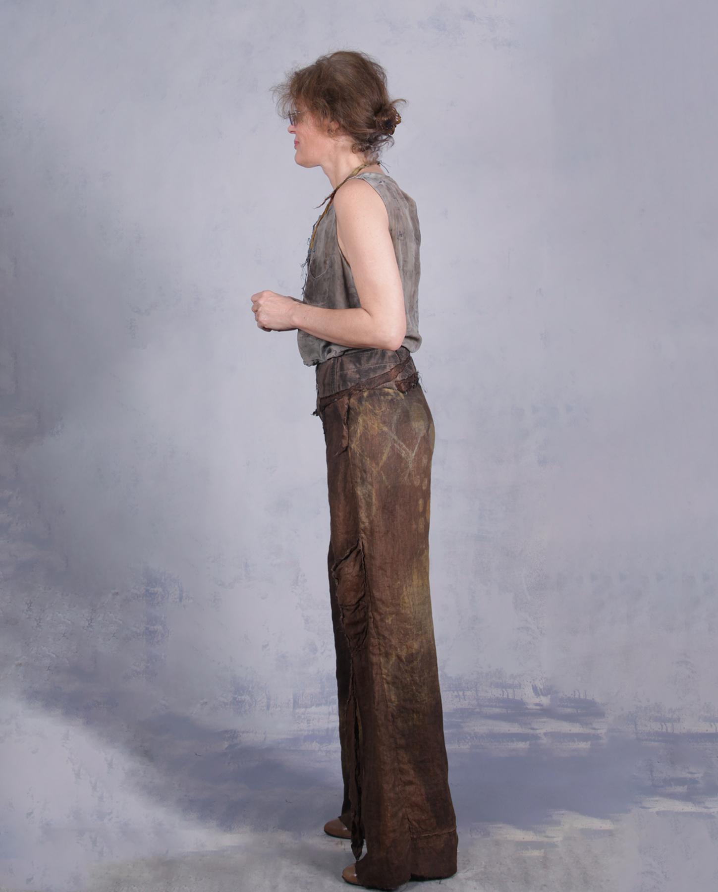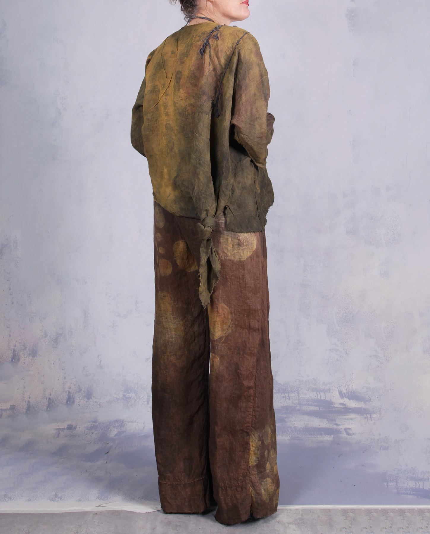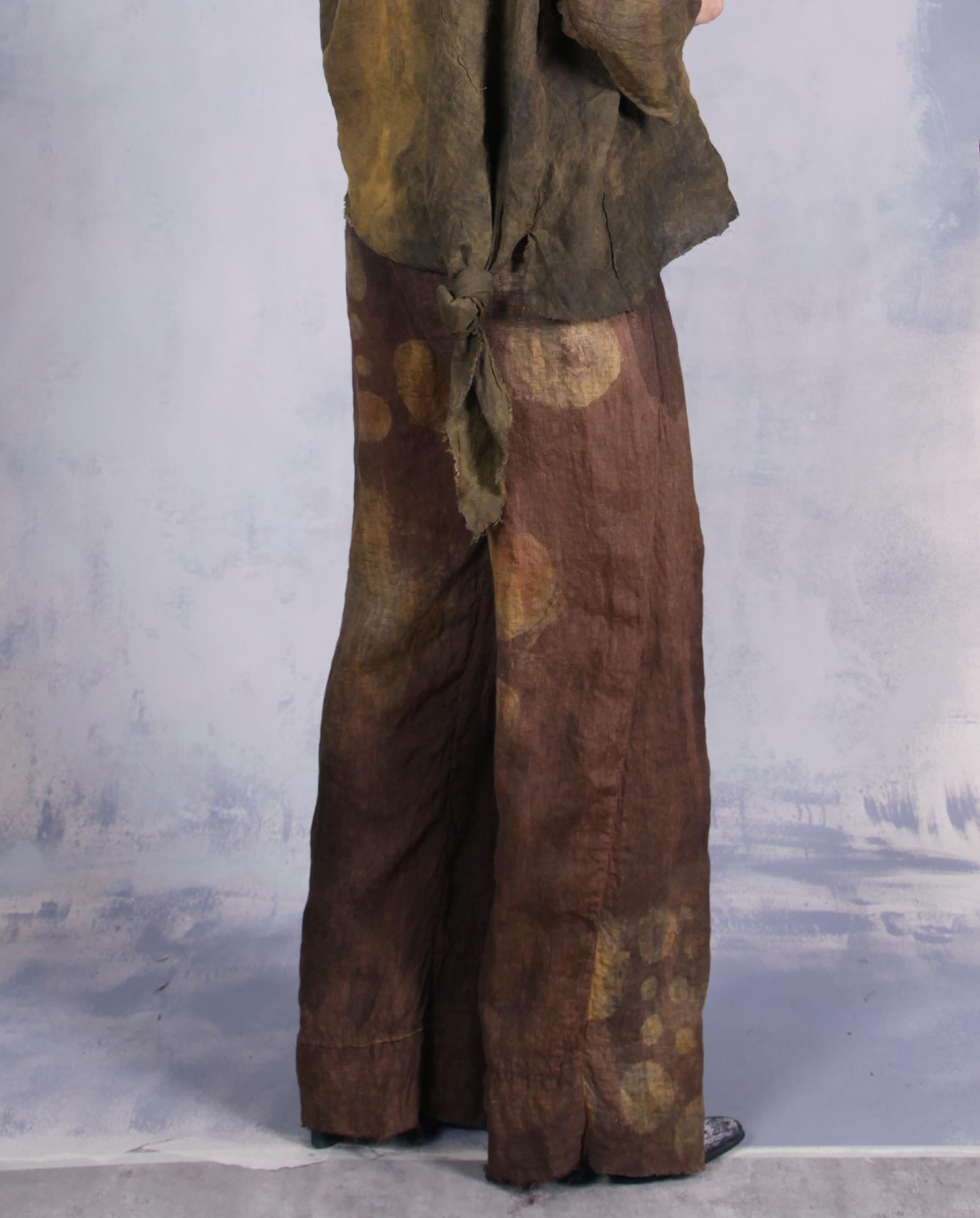 What a fun pair of pants these are! A true flight of imagination. They are incredible in person in terms of the texture and depth of color, which has many variations upclose - not something you can truly feel in pictures. The top mimics classic trousers, with two large loops in the front to accommodate a belt, detailed in back. For ultimate fun, the artist added hand-painted circles throughout, making these artistic pants even more unique. A signature pocket placed lower on the leg completes the modern artsy look. Product code: L5808