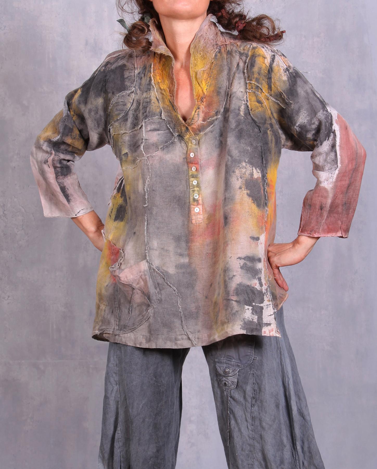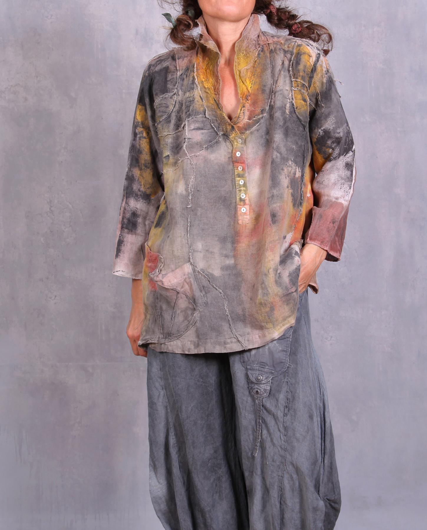 The distressed colors of this blouse are what makes it stand out - they are bright hues yet subdued with the artist's special signature distressing technique. Loose and comfortable, the blouse features wispy edge hand-textured silk collar an textured appliqué around the shoulder area. A row of buttons and asymmetrical design complete this wearable art piece. Product code: H0265