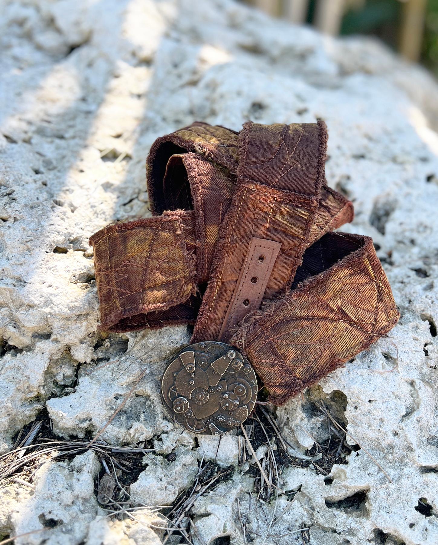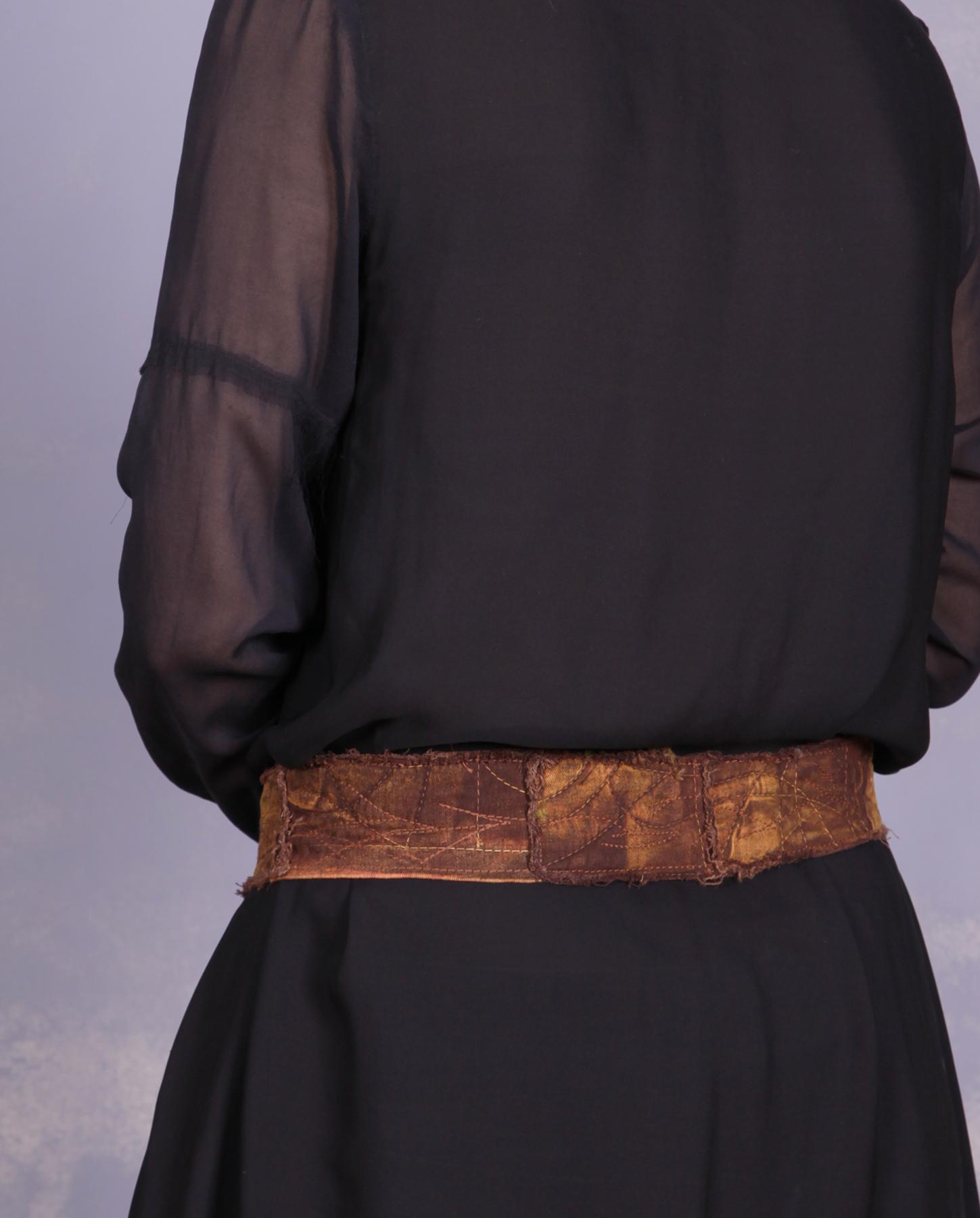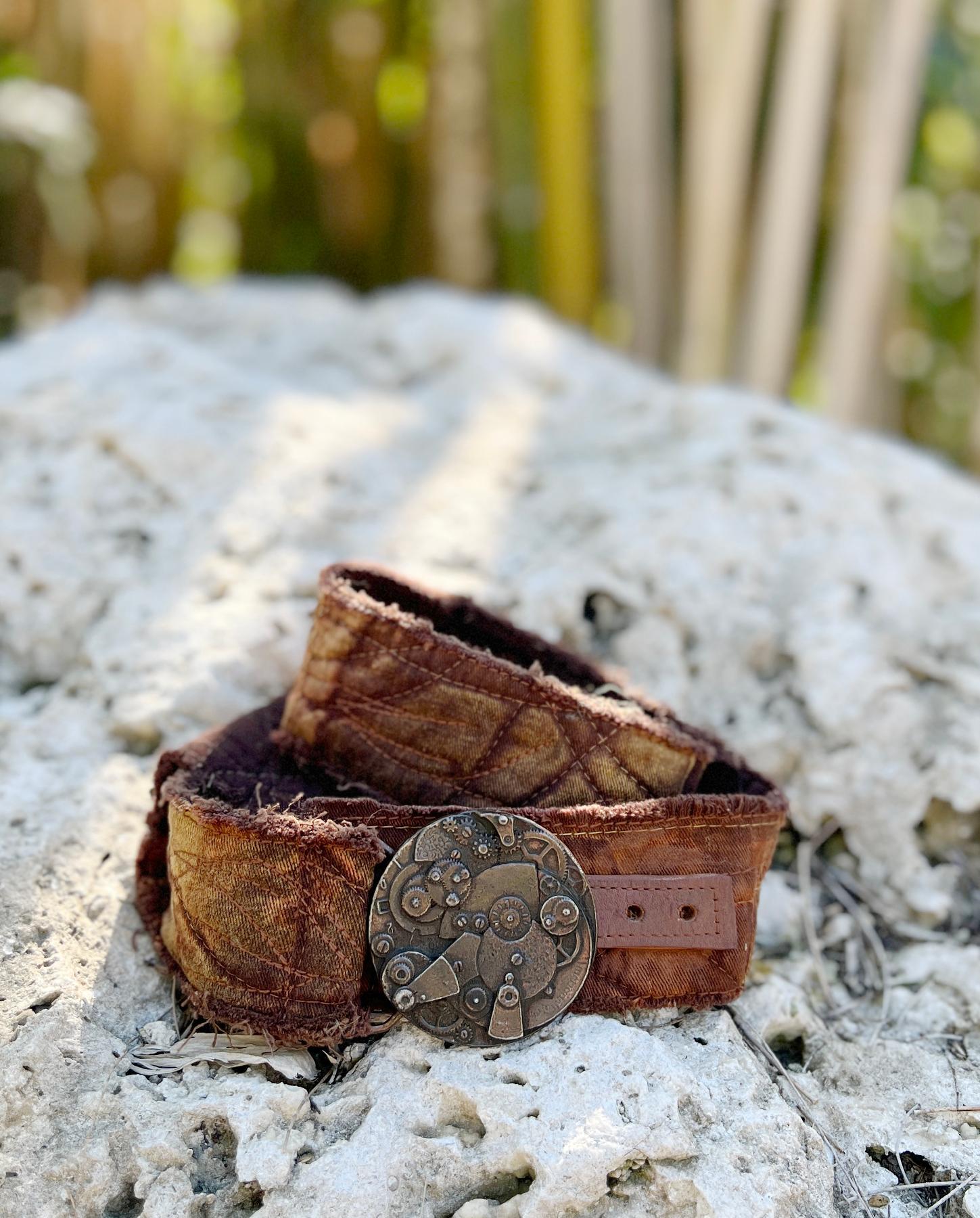 This art belt features the artist's favorite fiber technique of distressing and overstitching with a bit of rough edging. Made out of soft organic cotton with a leather piece, triple layer, it is flexible, adjustable anyway and has plenty of room built-in to fit literally any size and length you need - just let us know how long you would like it to be. A vintage brass buckle with a time mechanism design is a perfect finish for this fun piece. Wear it through loops, on the hips or on the waist - lots of different options. Product code: W9044