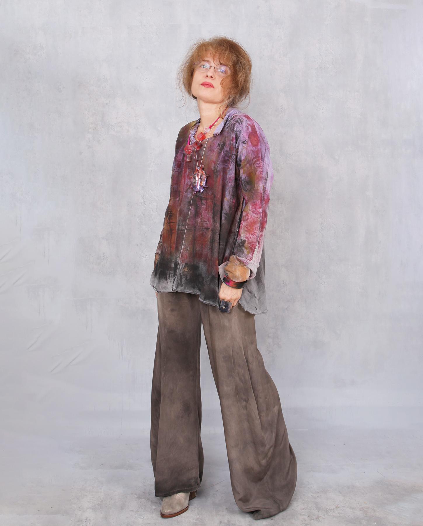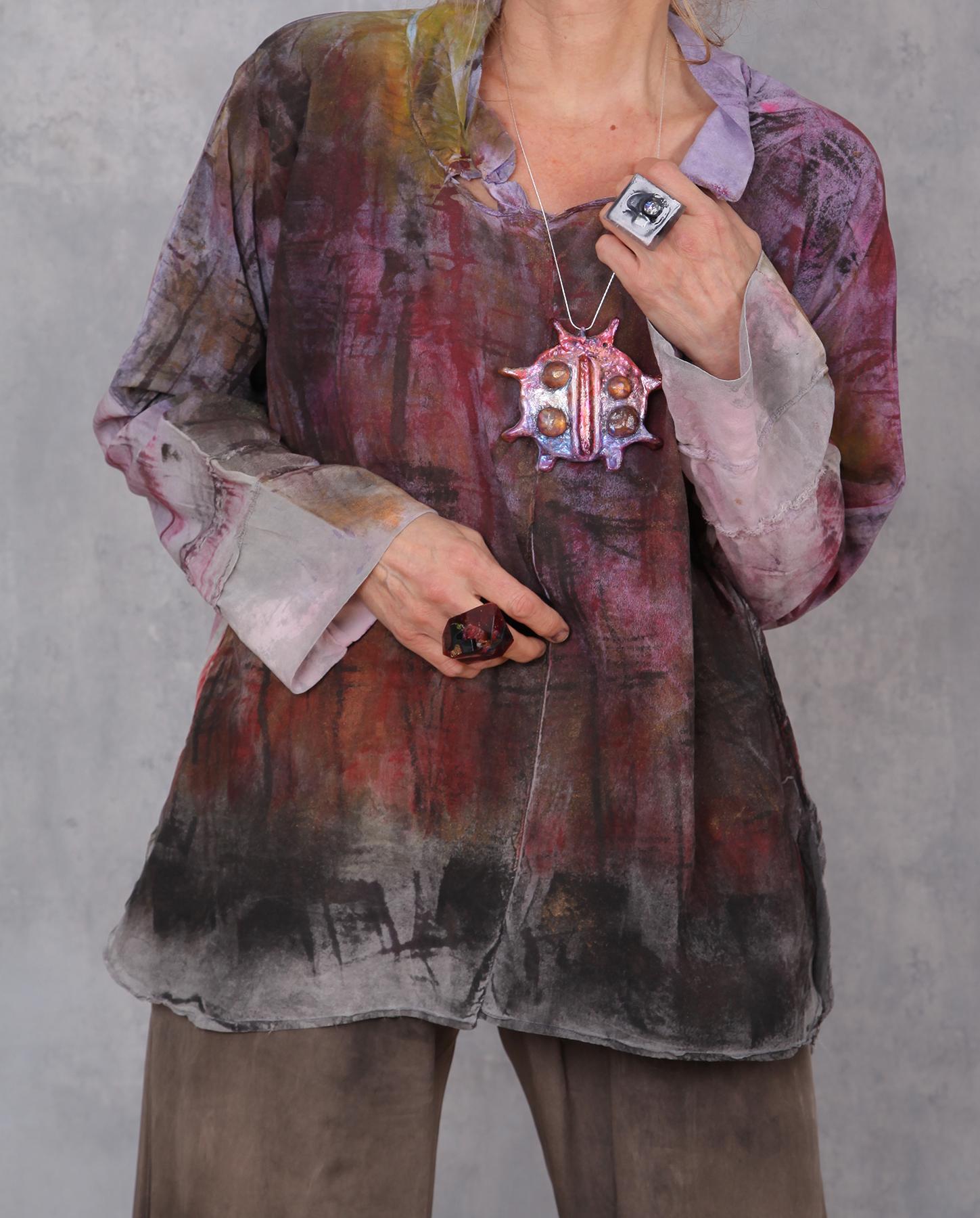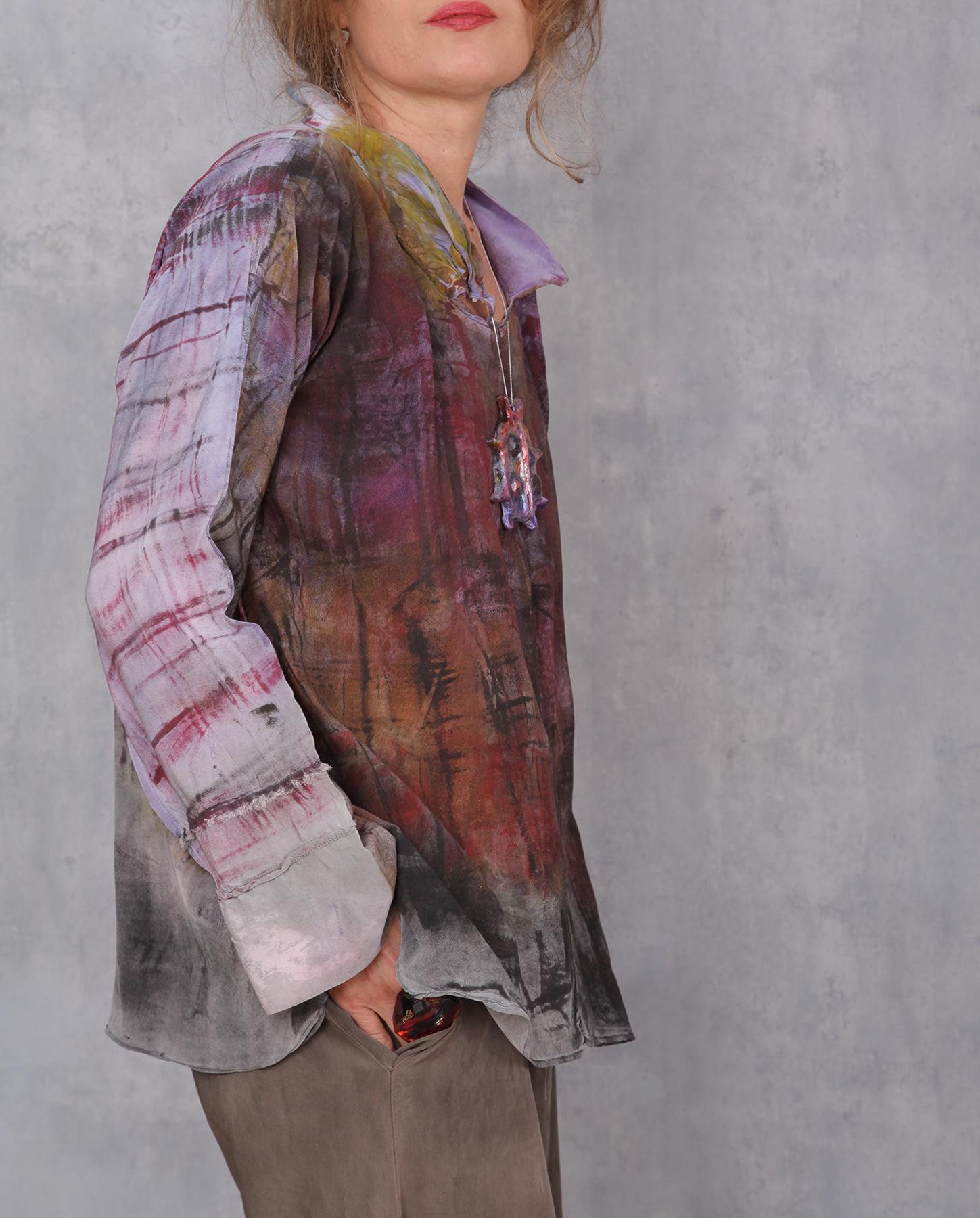 With its mixed colors, mixed patterns and loose design, this blouse gives off a playful and relaxed feel. Unusual asymmetrical collar, raglan sleeves and rounded bottom with small vents on sides add to the casual feel of it. Despite the seemingly bold colors, it is a great match to a variety of other colors and looks. Lightweight, with a nice drape, made out of silk crepe, with a little bit of sparkle in the painted design. Product code: U3500