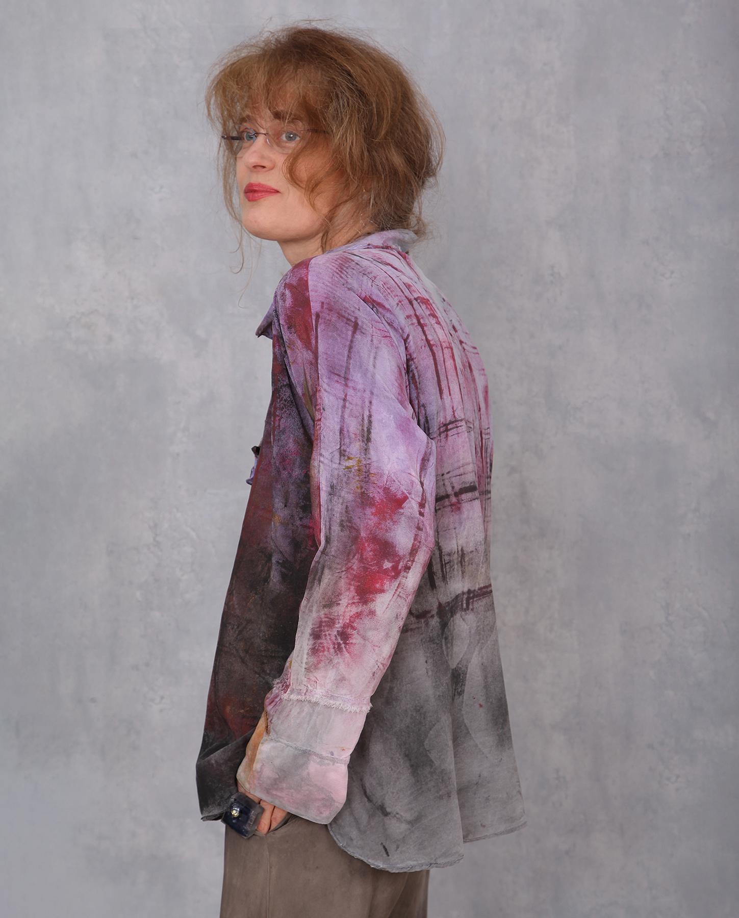 Raglan sleeves, loose-fitting design, small vents on sides, rounded bottom, asymmetrical collar, hand-painted.